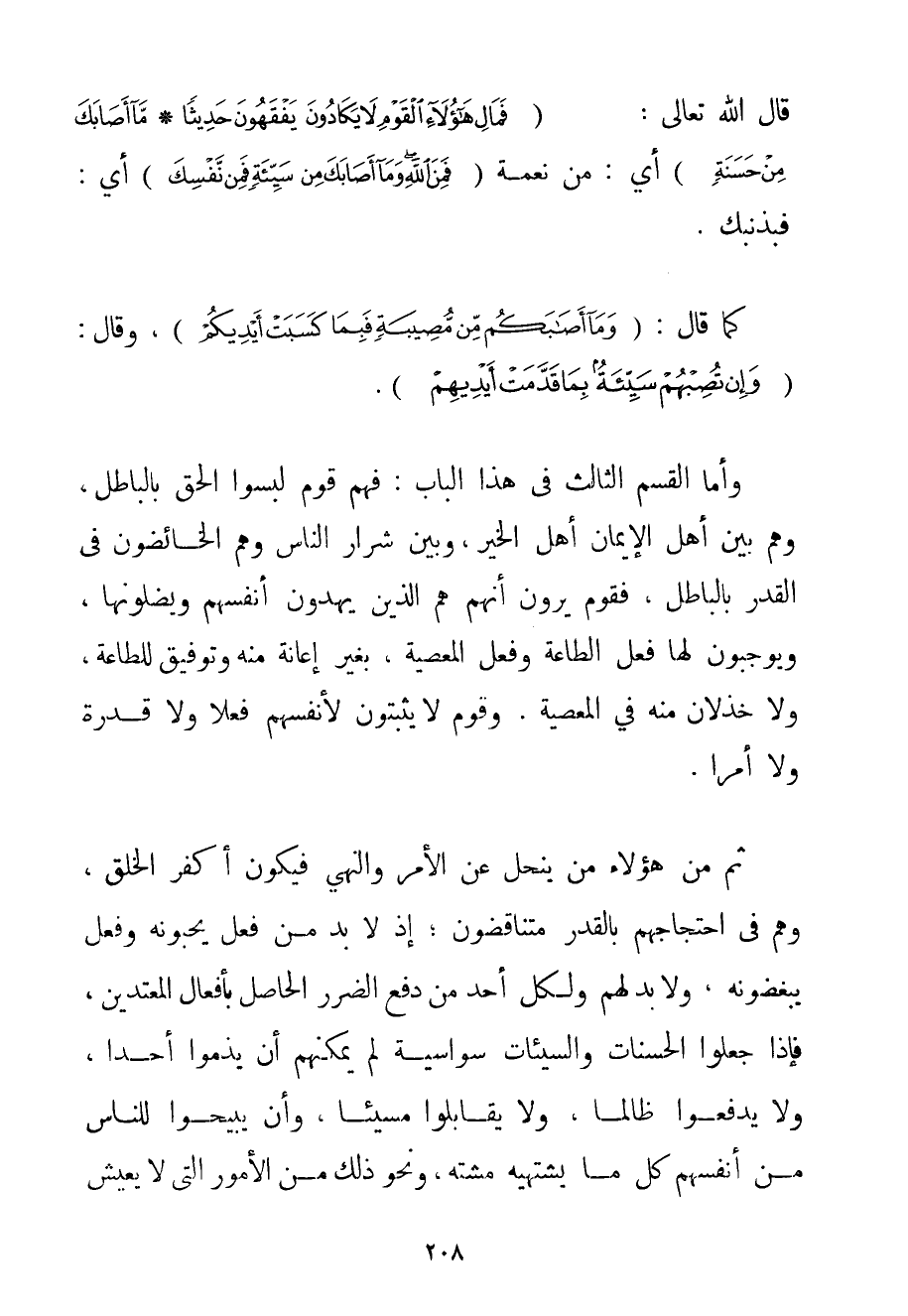 قَالَ اللَّهُ تَعَالَى: {فَمَالِ هَؤُلَاءِ الْقَوْمِ لَا يَكَادُونَ يَفْقَهُونَ حَدِيثًا} {مَا أَصَابَكَ مِنْ حَسَنَةٍ} أَيْ: مِنْ نِعْمَةٍ {فَمِنَ اللَّهِ وَمَا أَصَابَكَ مِنْ سَيِّئَةٍ فَمِنْ نَفْسِكَ} أَيْ: فَبِذَنْبِك. كَمَا قَالَ: {وَمَا أَصَابَكُمْ مِنْ مُصِيبَةٍ فَبِمَا كَسَبَتْ أَيْدِيكُمْ} وَقَالَ: {وَإِنْ تُصِبْهُمْ سَيِّئَةٌ بِمَا قَدَّمَتْ أَيْدِيهِمْ} . وَأَمَّا الْقِسْمُ الثَّالِثُ فِي هَذَا الْبَابِ: فَهُمْ قَوْمٌ لَبَّسُوا الْحَقَّ بِالْبَاطِلِ وَهُمْ بَيْنَ أَهْلِ الْإِيمَانِ أَهْلِ الْخَيْرِ وَبَيْنَ شِرَارِ النَّاسِ وَهُمْ الْخَائِضُونَ فِي الْقَدَرِ بِالْبَاطِلِ فَقَوْمٌ يَرَوْنَ أَنَّهُمْ هُمْ الَّذِينَ يَهْدُونَ أَنْفُسَهُمْ وَيُضِلُّونَهَا وَيُوجِبُونَ لَهَا فِعْلَ الطَّاعَةِ وَفِعْلَ الْمَعْصِيَةِ بِغَيْرِ إعَانَةٍ مِنْهُ وَتَوْفِيقٍ لِلطَّاعَةِ وَلَا خِذْلَانٍ مِنْهُ فِي الْمَعْصِيَةِ. وَقَوْمٌ لَا يُثْبِتُونَ لِأَنْفُسِهِمْ فِعْلًا وَلَا قُدْرَةً وَلَا أَمْرًا. ثُمَّ مِنْ هَؤُلَاءِ مَنْ يَنْحَلُّ عَنْ الْأَمْرِ وَالنَّهْيِ فَيَكُونُ أَكْفَرَ الْخَلْقِ وَهُمْ فِي احْتِجَاجِهِمْ بِالْقَدَرِ مُتَنَاقِضُونَ؛ إذْ لَا بُدَّ مِنْ فِعْلٍ يُحِبُّونَهُ وَفِعْلٍ يُبْغِضُونَهُ وَلَا بُدَّ لَهُمْ وَلِكُلِّ أَحَدٍ مِنْ دَفْعِ الضَّرَرِ الْحَاصِلِ بِأَفْعَالِ الْمُعْتَدِينَ فَإِذَا جَعَلُوا الْحَسَنَاتِ وَالسَّيِّئَاتِ سَوَاسِيَةً لَمْ يُمْكِنْهُمْ أَنْ يَذُمُّوا أَحَدًا وَلَا يَدْفَعُوا ظَالِمًا وَلَا يُقَابِلُوا مُسِيئًا وَإِنْ يُبِيحُوا لِلنَّاسِ مِنْ أَنْفُسِهِمْ كُلَّ مَا يَشْتَهِيهِ مُشْتَهٍ وَنَحْوُ ذَلِكَ مِنْ الْأُمُورِ الَّتِي لَا يَعِيشُ