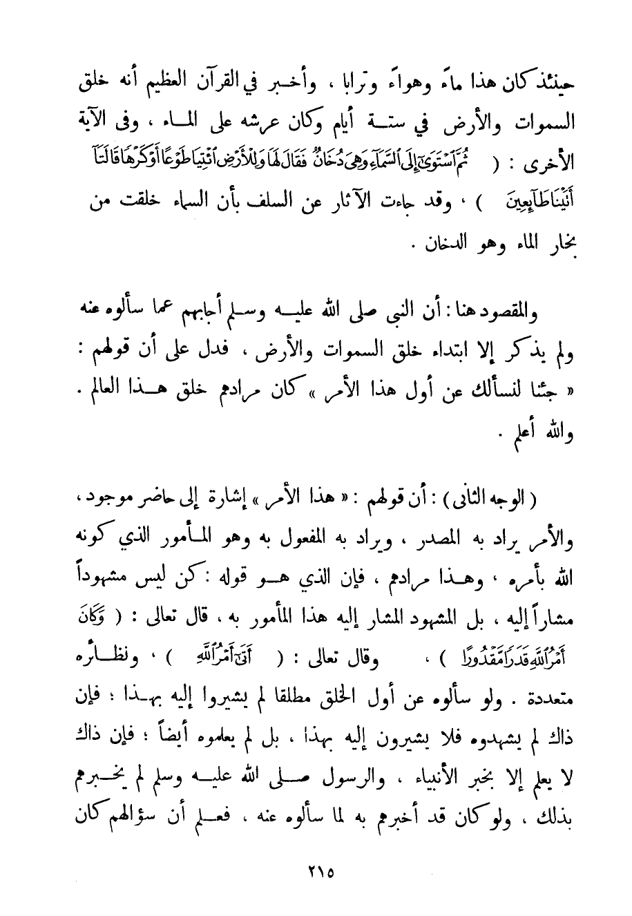 الْوَجْهُ الثَّانِي: أَنَّ قَوْلَهُمْ: " هَذَا الْأَمْرِ " إشَارَةٌ إلَى حَاضِرٍ مَوْجُودٍ وَالْأَمْرُ يُرَادُ بِهِ الْمَصْدَرُ وَيُرَادُ بِهِ الْمَفْعُولُ بِهِ وَهُوَ الْمَأْمُورُ الَّذِي كَوَّنَهُ اللَّهُ بِأَمْرِهِ وَهَذَا مُرَادُهُمْ فَإِنَّ الَّذِي هُوَ قَوْلُهُ: كُنْ لَيْسَ مَشْهُودًا مُشَارًا إلَيْهِ بَلْ الْمَشْهُودُ الْمُشَارُ إلَيْهِ هَذَا الْمَأْمُورُ بِهِ قَالَ تَعَالَى: {وَكَانَ أَمْرُ اللَّهِ قَدَرًا مَقْدُورًا} وَقَالَ تَعَالَى: {أَتَى أَمْرُ اللَّهِ} وَنَظَائِرُهُ مُتَعَدِّدَةٌ. وَلَوْ سَأَلُوهُ عَنْ أَوَّلِ الْخَلْقِ مُطْلَقًا لَمْ يُشِيرُوا إلَيْهِ بِهَذَا؛ فَإِنَّ ذَاكَ لَمْ يَشْهَدُوهُ. فَلَا يُشِيرُونَ إلَيْهِ بِهَذَا بَلْ لَمْ يَعْلَمُوهُ أَيْضًا؛ فَإِنَّ ذَاكَ لَا يُعْلَمُ إلَّا بِخَبَرِ الْأَنْبِيَاءِ وَالرَّسُولُ صَلَّى اللَّهُ عَلَيْهِ وَسَلَّمَ لَمْ يُخْبِرْهُمْ بِذَلِكَ وَلَوْ كَانَ قَدْ أَخْبَرَهُمْ بِهِ لَمَا سَأَلُوهُ عَنْهُ فَعُلِمَ أَنَّ سُؤَالَهُمْ كَانَ