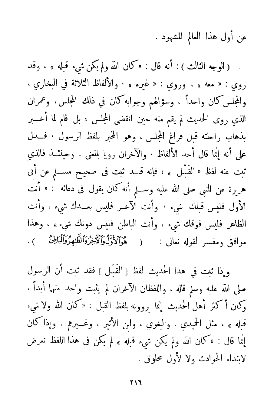 الْوَجْهُ الثَّالِثُ: أَنَّهُ قَالَ: " {كَانَ اللَّهُ وَلَمْ يَكُنْ شَيْءٌ قَبْلَهُ} " وَقَدْ رُوِيَ: " مَعَهُ " وَرُوِيَ: " غَيْرُهُ " وَالْأَلْفَاظُ الثَّلَاثَةُ فِي الْبُخَارِيِّ وَالْمَجْلِسُ كَانَ وَاحِدًا وَسُؤَالُهُمْ وَجَوَابُهُ كَانَ فِي ذَلِكَ الْمَجْلِسِ وَعِمْرَانُ الَّذِي رَوَى الْحَدِيثَ لَمْ يَقُمْ مِنْهُ حِينَ انْقَضَى الْمَجْلِسُ؛ بَلْ قَامَ لَمَّا أُخْبِرَ بِذَهَابِ رَاحِلَتِهِ قَبْلَ فَرَاغِ الْمَجْلِسِ وَهُوَ الْمُخْبِرُ بِلَفْظِ الرَّسُولِ فَدَلَّ عَلَى أَنَّهُ إنَّمَا قَالَ أَحَدُ الْأَلْفَاظِ وَالْآخَرَانِ رَوَيَا بِالْمَعْنَى. وَحِينَئِذٍ فَاَلَّذِي ثَبَتَ عَنْهُ لَفْظُ " الْقَبْلِ "؛ فَإِنَّهُ قَدْ ثَبَتَ فِي صَحِيحِ مُسْلِمٍ عَنْ أَبِي هُرَيْرَةَ عَنْ النَّبِيِّ صَلَّى اللَّهُ عَلَيْهِ وَسَلَّمَ أَنَّهُ كَانَ يَقُولُ فِي دُعَائِهِ: " {أَنْتَ الْأَوَّلُ فَلَيْسَ قَبْلَك شَيْءٌ وَأَنْتَ الْآخِرُ فَلَيْسَ بَعْدَك شَيْءٌ وَأَنْتَ الظَّاهِرُ فَلَيْسَ فَوْقَك شَيْءٌ وَأَنْتَ الْبَاطِنُ فَلَيْسَ دُونَك شَيْءٌ} " وَهَذَا مُوَافِقٌ وَمُفَسِّرٌ لِقَوْلِهِ تَعَالَى {هُوَ الْأَوَّلُ وَالْآخِرُ وَالظَّاهِرُ وَالْبَاطِنُ} . وَإِذَا ثَبَتَ فِي هَذَا الْحَدِيثِ لَفْظُ الْقَبْلِ فَقَدْ ثَبَتَ أَنَّ الرَّسُولَ صَلَّى اللَّهُ عَلَيْهِ وَسَلَّمَ قَالَهُ، وَاللَّفْظَانِ الْآخَرَانِ لَمْ يَثْبُتْ وَاحِدٌ مِنْهُمَا أَبَدًا وَكَانَ أَكْثَرُ أَهْلِ الْحَدِيثِ إنَّمَا يَرْوُونَهُ بِلَفْظِ الْقَبْلِ: " {كَانَ اللَّهُ وَلَا شَيْءَ قَبْلَهُ} " مِثْلُ الحميدي والبغوي وَابْنُ الْأَثِيرِ وَغَيْرُهُمْ. وَإِذَا كَانَ إنَّمَا قَالَ: " {كَانَ اللَّهُ وَلَمْ يَكُنْ شَيْءٌ قَبْلَهُ} " لَمْ يَكُنْ فِي هَذَا اللَّفْظِ تَعَرُّضٌ لِابْتِدَاءِ الْحَوَادِثِ وَلَا لِأَوَّلِ مَخْلُوقٍ.