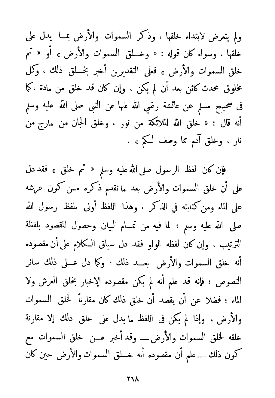 وَلَمْ يَتَعَرَّضْ لِابْتِدَاءِ خَلْقِهَا وَذَكَرَ السَّمَوَاتِ وَالْأَرْضَ بِمَا يَدُلُّ عَلَى خَلْقِهَا وَسَوَاءٌ كَانَ قَوْلُهُ: " وَخَلَقَ السَّمَوَاتِ وَالْأَرْضَ " أَوْ " ثُمَّ خَلَقَ السَّمَوَاتِ وَالْأَرْضَ " فَعَلَى التَّقْدِيرَيْنِ أَخْبَرَ بِخَلْقِ ذَلِكَ وَكُلُّ مَخْلُوقٍ مُحْدَثٌ كَائِنٌ بَعْدَ إنْ لَمْ يَكُنْ وَإِنْ كَانَ قَدْ خُلِقَ مِنْ مَادَّةٍ كَمَا فِي صَحِيحِ مُسْلِمٍ عَنْ عَائِشَةَ رَضِيَ اللَّهُ عَنْهَا عَنْ النَّبِيِّ صَلَّى اللَّهُ عَلَيْهِ وَسَلَّمَ أَنَّهُ قَالَ: " {خَلَقَ اللَّهُ الْمَلَائِكَةَ مِنْ نُورٍ وَخَلَقَ الْجَانَّ مِنْ مَارِجٍ مِنْ نَارٍ وَخَلَقَ آدَمَ مِمَّا وُصِفَ لَكُمْ} ". فَإِنْ كَانَ لَفْظُ الرَّسُولِ صَلَّى اللَّهُ عَلَيْهِ وَسَلَّمَ " ثُمَّ خَلَقَ " فَقَدْ دَلَّ عَلَى أَنَّ خَلْقَ السَّمَوَاتِ وَالْأَرْضِ بَعْدَ مَا تَقَدَّمَ ذَكَرَهُ مِنْ كَوْنِ عَرْشِهِ عَلَى الْمَاءِ وَمِنْ كِتَابَتِهِ فِي الذِّكْرِ وَهَذَا اللَّفْظُ أَوْلَى بِلَفْظِ رَسُولِ اللَّهِ صَلَّى اللَّهُ عَلَيْهِ وَسَلَّمَ لِمَا فِيهِ مِنْ تَمَامِ الْبَيَانِ وَحُصُولِ الْمَقْصُودِ بِلَفْظَةِ التَّرْتِيبِ وَإِنْ كَانَ لَفْظُهُ الْوَاوَ فَقَدْ دَلَّ سِيَاقُ الْكَلَامِ عَلَى أَنَّ مَقْصُودَهُ إنَّهُ خَلَقَ السَّمَوَاتِ وَالْأَرْضَ بَعْدَ ذَلِكَ؛ وَكَمَا دَلَّ عَلَى ذَلِكَ سَائِرُ النُّصُوصِ؛ فَإِنَّهُ قَدْ عُلِمَ إنَّهُ لَمْ يَكُنْ مَقْصُودُهُ. الْإِخْبَارَ بِخَلْقِ الْعَرْشِ وَلَا الْمَاءِ؛ فَضْلًا عَنْ أَنْ يَقْصِدَ إنَّ خَلْقَ ذَلِكَ كَانَ مُقَارِنًا لِخَلْقِ السَّمَوَاتِ وَالْأَرْضِ وَإِذَا لَمْ يَكُنْ فِي اللَّفْظِ مَا يَدُلُّ عَلَى خَلْقِ ذَلِكَ إلَّا مُقَارَنَةَ خَلْقِهِ لِخَلْقِ السَّمَوَاتِ وَالْأَرْضِ - وَقَدْ أَخْبَرَ عَنْ خَلْقِ السَّمَوَاتِ مَعَ كَوْنِ ذَلِكَ - عَلِمَ أَنَّ مَقْصُودَهُ أَنَّهُ خَلَقَ السَّمَوَاتِ وَالْأَرْضَ حِينَ كَانَ