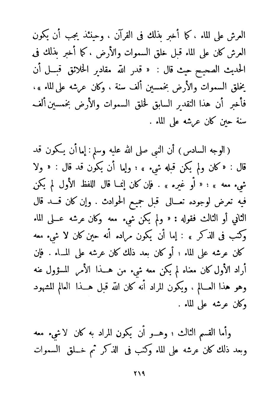 الْعَرْشُ عَلَى الْمَاءِ كَمَا أَخْبَرَ بِذَلِكَ فِي الْقُرْآنِ وَحِينَئِذٍ يَجِبُ أَنْ يَكُونَ الْعَرْشُ كَانَ عَلَى الْمَاءِ قَبْلَ خَلْقِ السَّمَوَاتِ وَالْأَرْضِ كَمَا أَخْبَرَ بِذَلِكَ فِي الْحَدِيثِ الصَّحِيحِ حَيْثُ قَالَ: " {قَدَّرَ اللَّهُ مَقَادِيرَ الْخَلَائِقِ قَبْلَ أَنْ يَخْلُقَ السَّمَوَاتِ وَالْأَرْضَ بِخَمْسِينَ أَلْفَ سَنَةٍ وَكَانَ عَرْشُهُ عَلَى الْمَاءِ} " فَأَخْبَرَ أَنَّ هَذَا التَّقْدِيرَ السَّابِقَ لِخَلْقِ السَّمَوَاتِ وَالْأَرْضِ بِخَمْسِينَ أَلْفَ سَنَةٍ حِينَ كَانَ عَرْشُهُ عَلَى الْمَاءِ. (الْوَجْهُ السَّادِسُ إنَّ النَّبِيَّ صَلَّى اللَّهُ عَلَيْهِ وَسَلَّمَ إمَّا أَنْ يَكُونَ قَدْ قَالَ: " {كَانَ وَلَمْ يَكُنْ قَبْلَهُ شَيْءٌ} "؛ وَإِمَّا أَنْ يَكُونَ قَدْ قَالَ: " وَلَا شَيْءَ مَعَهُ "؛ " أَوْ غَيْرُهُ ". فَإِنْ كَانَ إنَّمَا قَالَ اللَّفْظُ الْأَوَّلُ لَمْ يَكُنْ فِيهِ تَعَرُّضٌ لِوُجُودِهِ تَعَالَى قَبْلَ جَمِيعِ الْحَوَادِثِ. وَإِنْ كَانَ قَدْ قَالَ الثَّانِي أَوْ الثَّالِثَ فَقَوْلُهُ: " {وَلَمْ يَكُنْ شَيْءٌ مَعَهُ وَكَانَ عَرْشُهُ عَلَى الْمَاءِ وَكَتَبَ فِي الذِّكْرِ} ": إمَّا أَنْ يَكُونَ مُرَادُهُ أَنَّهُ حِينَ كَانَ لَا شَيْءَ مَعَهُ كَانَ عَرْشُهُ عَلَى الْمَاءِ؛ أَوْ كَانَ بَعْدَ ذَلِكَ كَانَ عَرْشُهُ عَلَى الْمَاءِ. فَإِنْ أَرَادَ الْأَوَّلَ كَانَ مَعْنَاهُ لَمْ يَكُنْ مَعَهُ شَيْءٌ " مِنْ هَذَا الْأَمْرِ الْمَسْئُولِ عَنْهُ وَهُوَ هَذَا الْعَالَمُ وَيَكُونُ الْمُرَادُ أَنَّهُ كَانَ اللَّهُ قَبْلَ هَذَا الْعَالَمِ الْمَشْهُودِ وَكَانَ عَرْشُهُ عَلَى الْمَاءِ. وَأَمَّا الْقِسْمُ الثَّالِثُ؛ وَهُوَ أَنْ يَكُونَ الْمُرَادُ بِهِ كَانَ لَا شَيْءَ مَعَهُ وَبَعْدَ ذَلِكَ كَانَ عَرْشُهُ عَلَى الْمَاءِ وَكَتَبَ فِي الذِّكْرِ ثُمَّ خَلَقَ السَّمَوَاتِ