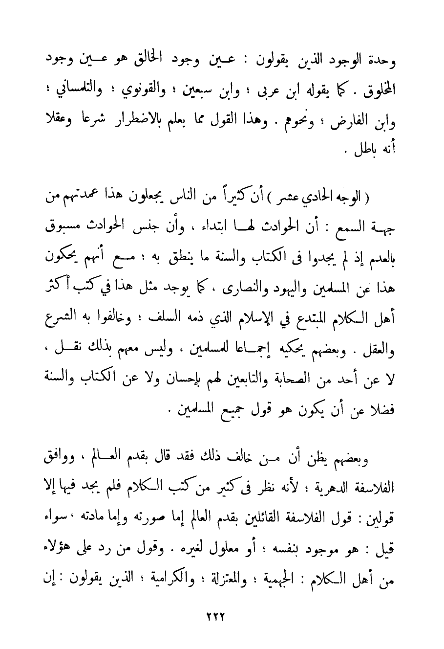 وَحْدَةِ الْوُجُودِ الَّذِينَ يَقُولُونَ: عَيْنُ وُجُودِ الْخَالِقِ هُوَ عَيْنُ وُجُودِ الْمَخْلُوقِ. كَمَا يَقُولُهُ ابْنُ عَرَبِيٍّ؛ وَابْنُ سَبْعِينَ؛ والقونوي؛ والتلمساني؛ وَابْنُ الْفَارِضِ؛ وَنَحْوُهُمْ. وَهَذَا الْقَوْلُ مِمَّا يُعْلَمُ بِالِاضْطِرَارِ شَرْعًا وَعَقْلًا أَنَّهُ بَاطِلٌ. (الْوَجْهُ الْحَادِي عَشَرَ أَنَّ كَثِيرًا مِنْ النَّاسِ يَجْعَلُونَ هَذَا عُمْدَتَهُمْ مِنْ جِهَةِ السَّمْعِ: أَنَّ الْحَوَادِثَ لَهَا ابْتِدَاءٌ وَأَنَّ جِنْسَ الْحَوَادِثِ مَسْبُوقٌ بِالْعَدَمِ إذْ لَمْ يَجِدُوا فِي الْكِتَابِ وَالسُّنَّةِ مَا يَنْطِقُ بِهِ؛ مَعَ أَنَّهُمْ يَحْكُونَ هَذَا عَنْ الْمُسْلِمِينَ وَالْيَهُودِ وَالنَّصَارَى كَمَا يُوجَدُ مِثْلُ هَذَا فِي كُتُبِ أَكْثَرِ أَهْلِ الْكَلَامِ الْمُبْتَدَعِ فِي الْإِسْلَامِ الَّذِي ذَمَّهُ السَّلَفُ؛ وَخَالَفُوا بِهِ الشَّرْعَ وَالْعَقْلَ. وَبَعْضُهُمْ يَحْكِيهِ إجْمَاعًا لِلْمُسْلِمِينَ وَلَيْسَ مَعَهُمْ بِذَلِكَ نَقْلٌ لَا عَنْ أَحَدٍ مِنْ الصَّحَابَةِ وَالتَّابِعِينَ لَهُمْ بِإِحْسَانِ وَلَا عَنْ الْكِتَابِ وَالسُّنَّةِ فَضْلًا عَنْ أَنْ يَكُونَ هُوَ قَوْلَ جَمِيعِ الْمُسْلِمِينَ. وَبَعْضُهُمْ يَظُنُّ أَنَّ مَنْ خَالَفَ ذَلِكَ فَقَدْ قَالَ بِقِدَمِ الْعَالَمِ وَوَافَقَ الْفَلَاسِفَةَ الدَّهْرِيَّةَ؛ لِأَنَّهُ نَظَرَ فِي كَثِيرٍ مِنْ كُتُبِ الْكَلَامِ فَلَمْ يَجِدْ فِيهَا إلَّا قَوْلَيْنِ: قَوْلَ الْفَلَاسِفَةِ الْقَائِلِينَ بِقِدَمِ الْعَالَمِ إمَّا صُورَتُهُ وَإِمَّا مَادَّتُهُ سَوَاءٌ قِيلَ: هُوَ مَوْجُودٌ بِنَفْسِهِ؛ أَوْ مَعْلُولٌ لِغَيْرِهِ. وَقَوْلَ مَنْ رَدَّ عَلَى هَؤُلَاءِ مِنْ أَهْلِ الْكَلَامِ: الْجَهْمِيَّة؛ وَالْمُعْتَزِلَةِ؛ والكَرَّامِيَة؛ الَّذِينَ يَقُولُونَ: إنَّ