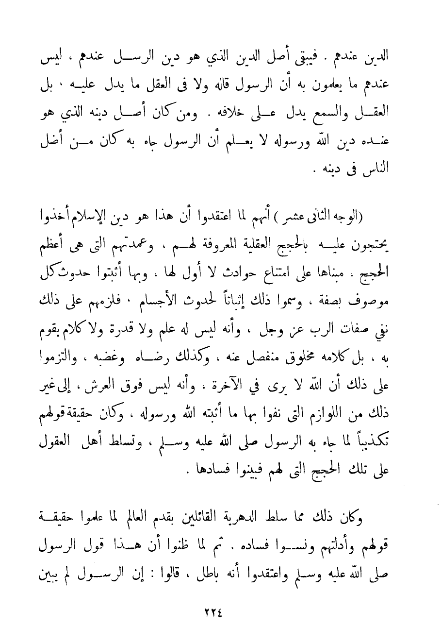 الدِّينِ عِنْدَهُمْ. فَيَبْقَى أَصْلُ الدِّينِ الَّذِي هُوَ دِينُ الرُّسُلِ عِنْدَهُمْ لَيْسَ عِنْدَهُمْ مَا يَعْلَمُونَ بِهِ أَنَّ الرَّسُولَ قَالَهُ وَلَا فِي الْعَقْلِ مَا يَدُلُّ عَلَيْهِ؛ بَلْ الْعَقْلُ وَالسَّمْعُ يَدُلُّ عَلَى خِلَافِهِ. وَمَنْ كَانَ أَصْلُ دِينِهِ الَّذِي هُوَ عِنْدَهُ دِينُ اللَّهِ وَرَسُولِهِ لَا يَعْلَمُ أَنَّ الرَّسُولَ جَاءَ بِهِ كَانَ مِنْ أَضَلِّ النَّاسِ فِي دِينِهِ.الْوَجْهُ الثَّانِي عَشَرَ أَنَّهُمْ لَمَّا اعْتَقَدُوا أَنَّ هَذَا هُوَ دِينُ الْإِسْلَامِ أَخَذُوا يَحْتَجُّونَ عَلَيْهِ بِالْحَجِّ الْعَقْلِيَّةِ الْمَعْرُوفَةِ لَهُمْ وَعُمْدَتُهُمْ الَّتِي هِيَ أَعْظَمُ الْحُجَجِ مَبْنَاهَا عَلَى امْتِنَاعِ حَوَادِثَ لَا أَوَّلَ لَهَا وَبِهَا أَثْبَتُوا حُدُوثَ كُلِّ مَوْصُوفٍ بِصِفَةِ وَسَمَّوْا ذَلِكَ إثْبَاتًا لِحُدُوثِ الْأَجْسَامِ فَلَزِمَهُمْ عَلَى ذَلِكَ نَفْيُ صِفَاتِ الرَّبِّ عَزَّ وَجَلَّ وَأَنَّهُ لَيْسَ لَهُ عِلْمٌ وَلَا قُدْرَةٌ وَلَا كَلَامٌ يَقُومُ بِهِ بَلْ كَلَامُهُ مَخْلُوقٌ مُنْفَصِلٌ عَنْهُ وَكَذَلِكَ رِضَاهُ وَغَضَبُهُ وَالْتَزَمُوا عَلَى ذَلِكَ أَنَّ اللَّهَ لَا يُرَى فِي الْآخِرَةِ وَأَنَّهُ لَيْسَ فَوْقَ الْعَرْشِ إلَى غَيْرِ ذَلِكَ مِنْ اللَّوَازِمِ الَّتِي نَفَوْا بِهَا مَا أَثَبَتَهُ اللَّهُ وَرَسُولُهُ وَكَانَ حَقِيقَةُ قَوْلِهِمْ تَكْذِيبًا لِمَا جَاءَ بِهِ الرَّسُولُ صَلَّى اللَّهُ عَلَيْهِ وَسَلَّمَ وَتَسَلَّطَ أَهْلُ الْعُقُولِ عَلَى تِلْكَ الْحُجَجِ الَّتِي لَهُمْ فَبَيَّنُوا فَسَادَهَا. وَكَانَ ذَلِكَ مِمَّا سُلِّطَ لِلدَّهْرِيَّةِ الْقَائِلِينَ بِقِدَمِ الْعَالَمِ لَمَّا عَلِمُوا حَقِيقَةَ قَوْلِهِمْ وَأَدِلَّتِهِمْ وَنَسَوْا فَسَادَهُ. ثُمَّ لَمَّا ظَنُّوا أَنَّ هَذَا قَوْلُ الرَّسُولِ صَلَّى اللَّهُ عَلَيْهِ وَسَلَّمَ وَاعْتَقَدُوا أَنَّهُ بَاطِلٌ قَالُوا: إنَّ الرَّسُولَ لَمْ يُبَيِّنْ
