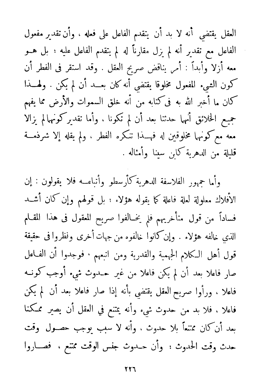 الْعَقْلِ يَقْتَضِي بِأَنَّهُ لَا بُدَّ أَنْ يَتَقَدَّمَ الْفَاعِلُ عَلَى فِعْلِهِ وَأَنَّ تَقْدِيرَ مَفْعُولِ الْفَاعِلِ مَعَ تَقْدِيرِ أَنَّهُ لَمْ يَزَلْ مُقَارِنًا لَهُ لَمْ يَتَقَدَّمْ الْفَاعِلُ عَلَيْهِ؛ بَلْ هُوَ مَعَهُ أَزَلًا وَأَبَدًا: أَمْرٌ يُنَاقِضُ صَرِيحَ الْعَقْلِ. وَقَدْ اسْتَقَرَّ فِي الْفِطَرِ أَنَّ كَوْنَ الشَّيْءِ الْمَفْعُولِ مَخْلُوقًا يَقْتَضِي أَنَّهُ كَانَ بَعْدَ أَنْ لَمْ يَكُنْ. وَلِهَذَا كَانَ مَا أَخْبَرَ اللَّهُ بِهِ فِي كِتَابِهِ مِنْ أَنَّهُ خَلَقَ السَّمَوَاتِ وَالْأَرْضَ مِمَّا يُفْهِمُ جَمِيعَ الْخَلَائِقِ أَنَّهُمَا حَدَثَتَا بَعْدَ أَنْ لَمْ تَكُونَا وَأَمَّا تَقْدِيرُ كَوْنِهِمَا لَمْ يَزَالَا مَعَهُ مَعَ كَوْنِهِمَا مَخْلُوقَيْنِ لَهُ فَهَذَا تُنْكِرُهُ الْفِطَرُ وَلَمْ يَقُلْهُ إلَّا شِرْذِمَةٌ قَلِيلَةٌ مِنْ الدَّهْرِيَّةِ كَابْنِ سِينَا وَأَمْثَالِهِ. وَأَمَّا جُمْهُورُ الْفَلَاسِفَةِ الدَّهْرِيَّةِ كَأَرِسْطُو وَأَتْبَاعِهِ فَلَا يَقُولُونَ: إنَّ الْأَفْلَاكَ مَعْلُولَةٌ لِعِلَّةِ فَاعِلَةٍ كَمَا يَقُولُهُ هَؤُلَاءِ؛ بَلْ قَوْلُهُمْ وَإِنْ كَانَ أَشَدَّ فَسَادًا مِنْ قَوْلِ مُتَأَخِّرِيهِمْ فَلَمْ يُخَالِفُوا صَرِيحَ الْمَعْقُولِ فِي هَذَا الْمَقَامِ الَّذِي خَالَفَهُ هَؤُلَاءِ. وَإِنْ كَانُوا خَالَفُوهُ مِنْ جِهَاتٍ أُخْرَى وَنَظَرُوا فِي حَقِيقَةِ قَوْلِ أَهْلِ الْكَلَامِ الْجَهْمِيَّة وَالْقَدَرِيَّةِ وَمَنْ اتَّبَعَهُمْ فَوَجَدُوا أَنَّ الْفَاعِلَ صَارَ فَاعِلًا بَعْدَ أَنْ لَمْ يَكُنْ فَاعِلًا مِنْ غَيْرِ حُدُوثِ شَيْءٍ أَوْجَبَ كَوْنَهُ فَاعِلًا وَرَأَوْا صَرِيحَ الْعَقْلِ يَقْتَضِي بِأَنَّهُ إذَا صَارَ فَاعِلًا بَعْدَ أَنْ لَمْ يَكُنْ فَاعِلًا فَلَا بُدَّ مِنْ حُدُوثِ شَيْءٍ وَأَنَّهُ يَمْتَنِعُ فِي الْعَقْلِ أَنْ يَصِيرَ مُمْكِنًا بَعْد أَنْ كَانَ مُمْتَنِعًا بِلَا حُدُوثٍ وَأَنَّهُ لَا سَبَبَ يُوجِبُ حُصُولَ وَقْتَ حَدَثَ وَقْتَ الْحُدُوثِ؛ وَأَنَّ حُدُوثَ جِنْسِ الْوَقْتِ مُمْتَنِعٌ فَصَارُوا
