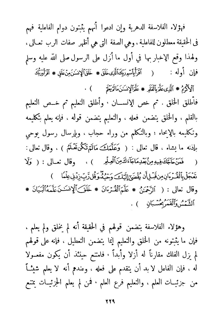 فَهَؤُلَاءِ الْفَلَاسِفَةُ الدَّهْرِيَّةُ وَإِنْ ادَّعَوْا أَنَّهُمْ يُثْبِتُونَ دَوَامَ الْفَاعِلِيَّةِ فَهُمْ فِي الْحَقِيقَةِ مُعَطِّلُونَ لِلْفَاعِلِيَّةِ وَهِيَ الصِّفَةُ الَّتِي هِيَ أَظْهَرُ صِفَاتِ الرَّبِّ تَعَالَى وَلِهَذَا وَقَعَ الْإِخْبَارُ بِهَا فِي أَوَّلِ مَا أُنْزِلَ عَلَى الرَّسُولِ صَلَّى اللَّهُ عَلَيْهِ وَسَلَّمَ فَإِنَّ أَوَّلَهُ: {اقْرَأْ بِاسْمِ رَبِّكَ الَّذِي خَلَقَ} {خَلَقَ الْإِنْسَانَ مِنْ عَلَقٍ} {اقْرَأْ وَرَبُّكَ الْأَكْرَمُ} {الَّذِي عَلَّمَ بِالْقَلَمِ} {عَلَّمَ الْإِنْسَانَ مَا لَمْ يَعْلَمْ} . فَأَطْلَقَ الْخَلْقَ. ثُمَّ خَصَّ الْإِنْسَانَ وَأَطْلَقَ التَّعْلِيمَ ثُمَّ خَصَّ التَّعْلِيمَ بِالْقَلَمِ وَالْخَلْقُ يَتَضَمَّنُ فِعْلَهُ وَالتَّعْلِيمُ يَتَضَمَّنُ قَوْلَهُ فَإِنَّهُ يَعْلَمُ بِتَكْلِيمِهِ وَتَكْلِيمُهُ بِالْإِيحَاءِ؛ وَبِالتَّكَلُّمِ مِنْ وَرَاءِ حِجَابٍ وَبِإِرْسَالِ رَسُولٍ يُوحِي بِإِذْنِهِ مَا يَشَاءُ قَالَ تَعَالَى: {وَعَلَّمَكَ مَا لَمْ تَكُنْ تَعْلَمُ} وَقَالَ تَعَالَى: {فَمَنْ حَاجَّكَ فِيهِ مِنْ بَعْدِ مَا جَاءَكَ مِنَ الْعِلْمِ} وَقَالَ تَعَالَى: {وَلَا تَعْجَلْ بِالْقُرْآنِ مِنْ قَبْلِ أَنْ يُقْضَى إلَيْكَ وَحْيُهُ وَقُلْ رَبِّ زِدْنِي عِلْمًا} وَقَالَ تَعَالَى: {الرَّحْمَنِ} {عَلَّمَ الْقُرْآنَ} {خَلَقَ الْإِنْسَانَ} {عَلَّمَهُ الْبَيَانَ} {الشَّمْسُ وَالْقَمَرُ بِحُسْبَانٍ} . وَهَؤُلَاءِ الْفَلَاسِفَةُ يَتَضَمَّنُ قَوْلُهُمْ فِي الْحَقِيقَةِ أَنَّهُ لَمْ يَخْلُقْ وَلَمْ يُعَلِّمْ فَإِنَّ مَا يُثْبِتُونَهُ مِنْ الْخَلْقِ وَالتَّعْلِيمِ إنَّمَا يَتَضَمَّنُ التَّعْطِيلَ فَإِنَّهُ عَلَى قَوْلِهِمْ لَمْ يَزَلْ الْفَلَكُ مُقَارِنًا لَهُ أَزَلًا وَأَبَدًا فَامْتَنَعَ حِينَئِذٍ أَنْ يَكُونَ مَفْعُولًا لَهُ فَإِنَّ الْفَاعِلَ لَا بُدَّ أَنْ يَتَقَدَّمَ عَلَى فِعْلِهِ وَعِنْدَهُمْ أَنَّهُ لَا يُعَلِّمُ شَيْئًا مِنْ جُزْئِيَّاتِ الْعِلْمِ وَالتَّعْلِيمُ فَرْعُ الْعِلْمِ فَمَنْ لَمْ يَعْلَمْ الْجُزْئِيَّاتِ يَمْتَنِعُ