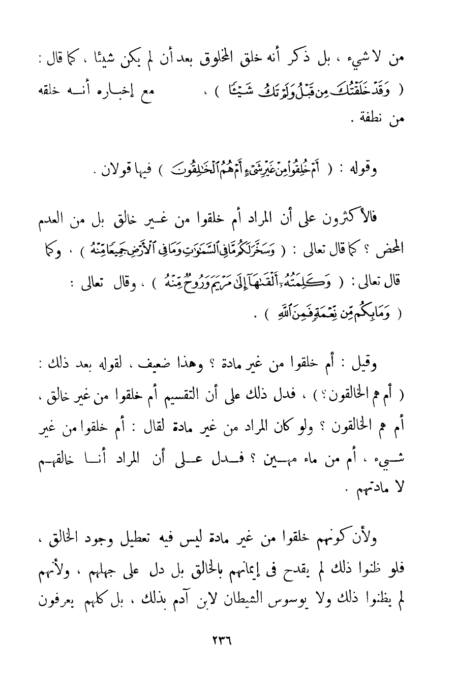 مِنْ لَا شَيْءٍ بَلْ ذَكَرَ أَنَّهُ خَلَقَ الْمَخْلُوقَ بَعْدَ أَنْ لَمْ يَكُنْ شَيْئًا كَمَا قَالَ: {وَقَدْ خَلَقْتُكَ مِنْ قَبْلُ وَلَمْ تَكُ شَيْئًا} مَعَ إخْبَارِهِ أَنَّهُ خَلَقَهُ مِنْ نُطْفَةٍ. وَقَوْلُهُ: {أَمْ خُلِقُوا مِنْ غَيْرِ شَيْءٍ أَمْ هُمُ الْخَالِقُونَ} فِيهَا قَوْلَانِ. فَالْأَكْثَرُونَ عَلَى أَنَّ الْمُرَادَ أَمْ خُلِقُوا مِنْ غَيْرِ خَالِقٍ بَلْ مِنْ الْعَدَمِ الْمَحْضِ؟ كَمَا قَالَ تَعَالَى: {وَسَخَّرَ لَكُمْ مَا فِي السَّمَاوَاتِ وَمَا فِي الْأَرْضِ جَمِيعًا مِنْهُ} وَكَمَا قَالَ تَعَالَى: {وَكَلِمَتُهُ أَلْقَاهَا إلَى مَرْيَمَ وَرُوحٌ مِنْهُ} وَقَالَ تَعَالَى: {وَمَا بِكُمْ مِنْ نِعْمَةٍ فَمِنَ اللَّهِ} . وَقِيلَ: أَمْ خُلِقُوا مِنْ غَيْرِ مَادَّةٍ؟ وَهَذَا ضَعِيفٌ لِقَوْلِهِ بَعْدَ ذَلِكَ: {أَمْ هُمُ الْخَالِقُونَ} فَدَلَّ ذَلِكَ عَلَى أَنَّ التَّقْسِيمَ أَمْ خُلِقُوا مِنْ غَيْرِ خَالِقٍ أَمْ هُمْ الْخَالِقُونَ؟ وَلَوْ كَانَ الْمُرَادُ مِنْ غَيْرِ مَادَّةٍ لَقَالَ: أَمْ خُلِقُوا مِنْ غَيْرِ شَيْءٍ أَمْ مِنْ مَاءٍ مَهِينٍ؟ فَدَلَّ عَلَى أَنَّ الْمُرَادَ أَنَا خَالِقُهُمْ لَا مَادَّتُهُمْ. وَلِأَنَّ كَوْنَهُمْ خُلِقُوا مِنْ غَيْرِ مَادَّةٍ لَيْسَ فِيهِ تَعْطِيلُ وُجُودِ الْخَالِقِ فَلَوْ ظَنُّوا ذَلِكَ لَمْ يَقْدَحْ فِي إيمَانِهِمْ بِالْخَالِقِ بَلْ دَلَّ عَلَى جَهْلِهِمْ وَلِأَنَّهُمْ لَمْ يَظُنُّوا ذَلِكَ وَلَا يُوَسْوِسُ الشَّيْطَانُ لِابْنِ آدَمَ بِذَلِكَ بَلْ كُلُّهُمْ يَعْرِفُونَ