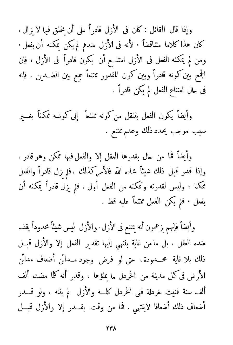 وَإِذَا قَالَ الْقَائِلُ: كَانَ فِي الْأَزَلِ قَادِرًا عَلَى أَنْ يَخْلُقَ فِيمَا لَا يَزَالُ كَانَ هَذَا كَلَامًا مُتَنَاقِضًا لِأَنَّهُ فِي الْأَزَلِ عِنْدَهُمْ لَمْ يَكُنْ يُمْكِنُهُ أَنْ يَفْعَلَ وَمَنْ لَمْ يُمْكِنْهُ الْفِعْلُ فِي الْأَزَلِ امْتَنَعَ أَنْ يَكُونَ قَادِرًا فِي الْأَزَلِ؛ فَإِنَّ الْجَمْعَ بَيْنَ كَوْنِهِ قَادِرًا وَبَيْنَ كَوْنِ الْمَقْدُورِ مُمْتَنِعًا جَمْعٌ بَيْنَ الضِّدَّيْنِ فَإِنَّهُ فِي حَالِ امْتِنَاعِ الْفِعْلِ لَمْ يَكُنْ قَادِرًا. وَأَيْضًا يَكُونُ الْفِعْلُ يَنْتَقِلُ مِنْ كَوْنِهِ مُمْتَنِعًا إلَى كَوْنِهِ مُمْكِنًا بِغَيْرِ سَبَبٍ مُوجِبٍ يُحَدِّدُ ذَلِكَ وَعَدَمٍ مُمْتَنِعٍ. وَأَيْضًا فَمَا مِنْ حَالٍ يُقَدِّرُهَا الْعَقْلُ إلَّا وَالْفِعْل فِيهَا مُمْكِنٌ وَهُوَ قَادِرٌ وَإِذَا قُدِّرَ قَبْلَ ذَلِكَ شَيْئًا شَاءَهُ اللَّهُ فَالْأَمْرُ كَذَلِكَ فَلَمْ يَزَلْ قَادِرًا وَالْفِعْلُ مُمْكِنًا؛ وَلَيْسَ لِقُدْرَتِهِ وَتَمَكُّنِهِ مِنْ الْفِعْلِ أَوَّلَ فَلَمْ يَزَلْ قَادِرًا يُمْكِنُهُ أَنْ يَفْعَلَ فَلَمْ يَكُنْ الْفِعْلُ مُمْتَنِعًا عَلَيْهِ قَطُّ. وَأَيْضًا فَإِنَّهُمْ يَزْعُمُونَ أَنَّهُ يَمْتَنِعُ فِي الْأَزَلِ وَالْأَزَلُ لَيْسَ شَيْئًا مَحْدُودًا يَقِفُ عِنْدَهُ الْعَقْلُ بَلْ مَا مِنْ غَايَةٍ يَنْتَهِي إلَيْهَا تَقْدِيرُ الْفِعْلِ إلَّا وَالْأَزَلُ قَبْلَ ذَلِكَ بِلَا غَايَةٍ مَحْدُودَةٍ حَتَّى لَوْ فُرِضَ وُجُودُ مَدَائِنَ أَضْعَافِ مَدَائِنِ الْأَرْضِ فِي كُلِّ مَدِينَةٍ مِنْ الْخَرْدَلِ مَا يَمْلَؤُهَا؛ وَقُدِّرَ إنَّهُ كُلَّمَا مَضَتْ أَلْفُ أَلْفُ سَنَةٍ فَنِيَتْ خَرْدَلَةٌ فَنَى الْخَرْدَلُ كُلُّهُ وَالْأَزَلُ لَمْ يَنْتَهِ وَلَوْ قُدِّرَ أَضْعَافُ ذَلِكَ أَضْعَافًا لَا يَنْتَهِي. فَمَا مِنْ وَقْتٍ يُقَدَّرُ إلَّا وَالْأَزَلُ قَبْلَ ذَلِكَ.