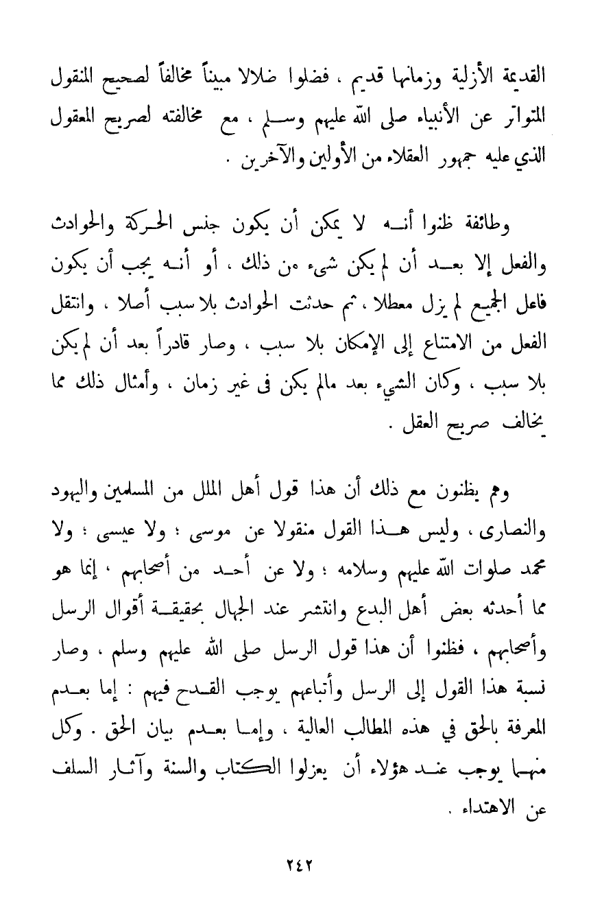 الْقَدِيمَةُ الْأَزَلِيَّةُ وَزَمَانُهَا قَدِيمٌ فَضَلُّوا ضَلَالًا مُبِينًا مُخَالِفًا لِصَحِيحِ الْمَنْقُولِ الْمُتَوَاتِرِ عَنْ الْأَنْبِيَاءِ صَلَّى اللَّهُ عَلَيْهِمْ وَسَلَّمَ مَعَ مُخَالَفَتِهِ لِصَرِيحِ الْمَعْقُولِ الَّذِي عَلَيْهِ جُمْهُورُ الْعُقَلَاءِ مِنْ الْأَوَّلِينَ والآخرين. وَطَائِفَةٌ ظَنُّوا أَنَّهُ لَا يُمْكِنُ أَنْ يَكُونَ جِنْسَ الْحَرَكَةِ وَالْحَوَادِثِ وَالْفِعْلِ إلَّا بَعْدَ أَنْ لَمْ يَكُنْ شَيْءٌ مِنْ ذَلِكَ أَوْ أَنَّهُ يَجِبُ أَنْ يَكُونَ فَاعِلُ الْجَمِيعِ لَمْ يَزَلْ مُعَطَّلًا ثُمَّ حَدَثَتْ الْحَوَادِثُ بِلَا سَبَبٍ أَصْلًا وَانْتَقَلَ الْفِعْلُ مِنْ الِامْتِنَاعِ إلَى الْإِمْكَانِ بِلَا سَبَبٍ وَصَارَ قَادِرًا بَعْدَ أَنْ لَمْ يَكُنْ بِلَا سَبَبٍ وَكَانَ الشَّيْءُ بَعْدَ مَا لَمْ يَكُنْ فِي غَيْرِ زَمَانٍ وَأَمْثَالِ ذَلِكَ مِمَّا يُخَالِفُ صَرِيحَ الْعَقْلِ. وَهُمْ يَظُنُّونَ مَعَ ذَلِكَ أَنَّ هَذَا قَوْلُ أَهْلِ الْمِلَلِ مِنْ الْمُسْلِمِينَ وَالْيَهُودِ وَالنَّصَارَى وَلَيْسَ هَذَا الْقَوْلُ مَنْقُولًا عَنْ مُوسَى؛ وَلَا عِيسَى؛ وَلَا مُحَمَّدٍ صَلَوَاتُ اللَّهِ عَلَيْهِمْ وَسَلَامُهُ؛ وَلَا عَنْ أَحَدٍ مِنْ أَصْحَابِهِمْ إنَّمَا هُوَ مِمَّا أَحْدَثَهُ بَعْضُ أَهْلِ الْبِدَعِ وَانْتَشَرَ عِنْدَ الْجُهَّالِ بِحَقِيقَةِ أَقْوَالِ الرُّسُلِ وَأَصْحَابِهِمْ فَظَنُّوا أَنَّ هَذَا قَوْلُ الرُّسُلِ صَلَّى اللَّهُ عَلَيْهِمْ وَسَلَّمَ وَصَارَ نِسْبَةُ هَذَا الْقَوْلِ إلَى الرُّسُلِ وَأَتْبَاعِهِمْ يُوجِبُ الْقَدْحَ فِيهِمْ: إمَّا بِعَدَمِ الْمَعْرِفَةِ بِالْحَقِّ فِي هَذِهِ الْمَطَالِبِ الْعَالِيَةِ وَإِمَّا بِعَدَمِ بَيَانِ الْحَقِّ. وَكُلٌّ مِنْهُمَا يُوجِبُ عِنْدَ هَؤُلَاءِ أَنْ يَعْزِلُوا الْكِتَابَ وَالسُّنَّةَ وَآثَارَ السَّلَفِ عَنْ الِاهْتِدَاءِ.