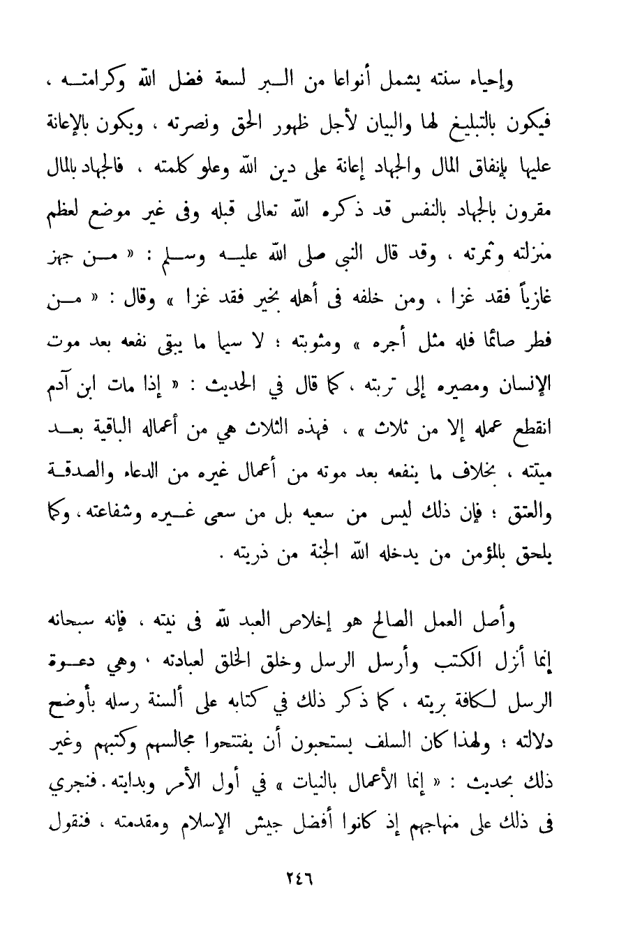 وَإِحْيَاءُ سُنَّتِهِ يَشْمَلُ أَنْوَاعًا مِنْ الْبِرِّ لِسِعَةِ فَضْلِ اللَّهِ وَكَرَامَتِهِ فَيَكُونُ بِالتَّبْلِيغِ لَهَا وَالْبَيَانِ لِأَجْلِ ظُهُورِ الْحَقِّ وَنُصْرَتِهِ وَيَكُونُ بِالْإِعَانَةِ عَلَيْهَا بِإِنْفَاقِ الْمَالِ وَالْجِهَادِ إعَانَةً عَلَى دِينِ اللَّهِ وَعُلُوِّ كَلِمَتِهِ فَالْجِهَادُ بِالْمَالِ مَقْرُونٌ بِالْجِهَادِ بِالنَّفْسِ قَدْ ذَكَرَهُ اللَّهُ تَعَالَى قَبْلَهُ وَفِي غَيْرِ مَوْضِعٍ لِعِظَمِ مَنْزِلَتِهِ وَثَمَرَتِهِ وَقَدْ قَالَ النَّبِيُّ صَلَّى اللَّهُ عَلَيْهِ وَسَلَّمَ " {مَنْ جَهَّزَ غَازِيًا فَقَدْ غَزَا وَمَنْ خَلَفَهُ فِي أَهْلِهِ بِخَيْرِ فَقَدْ غَزَا} " وَقَالَ: " {مَنْ فَطَّرَ صَائِمًا فَلَهُ مِثْلُ أَجْرِهِ} " وَمَثُوبَتِهِ؛ لَا سِيَّمَا مَا يَبْقَى نَفْعُهُ بَعْدَ مَوْتِ الْإِنْسَانِ وَمَصِيرِهِ إلَى تُرْبَتِهِ كَمَا قَالَ فِي الْحَدِيثِ: " {إذَا مَاتَ ابْنُ آدَمَ انْقَطَعَ عَمَلُهُ إلَّا مِنْ ثَلَاثٍ} " فَهَذِهِ الثَّلَاثُ هِيَ مِنْ أَعْمَالِهِ الْبَاقِيَةِ بَعْدَ مِيتَتِهِ بِخِلَافِ مَا يَنْفَعُهُ بَعْدَ مَوْتِهِ مِنْ أَعْمَالِ غَيْرِهِ مِنْ الدُّعَاءِ وَالصَّدَقَةِ وَالْعِتْقِ؛ فَإِنَّ ذَلِكَ لَيْسَ مِنْ سَعْيِهِ بَلْ مِنْ سَعْيِ غَيْرِهِ وَشَفَاعَتِهِ وَكَمَا يَلْحَقُ بِالْمُؤْمِنِ مَنْ يُدْخِلُهُ اللَّهُ الْجَنَّةَ مِنْ ذُرِّيَّتِهِ. وَأَصْلُ الْعَمَلِ الصَّالِحِ هُوَ إخْلَاصُ الْعَبْدِ لِلَّهِ فِي نِيَّتِهِ فَإِنَّهُ سُبْحَانَهُ إنَّمَا أَنْزَلَ الْكُتُبَ وَأَرْسَلَ الرُّسُلَ وَخَلَقَ الْخَلْقَ لِعِبَادَتِهِ وَهِيَ دَعْوَةُ الرُّسُلِ لِكَافَّةِ بَرِيَّتِهِ كَمَا ذَكَرَ ذَلِكَ فِي كِتَابِهِ عَلَى أَلْسِنَةِ رُسُلِهِ بِأَوْضَحِ دَلَالَتِهِ؛ وَلِهَذَا كَانَ السَّلَفُ يَسْتَحِبُّونَ أَنْ يَفْتَتِحُوا مَجَالِسَهُمْ وَكُتُبَهُمْ وَغَيْرَ ذَلِكَ بِحَدِيثِ: " {إنَّمَا الْأَعْمَالُ بِالنِّيَّاتِ} " فِي أَوَّلِ الْأَمْرِ وَبِدَايَتِهِ. فَنَجْرِي فِي ذَلِكَ عَلَى مِنْهَاجِهِمْ إذْ كَانُوا أَفْضَلَ جَيْشِ الْإِسْلَامِ وَمُقَدِّمَتَهُ فَنَقُولُ