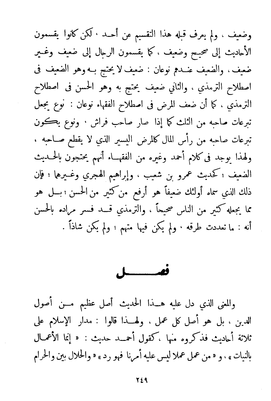 وَضَعِيفٍ وَلَمْ يُعْرَفْ قَبْلَهُ هَذَا التَّقْسِيمُ عَنْ أَحَدٍ لَكِنْ كَانُوا يُقَسِّمُونَ الْأَحَادِيثَ إلَى صَحِيحٍ وَضَعِيفٍ كَمَا يُقَسِّمُونَ الرِّجَالَ إلَى ضَعِيفٍ وَغَيْرِ ضَعِيفٍ وَالضَّعِيفُ عِنْدَهُمْ نَوْعَانِ: ضَعِيفٌ لَا يُحْتَجُّ بِهِ وَهُوَ الضَّعِيفُ فِي اصْطِلَاحِ التِّرْمِذِيِّ وَالثَّانِي ضَعِيفٌ يُحْتَجُّ بِهِ وَهُوَ الْحَسَنُ فِي اصْطِلَاحِ التِّرْمِذِيِّ كَمَا أَنَّ ضَعْفَ الْمَرَضِ فِي اصْطِلَاحِ الْفُقَهَاءِ نَوْعَانِ: نَوْعٌ يَجْعَلُ تَبَرُّعَاتِ صَاحِبِهِ مِنْ الثُّلُثِ كَمَا إذَا صَارَ صَاحِبَ فَرَاشٍ وَنَوْعٌ يَكُونُ تَبَرُّعَاتُ صَاحِبِهِ مِنْ رَأْسِ الْمَالِ كَالْمَرَضِ الْيَسِيرِ الَّذِي لَا يَقْطَعُ صَاحِبَهُ وَلِهَذَا يُوجَدُ فِي كَلَامِ أَحْمَد وَغَيْرِهِ مِنْ الْفُقَهَاءِ أَنَّهُمْ يَحْتَجُّونَ بِالْحَدِيثِ الضَّعِيفِ؛ كَحَدِيثِ عَمْرِو بْنِ شُعَيْبٍ وَإِبْرَاهِيمَ الْهِجْرِيِّ وَغَيْرِهِمَا؛ فَإِنَّ ذَلِكَ الَّذِي سَمَّاهُ أُولَئِكَ ضَعِيفًا هُوَ أَرْفَعُ مِنْ كَثِيرٍ مِنْ الْحَسَنِ؛ بَلْ هُوَ مِمَّا يَجْعَلُهُ كَثِيرٌ مِنْ النَّاسِ صَحِيحًا وَالتِّرْمِذِي قَدْ فَسَّرَ مُرَادَهُ بِالْحَسَنِ أَنَّهُ: مَا تَعَدَّدَتْ طُرُقُهُ وَلَمْ يَكُنْ فِيهَا مُتَّهَمٌ؛ وَلَمْ يَكُنْ شَاذًّا.