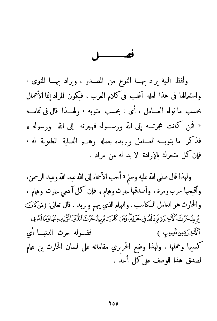 وَلَفْظُ النِّيَّةِ يُرَادُ بِهَا النَّوْعُ مِنْ الْمَصْدَرِ وَيُرَادُ بِهَا الْمَنْوِيُّ وَاسْتِعْمَالُهَا فِي هَذَا لَعَلَّهُ أَغْلَبُ فِي كَلَامِ الْعَرَبِ فَيَكُونُ الْمُرَادُ إنَّمَا الْأَعْمَالُ بِحَسَبِ مَا نَوَاهُ الْعَامِلُ أَيْ: بِحَسَبِ مَنْوِيِّهِ وَلِهَذَا قَالَ فِي تَمَامِهِ {فَمَنْ كَانَتْ هِجْرَتُهُ إلَى اللَّهِ وَرَسُولِهِ فَهِجْرَتُهُ إلَى اللَّهِ وَرَسُولِهِ} فَذَكَرَ مَا يَنْوِيهِ الْعَامِلُ وَيُرِيدُهُ بِعَمَلِهِ وَهُوَ الْغَايَةُ الْمَطْلُوبَةُ لَهُ. فَإِنَّ كُلَّ مُتَحَرِّكٍ بِالْإِرَادَةِ لَا بُدَّ لَهُ مِنْ مُرَادٍ. وَلِهَذَا قَالَ صَلَّى اللَّهُ عَلَيْهِ وَسَلَّمَ {أَحَبُّ الْأَسْمَاءِ إلَى اللَّهِ عَبْدُ اللَّهِ وَعَبْدُ الرَّحْمَنِ وَأَقْبَحُهَا حَرْبٌ وَمُرَّةُ وَأَصْدَقُهَا حَارِثٌ وَهَمَّامٌ} فَإِنَّ كُلَّ آدَمِيٍّ حَارِثٌ وَهَمَّامٌ وَالْحَارِثُ هُوَ الْعَامِلُ الْكَاسِبُ وَالْهَمَّامُ الَّذِي يَهُمُّ وَيُرِيدُ. قَالَ تَعَالَى: {مَنْ كَانَ يُرِيدُ حَرْثَ الْآخِرَةِ نَزِدْ لَهُ فِي حَرْثِهِ وَمَنْ كَانَ يُرِيدُ حَرْثَ الدُّنْيَا نُؤْتِهِ مِنْهَا وَمَا لَهُ فِي الْآخِرَةِ مِنْ نَصِيبٍ} فَقَوْلُهُ حَرْثَ الدُّنْيَا أَيْ كَسْبَهَا وَعَمَلَهَا وَلِهَذَا وَضَعَ الْحَرِيرِيُّ مَقَامَاتِهِ عَلَى لِسَان الْحَارِثِ بْنِ هَمَّامٍ لِصِدْقِ هَذَا الْوَصْفِ عَلَى كُلِّ أَحَدٍ.