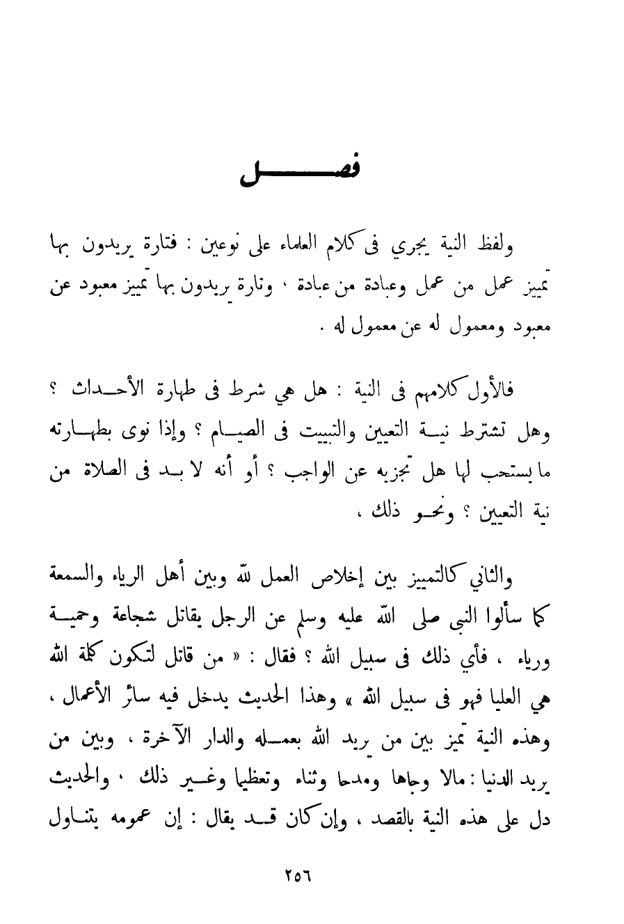وَلَفْظُ النِّيَّةِ يَجْرِي فِي كَلَامِ الْعُلَمَاءِ عَلَى نَوْعَيْنِ: فَتَارَةً يُرِيدُونَ بِهَا تَمْيِيزَ عَمَلٍ مِنْ عَمَلٍ وَعِبَادَةٍ مِنْ عِبَادَةٍ وَتَارَةً يُرِيدُونَ بِهَا تَمْيِيزَ مَعْبُودٍ عَنْ مَعْبُودٍ وَمَعْمُولٍ لَهُ عَنْ مَعْمُولٍ لَهُ. فَالْأَوَّلُ كَلَامُهُمْ فِي النِّيَّةِ: هَلْ هِيَ شَرْطٌ فِي طَهَارَةِ الْأَحْدَاثِ؟ وَهَلْ تُشْتَرَطُ نِيَّةُ التَّعْيِينِ وَالتَّبْيِيتِ فِي الصِّيَامِ؟ وَإِذَا نَوَى بِطَهَارَتِهِ مَا يُسْتَحَبُّ لَهَا هَلْ تَجْزِيهِ عَنْ الْوَاجِبِ؟ أَوْ أَنَّهُ لَا بُدَّ فِي الصَّلَاةِ مِنْ نِيَّةِ التَّعْيِينِ؟ وَنَحْوِ ذَلِكَ وَالثَّانِي كَالتَّمْيِيزِ بَيْنَ إخْلَاصِ الْعَمَلِ لِلَّهِ وَبَيْنَ أَهْلِ الرِّيَاءِ وَالسُّمْعَةِ كَمَا سَأَلُوا النَّبِيَّ صَلَّى اللَّهُ عَلَيْهِ وَسَلَّمَ عَنْ الرَّجُلِ يُقَاتِلُ شَجَاعَةً وَحَمِيَّةً وَرِيَاءً فَأَيُّ ذَلِكَ فِي سَبِيلِ اللَّهِ؟ فَقَالَ: {مَنْ قَاتَلَ لِتَكُونَ كَلِمَةُ اللَّهِ هِيَ الْعُلْيَا فَهُوَ فِي سَبِيلِ اللَّهِ} وَهَذَا الْحَدِيثُ يَدْخُلُ فِيهِ سَائِرُ الْأَعْمَالِ وَهَذِهِ النِّيَّةُ تُمَيِّزُ بَيْنَ مَنْ يُرِيدُ اللَّهَ بِعَمَلِهِ وَالدَّارَ الْآخِرَةَ وَبَيْنَ مَنْ يُرِيدُ الدُّنْيَا: مَالًا وَجَاهًا وَمَدْحًا وَثَنَاءً وَتَعْظِيمًا وَغَيْرَ ذَلِكَ وَالْحَدِيثُ دَلَّ عَلَى هَذِهِ النِّيَّةِ بِالْقَصْدِ وَإِنْ كَانَ قَدْ يُقَالُ: أَنَّ عُمُومَهُ يَتَنَاوَلُ