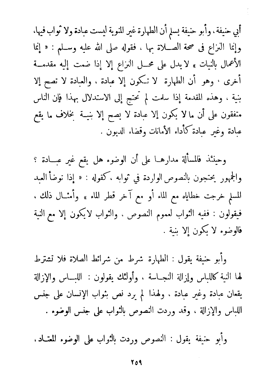 أَبِي حَنِيفَةَ وَأَبُو حَنِيفَةَ يُسَلِّمُ أَنَّ الطَّهَارَةَ غَيْرَ الْمَنْوِيَّةِ لَيْسَتْ عِبَادَةً وَلَا ثَوَابَ فِيهَا وَإِنَّمَا النِّزَاعُ فِي صِحَّةِ الصَّلَاةِ بِهَا فَقَوْلُهُ صَلَّى اللَّهُ عَلَيْهِ وَسَلَّمَ " إنَّمَا الْأَعْمَالُ بِالنِّيَّاتِ " لَا يَدُلُّ عَلَى مَحَلِّ النِّزَاعِ إلَّا إذَا ضُمَّتْ إلَيْهِ مُقَدِّمَةٌ أُخْرَى وَهُوَ أَنَّ الطَّهَارَةَ لَا تَكُونُ إلَّا عِبَادَةً وَالْعِبَادَةُ لَا تَصِحُّ إلَّا بِنِيَّةِ وَهَذِهِ الْمُقَدِّمَةُ إذَا سَلِمَتْ لَمْ تَحْتَجْ إلَى الِاسْتِدْلَالِ بِهَذَا فَإِنَّ النَّاسَ مُتَّفِقُونَ عَلَى أَنَّ مَا لَا يَكُونُ إلَّا عِبَادَةً لَا يَصِحُّ إلَّا بِنِيَّةِ بِخِلَافِ مَا يَقَعُ عِبَادَةً وَغَيْرَ عِبَادَةٍ كَأَدَاءِ الْأَمَانَاتِ وَقَضَاءِ الدُّيُونِ. وَحِينَئِذٍ فَالْمَسْأَلَةُ مَدَارُهَا عَلَى أَنَّ الْوُضُوءَ هَلْ يَقَعُ غَيْرَ عِبَادَةٍ؟ وَالْجُمْهُورُ يَحْتَجُّونَ بِالنُّصُوصِ الْوَارِدَةِ فِي ثَوَابِهِ كَقَوْلِهِ: {إذَا تَوَضَّأَ الْعَبْدُ الْمُسْلِمُ خَرَجَتْ خَطَايَاهُ مَعَ الْمَاءِ أَوْ مَعَ آخِرِ قَطْرِ الْمَاءِ} وَأَمْثَالُ ذَلِكَ فَيَقُولُونَ: فَفِيهِ الثَّوَابُ لِعُمُومِ النُّصُوصِ وَالثَّوَابُ لَا يَكُونُ إلَّا مَعَ النِّيَّةِ فَالْوُضُوءُ لَا يَكُونُ إلَّا بِنِيَّةِ. وَأَبُو حَنِيفَةَ يَقُولُ: الطَّهَارَةُ شَرْطٌ مِنْ شَرَائِطِ الصَّلَاةِ فَلَا تُشْتَرَطُ لَهَا النِّيَّةُ كَاللِّبَاسِ وَإِزَالَةِ النَّجَاسَةِ وَأُولَئِكَ يَقُولُونَ: اللِّبَاسُ وَالْإِزَالَةُ يَقَعَانِ عِبَادَةً وَغَيْرَ عِبَادَةٍ وَلِهَذَا لَمْ يَرِدْ نَصٌّ بِثَوَابِ الْإِنْسَانِ عَلَى جِنْسِ اللِّبَاسِ وَالْإِزَالَةِ وَقَدْ وَرَدَتْ النُّصُوصُ بِالثَّوَابِ عَلَى جِنْسِ الْوُضُوءِ. وَأَبُو حَنِيفَةَ يَقُولُ: النُّصُوصُ وَرَدَتْ بِالثَّوَابِ عَلَى الْوُضُوءِ الْمُعْتَادِ