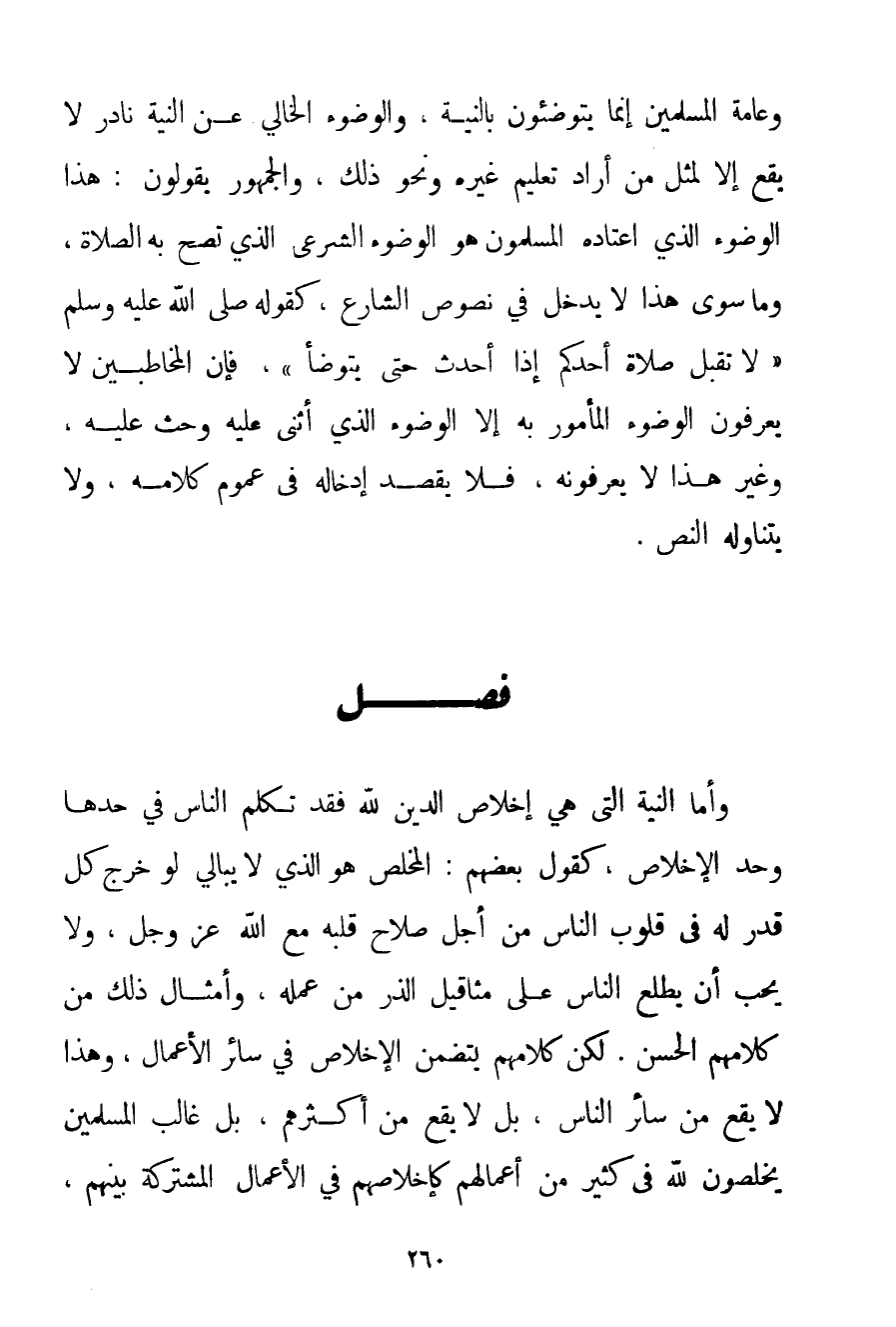 وَعَامَّةُ الْمُسْلِمِينَ إنَّمَا يَتَوَضَّئُونَ بِالنِّيَّةِ وَالْوُضُوءُ الْخَالِي عَنْ النِّيَّةِ نَادِرٌ لَا يَقَعُ إلَّا لِمِثْلِ مَنْ أَرَادَ تَعْلِيمَ غَيْرِهِ وَنَحْوَ ذَلِكَ وَالْجُمْهُورُ يَقُولُونَ: هَذَا الْوُضُوءُ الَّذِي اعْتَادَهُ الْمُسْلِمُونَ هُوَ الْوُضُوءُ الشَّرْعِيُّ الَّذِي تَصِحُّ بِهِ الصَّلَاةُ وَمَا سِوَى هَذَا لَا يَدْخُلُ فِي نُصُوصِ الشَّارِعِ كَقَوْلِهِ صَلَّى اللَّهُ عَلَيْهِ وَسَلَّمَ {لَا تُقْبَلُ صَلَاةُ أَحَدِكُمْ إذَا أَحْدَثَ حَتَّى يَتَوَضَّأَ} فَإِنَّ الْمُخَاطَبِينَ لَا يَعْرِفُونَ الْوُضُوءَ الْمَأْمُورَ بِهِ إلَّا الْوُضُوءَ الَّذِي أَثْنَى عَلَيْهِ وَحَثَّ عَلَيْهِ وَغَيْرُ هَذَا لَا يَعْرِفُونَهُ فَلَا يَقْصِدُ إدْخَالَهُ فِي عُمُومِ كَلَامِهِ وَلَا يَتَنَاوَلُهُ النَّصُّ.