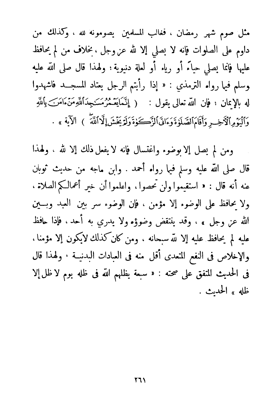 مِثْلَ صَوْمِ شَهْرِ رَمَضَانَ فَغَالِبُ الْمُسْلِمِينَ يَصُومُونَهُ لِلَّهِ وَكَذَلِكَ مَنْ دَاوَمَ عَلَى الصَّلَوَاتِ فَإِنَّهُ لَا يُصَلِّي إلَّا لِلَّهِ عَزَّ وَجَلَّ بِخِلَافِ مَنْ لَمْ يُحَافِظْ عَلَيْهَا فَإِنَّمَا يُصَلِّي حَيَاءً أَوْ رِيَاءً أَوْ لِعِلَّةِ دُنْيَوِيَّةٍ؛ وَلِهَذَا قَالَ صَلَّى اللَّهُ عَلَيْهِ وَسَلَّمَ فِيمَا رَوَاهُ التِّرْمِذِيُّ: {إذَا رَأَيْتُمْ الرَّجُلَ يَعْتَادُ الْمَسْجِدَ فَاشْهَدُوا لَهُ بِالْإِيمَانِ؛ فَإِنَّ اللَّهَ تَعَالَى يَقُولُ: {إنَّمَا يَعْمُرُ مَسَاجِدَ اللَّهِ مَنْ آمَنَ بِاللَّهِ وَالْيَوْمِ الْآخِرِ وَأَقَامَ الصَّلَاةَ وَآتَى الزَّكَاةَ وَلَمْ يَخْشَ إلَّا اللَّهَ} الْآيَةَ} . وَمَنْ لَمْ يُصَلِّ إلَّا بِوُضُوءِ وَاغْتِسَالٍ فَإِنَّهُ لَا يَفْعَلُ ذَلِكَ إلَّا لِلَّهِ وَلِهَذَا قَالَ صَلَّى اللَّهُ عَلَيْهِ وَسَلَّمَ فِيمَا رَوَاهُ أَحْمَد. وَابْنُ مَاجَه مِنْ حَدِيثِ ثوبان عَنْهُ أَنَّهُ قَالَ: {اسْتَقِيمُوا وَلَنْ تَحْصُوا وَاعْلَمُوا أَنَّ خَيْرَ أَعْمَالِكُمْ الصَّلَاةُ وَلَا يُحَافِظُ عَلَى الْوُضُوءِ إلَّا مُؤْمِنٌ فَإِنَّ الْوُضُوءَ سِرٌّ بَيْنَ الْعَبْدِ وَبَيْنَ اللَّهِ عَزَّ وَجَلَّ} وَقَدْ يَنْتَقِضُ وُضُوءُهُ وَلَا يَدْرِي بِهِ أَحَدٌ فَإِذَا حَافَظَ عَلَيْهِ لَمْ يُحَافِظْ عَلَيْهِ إلَّا لِلَّهِ سُبْحَانَهُ وَمَنْ كَانَ كَذَلِكَ لَا يَكُونُ إلَّا مُؤْمِنًا وَالْإِخْلَاصُ فِي النَّفْعِ الْمُتَعَدِّي أَقَلُّ مِنْهُ فِي الْعِبَادَاتِ الْبَدَنِيَّةِ وَلِهَذَا قَالَ فِي الْحَدِيثِ الْمُتَّفَقِ عَلَى صِحَّتِهِ: {سَبْعَةٌ يُظِلُّهُمْ اللَّهُ فِي ظِلِّهِ يَوْمَ لَا ظِلَّ إلَّا ظِلُّهُ} الْحَدِيثَ.