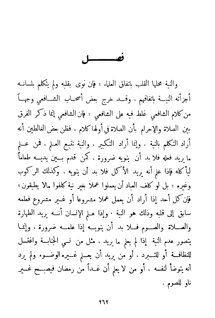 وَالنِّيَّةُ مَحَلُّهَا الْقَلْبُ بِاتِّفَاقِ الْعُلَمَاءِ؛ فَإِنْ نَوَى بِقَلْبِهِ وَلَمْ يَتَكَلَّمْ بِلِسَانِهِ أَجْزَأَتْهُ النِّيَّةُ بِاتِّفَاقِهِمْ وَقَدْ خَرَّجَ بَعْضُ أَصْحَابِ الشَّافِعِيِّ وَجْهًا مِنْ كَلَامِ الشَّافِعِيِّ غَلِطَ فِيهِ عَلَى الشَّافِعِيِّ؛ فَإِنَّ الشَّافِعِيَّ إنَّمَا ذَكَرَ الْفَرْقَ بَيْنَ الصَّلَاةِ وَالْإِحْرَامِ بِأَنَّ الصَّلَاةَ فِي أَوَّلِهَا كَلَامٌ فَظَنَّ بَعْضُ الغالطين أَنَّهُ أَرَادَ التَّكَلُّمَ بِالنِّيَّةِ وَإِنَّمَا أَرَادَ التَّكْبِيرَ وَالنِّيَّةُ تَتْبَعُ الْعِلْمَ فَمَنْ عَلِمَ مَا يُرِيدُ فِعْلَهُ فَلَا بُدَّ أَنْ يَنْوِيَهُ ضَرُورَةً كَمَنْ قَدَّمَ بَيْنَ يَدَيْهِ طَعَامًا لِيَأْكُلَهُ فَإِذَا عَلِمَ أَنَّهُ يُرِيدُ الْأَكْلَ فَلَا بُدَّ أَنْ يَنْوِيَهُ وَكَذَلِكَ الرُّكُوبُ وَغَيْرُهُ؛ بَلْ لَوْ كَلَّفَ الْعِبَادَ أَنْ يَعْمَلُوا عَمَلًا بِغَيْرِ نِيَّةٍ كُلِّفُوا مَا لَا يُطِيقُونَ؛ فَإِنَّ كُلَّ أَحَدٍ إذَا أَرَادَ أَنْ يَعْمَلَ عَمَلًا مَشْرُوعًا أَوْ غَيْرَ مَشْرُوعٍ فَعِلْمُهُ سَابِقٌ إلَى قَلْبِهِ وَذَلِكَ هُوَ النِّيَّةُ وَإِذَا عَلِمَ الْإِنْسَانُ أَنَّهُ يُرِيدُ الطَّهَارَةَ وَالصَّلَاةَ وَالصَّوْمَ فَلَا بُدَّ أَنْ يَنْوِيَهُ إذَا عَلِمَهُ ضَرُورَةً وَإِنَّمَا يَتَصَوَّرُ عَدَمَ النِّيَّةِ إذَا لَمْ يَعْلَمْ مَا يُرِيدُ مِثْلَ مَنْ نَسِيَ الْجَنَابَةَ وَاغْتَسَلَ لِلنَّظَافَةِ أَوْ لِلتَّبَرُّدِ أَوْ مَنْ يُرِيدُ أَنْ يُعَلِّمَ غَيْرَهُ الْوُضُوءَ وَلَمْ يُرِدْ أَنَّهُ يَتَوَضَّأُ لِنَفْسِهِ أَوْ مَنْ لَا يَعْلَمُ أَنَّ غَدًا مِنْ رَمَضَانَ فَيُصْبِحُ غَيْرَ نَاوٍ لِلصَّوْمِ.