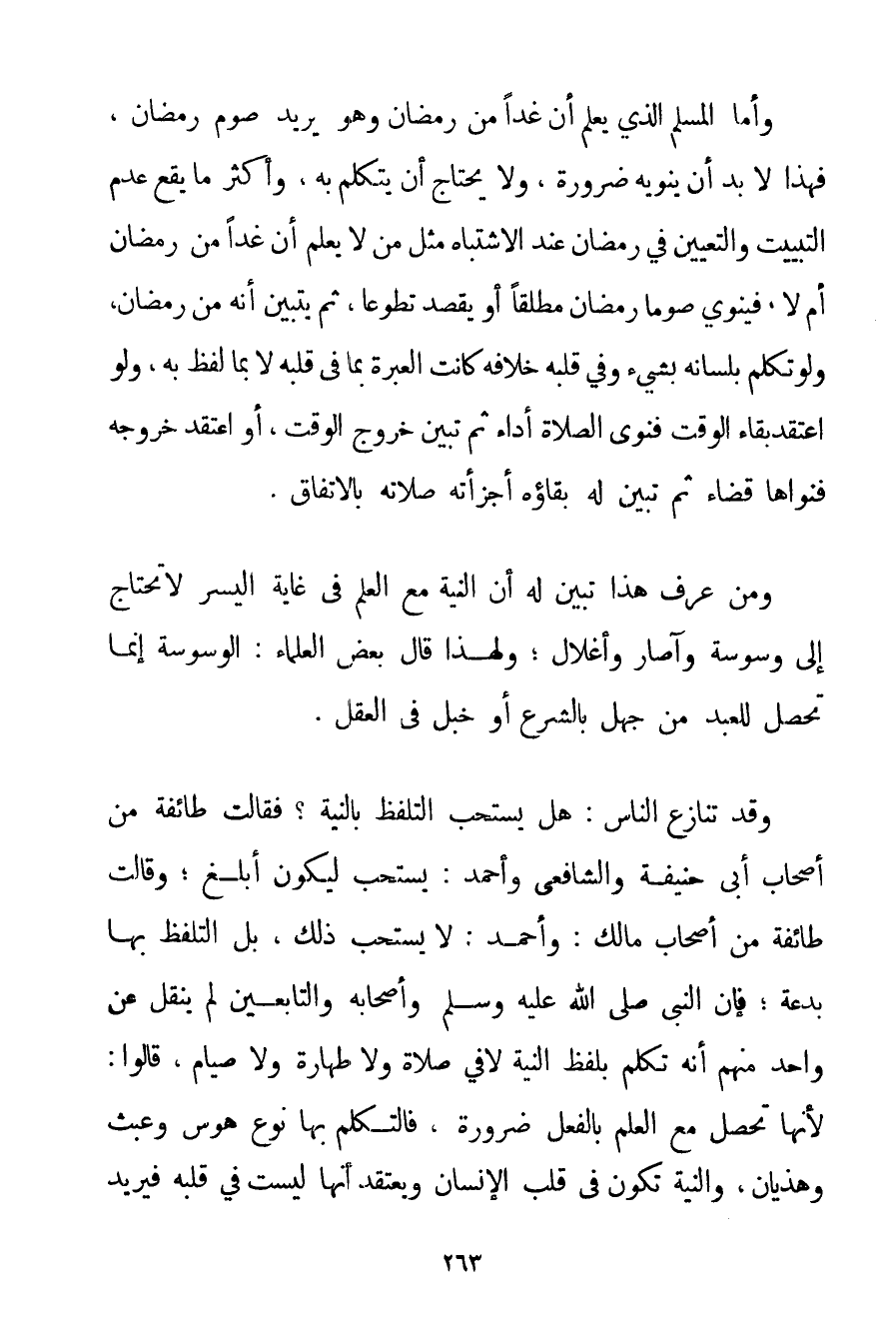 وَأَمَّا الْمُسْلِمُ الَّذِي يَعْلَمُ أَنَّ غَدًا مِنْ رَمَضَانَ وَهُوَ يُرِيدُ صَوْمَ رَمَضَانَ فَهَذَا لَا بُدَّ أَنْ يَنْوِيَهُ ضَرُورَةً وَلَا يَحْتَاجَ أَنْ يَتَكَلَّمَ بِهِ وَأَكْثَرُ مَا يَقَعُ عَدَمُ التَّبْيِيتِ وَالتَّعْيِينِ فِي رَمَضَانَ عِنْدَ الِاشْتِبَاهِ مِثْلَ مَنْ لَا يَعْلَمُ أَنَّ غَدًا مِنْ رَمَضَانَ أَمْ لَا فَيَنْوِي صَوْمًا رَمَضَانَ مُطْلَقًا أَوْ يَقْصِدُ تَطَوُّعًا ثُمَّ يَتَبَيَّنُ أَنَّهُ مِنْ رَمَضَانَ وَلَوْ تَكَلَّمَ بِلِسَانِهِ بِشَيْءِ وَفِي قَلْبِهِ خِلَافُهُ كَانَتْ الْعِبْرَةُ بِمَا فِي قَلْبِهِ لَا بِمَا لَفَظَ بِهِ وَلَوْ اعْتَقَدَ بَقَاءَ الْوَقْتِ فَنَوَى الصَّلَاةَ أَدَاءً ثُمَّ تَبَيَّنَ خُرُوجُ الْوَقْتِ أَوْ اعْتَقَدَ خُرُوجَهُ فَنَوَاهَا قَضَاءً ثُمَّ تَبَيَّنَ لَهُ بَقَاؤُهُ أَجْزَأَتْهُ صَلَاتُهُ بِالِاتِّفَاقِ. وَمَنْ عَرَفَ هَذَا تَبَيَّنَ لَهُ أَنَّ النِّيَّةَ مَعَ الْعِلْمِ فِي غَايَةِ الْيُسْرِ لَا تَحْتَاجُ إلَى وَسْوَسَةٍ وَآصَارٍ وَأَغْلَالٍ؛ وَلِهَذَا قَالَ بَعْضُ الْعُلَمَاءِ: الْوَسْوَسَةُ إنَّمَا تَحْصُلُ لِعَبْدِ مِنْ جَهْلٍ بِالشَّرْعِ أَوْ خَبَلٍ فِي الْعَقْلِ. وَقَدْ تَنَازَعَ النَّاسُ: هَلْ يُسْتَحَبُّ التَّلَفُّظُ بِالنِّيَّةِ؟ فَقَالَتْ طَائِفَةٌ مِنْ أَصْحَابِ أَبِي حَنِيفَةَ وَالشَّافِعِيِّ وَأَحْمَد: يُسْتَحَبُّ لِيَكُونَ أَبْلَغَ؛ وَقَالَتْ طَائِفَةٌ مِنْ أَصْحَابِ مَالِكٍ وَأَحْمَد: لَا يُسْتَحَبُّ لِيَكُونَ بَلْ التَّلَفُّظُ بِهَا بِدْعَةٌ؛ فَإِنَّ النَّبِيَّ صَلَّى اللَّهُ عَلَيْهِ وَسَلَّمَ وَأَصْحَابَهُ وَالتَّابِعِينَ لَمْ يُنْقَلْ عَنْ وَاحِدٍ مِنْهُمْ أَنَّهُ تَكَلَّمَ بِلَفْظِ النِّيَّةِ لَا فِي صَلَاةٍ وَلَا طَهَارَةٍ وَلَا صِيَامٍ قَالُوا: لِأَنَّهَا تَحْصُلُ مَعَ الْعِلْمِ بِالْفِعْلِ ضَرُورَةً فَالتَّكَلُّمُ بِهَا نَوْعُ هَوَسٍ وَعَبَثٍ وَهَذَيَانٍ وَالنِّيَّةُ تَكُونُ فِي قَلْبِ الْإِنْسَانِ وَيَعْتَقِدُ أَنَّهَا لَيْسَتْ فِي قَلْبِهِ فَيُرِيدُ
