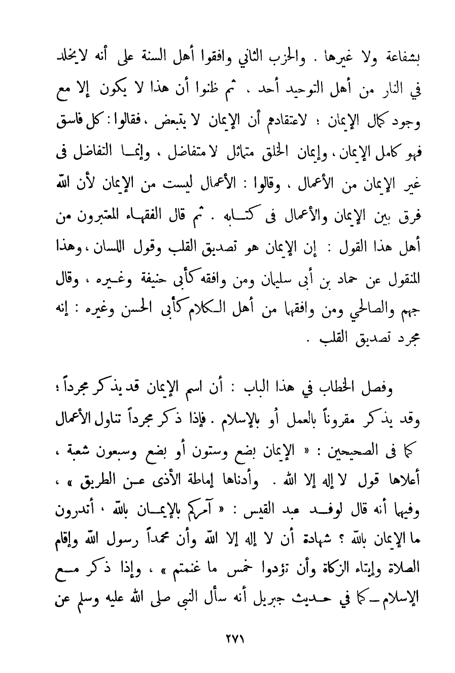 بِشَفَاعَةِ وَلَا غَيْرِهَا. وَالْحِزْبُ الثَّانِي وَافَقُوا أَهْلَ السُّنَّةِ عَلَى أَنَّهُ لَا يُخَلَّدُ فِي النَّارِ مِنْ أَهْلِ التَّوْحِيدِ أَحَدٌ ثُمَّ ظَنُّوا أَنَّ هَذَا لَا يَكُونُ إلَّا مَعَ وُجُودِ كَمَالِ الْإِيمَانِ؛ لِاعْتِقَادِهِمْ أَنَّ الْإِيمَانَ لَا يَتَبَعَّضُ فَقَالُوا: كُلُّ فَاسِقٍ فَهُوَ كَامِلُ الْإِيمَانِ وَإِيمَانُ الْخَلْقِ مُتَمَاثِلٌ لَا مُتَفَاضِلٌ وَإِنَّمَا التَّفَاضُلُ فِي غَيْرِ الْإِيمَانِ مِنْ الْأَعْمَالِ وَقَالُوا: الْأَعْمَالُ لَيْسَتْ مِنْ الْإِيمَانِ لِأَنَّ اللَّهَ فَرَّقَ بَيْنَ الْإِيمَانِ وَالْأَعْمَالِ فِي كِتَابِهِ. ثُمَّ قَالَ الْفُقَهَاءُ الْمُعْتَبِرُونَ مِنْ أَهْلِ هَذَا الْقَوْلِ: إنَّ الْإِيمَانَ هُوَ تَصْدِيقُ الْقَلْبِ وَقَوْلُ اللِّسَانِ وَهَذَا الْمَنْقُولُ عَنْ حَمَّادِ بْنِ أَبِي سُلَيْمَانَ وَمَنْ وَافَقَهُ كَأَبِي حَنِيفَةَ وَغَيْرِهِ وَقَالَ جَهْمٌ وَالصَّالِحِيَّ وَمَنْ وَافَقَهُمَا مِنْ أَهْلِ الْكَلَامِ كَأَبِي الْحَسَنِ وَغَيْرِهِ: إنَّهُ مُجَرَّدُ تَصْدِيقِ الْقَلْبِ.