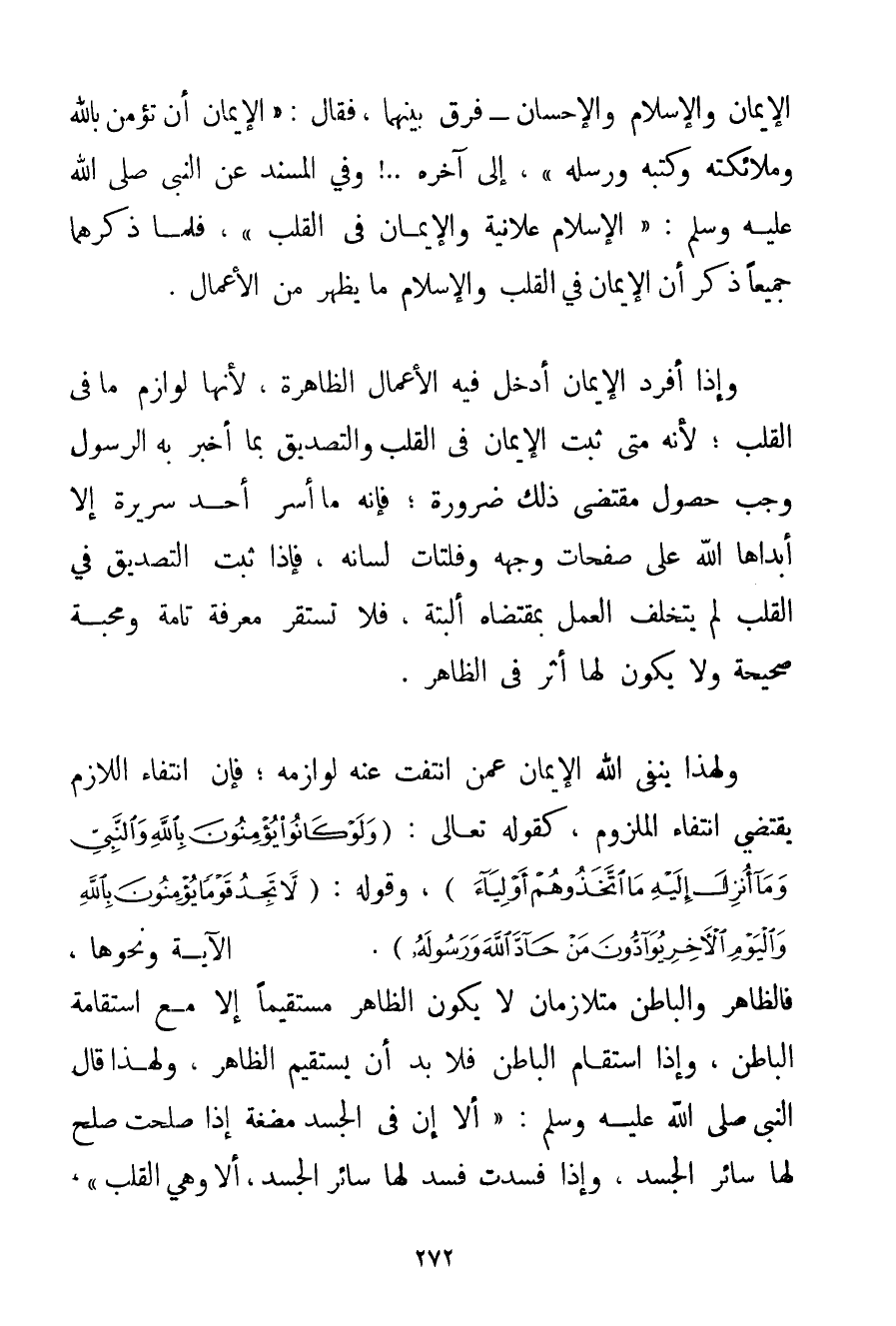الْإِيمَانِ وَالْإِسْلَامِ وَالْإِحْسَانِ - فَرَّقَ بَيْنَهُمَا فَقَالَ: الْإِيمَانُ أَنْ تُؤْمِنَ بِاَللَّهِ وَمَلَائِكَتِهِ وَكُتُبِهِ وَرُسُلِهِ} إلَى آخِرِهِ. . وَفِي الْمُسْنَدِ عَنْ النَّبِيِّ صَلَّى اللَّهُ عَلَيْهِ وَسَلَّمَ {الْإِسْلَامُ عَلَانِيَةٌ وَالْإِيمَانُ فِي الْقَلْبِ} فَلَمَّا ذَكَرَهُمَا جَمِيعًا ذَكَرَ أَنَّ الْإِيمَانَ فِي الْقَلْبِ وَالْإِسْلَامِ مَا يَظْهَرُ مِنْ الْأَعْمَالِ. وَإِذَا أَفْرَدَ الْإِيمَانَ أَدْخَلَ فِيهِ الْأَعْمَالَ الظَّاهِرَةَ لِأَنَّهَا لَوَازِمُ مَا فِي الْقَلْبِ؛ لِأَنَّهُ مَتَى ثَبَتَ الْإِيمَانُ فِي الْقَلْبِ وَالتَّصْدِيقُ بِمَا أَخْبَرَ بِهِ الرَّسُولُ وَجَبَ حُصُولُ مُقْتَضِي ذَلِكَ ضَرُورَةً؛ فَإِنَّهُ مَا أَسَرَّ أَحَدٌ سَرِيرَةً إلَّا أَبْدَاهَا اللَّهُ عَلَى صَفَحَاتِ وَجْهِهِ وَفَلَتَاتِ لِسَانِهِ فَإِذَا ثَبَتَ التَّصْدِيقُ فِي الْقَلْبِ لَمْ يَتَخَلَّفْ الْعَمَلُ بِمُقْتَضَاهُ أَلْبَتَّةَ فَلَا تَسْتَقِرُّ مَعْرِفَةٌ تَامَّةٌ وَمَحَبَّةٌ صَحِيحَةٌ وَلَا يَكُونُ لَهَا أَثَرٌ فِي الظَّاهِرِ. وَلِهَذَا يَنْفِي اللَّهُ الْإِيمَانَ عَمَّنْ انْتَفَتْ عَنْهُ لَوَازِمُهُ؛ فَإِنَّ انْتِفَاءَ اللَّازِمِ يَقْتَضِي انْتِفَاءَ الْمَلْزُومِ كَقَوْلِهِ تَعَالَى: {وَلَوْ كَانُوا يُؤْمِنُونَ بِاللَّهِ وَالنَّبِيِّ وَمَا أُنْزِلَ إلَيْهِ مَا اتَّخَذُوهُمْ أَوْلِيَاءَ} وَقَوْلِهِ: {لَا تَجِدُ قَوْمًا يُؤْمِنُونَ بِاللَّهِ وَالْيَوْمِ الْآخِرِ يُوَادُّونَ مَنْ حَادَّ اللَّهَ وَرَسُولَهُ} الْآيَةَ وَنَحْوَهَا فَالظَّاهِرُ وَالْبَاطِنُ مُتَلَازِمَانِ لَا يَكُونُ الظَّاهِرُ مُسْتَقِيمًا إلَّا مَعَ اسْتِقَامَةِ الْبَاطِنِ وَإِذَا اسْتَقَامَ الْبَاطِنُ فَلَا بُدَّ أَنْ يَسْتَقِيمَ الظَّاهِرُ وَلِهَذَا قَالَ النَّبِيُّ صَلَّى اللَّهُ عَلَيْهِ وَسَلَّمَ {أَلَا إنَّ فِي الْجَسَدِ مُضْغَةً إذَا صَلَحَتْ صَلَحَ لَهَا سَائِرُ الْجَسَدِ وَإِذَا فَسَدَتْ فَسَدَ لَهَا سَائِرُ الْجَسَدِ أَلَا وَهِيَ الْقَلْبُ}