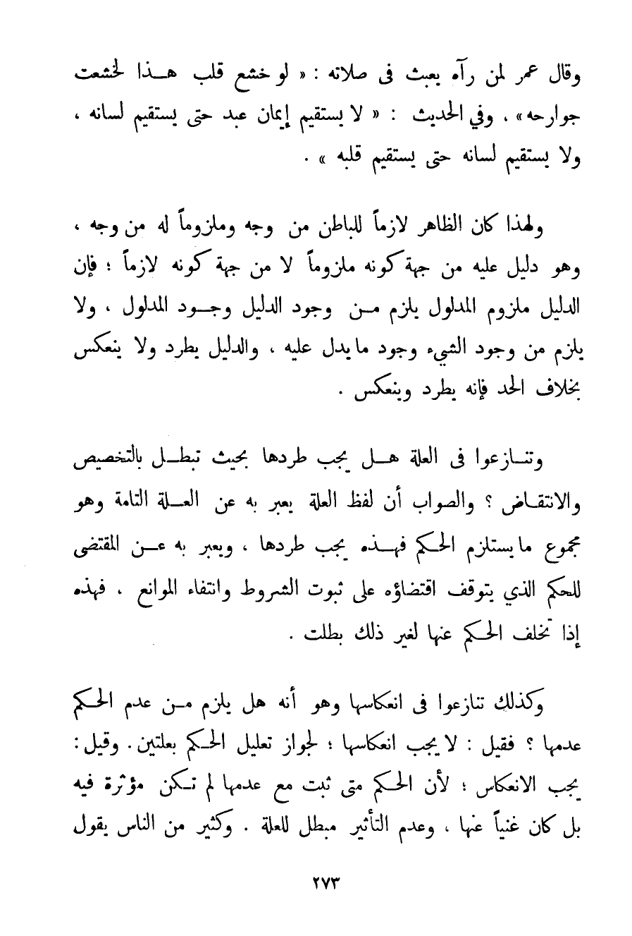 وَقَالَ عُمَرُ لِمَنْ رَآهُ يَعْبَثُ فِي صَلَاتِهِ: لَوْ خَشَعَ قَلْبُ هَذَا لَخَشَعَتْ جَوَارِحُهُ وَفِي الْحَدِيثِ: {لَا يَسْتَقِيمُ إيمَانُ عَبْدٍ حَتَّى يَسْتَقِيمَ لِسَانُهُ وَلَا يَسْتَقِيمُ لِسَانُهُ حَتَّى يَسْتَقِيمَ قَلْبُهُ} . وَلِهَذَا كَانَ الظَّاهِرُ لَازِمًا لِلْبَاطِنِ مِنْ وَجْهٍ وَمَلْزُومًا لَهُ مِنْ وَجْهٍ وَهُوَ دَلِيلٌ عَلَيْهِ مِنْ جِهَةِ كَوْنِهِ مَلْزُومًا لَا مِنْ جِهَةِ كَوْنِهِ لَازِمًا؛ فَإِنَّ الدَّلِيلَ مَلْزُومُ الْمَدْلُولِ يَلْزَمُ مِنْ وُجُودِ الدَّلِيلِ وُجُودُ الْمَدْلُولِ وَلَا يَلْزَمُ مِنْ وُجُودِ الشَّيْءِ وُجُودُ مَا يَدُلُّ عَلَيْهِ وَالدَّلِيلُ يَطَّرِدُ وَلَا يَنْعَكِسُ بِخِلَافِ الْحَدِّ فَإِنَّهُ يَطَّرِدُ وَيَنْعَكِسُ. وَتَنَازَعُوا فِي الْعِلَّةِ هَلْ يَجِبُ طَرْدُهَا بِحَيْثُ تَبْطُلُ بِالتَّخْصِيصِ وَالِانْتِقَاضِ؟ وَالصَّوَابُ أَنَّ لَفْظَ الْعِلَّةِ يُعَبَّرُ بِهِ عَنْ الْعِلَّةِ التَّامَّةِ وَهُوَ مَجْمُوعُ مَا يَسْتَلْزِمُ الْحُكْمَ فَهَذِهِ يَجِبُ طَرْدُهَا وَيُعَبَّرُ بِهِ عَنْ الْمُقْتَضِي لِلْحُكْمِ الَّذِي يَتَوَقَّفُ اقْتِضَاؤُهُ عَلَى ثُبُوتِ الشُّرُوطِ وَانْتِفَاءِ الْمَوَانِعِ فَهَذِهِ إذَا تَخَلَّفَ الْحُكْمُ عَنْهَا لِغَيْرِ ذَلِكَ بَطَلَتْ. وَكَذَلِكَ تَنَازَعُوا فِي انْعِكَاسِهَا وَهُوَ أَنَّهُ هَلْ يَلْزَمُ مِنْ عَدَمِ الْحُكْمِ عَدَمُهَا؟ فَقِيلَ: لَا يَجِبُ انْعِكَاسُهَا؛ لِجَوَازِ تَعْلِيلِ الْحُكْمِ بِعِلَّتَيْنِ. وَقِيلَ: يَجِبُ الِانْعِكَاسُ؛ لِأَنَّ الْحُكْمَ مَتَى ثَبَتَ مَعَ عَدَمِهَا لَمْ تَكُنْ مُؤَثِّرَةً فِيهِ بَلْ كَانَ غَنِيًّا عَنْهَا وَعَدَمُ التَّأْثِيرِ مُبْطِلٌ لِلْعِلَّةِ. وَكَثِيرٌ مِنْ النَّاسِ يَقُولُ