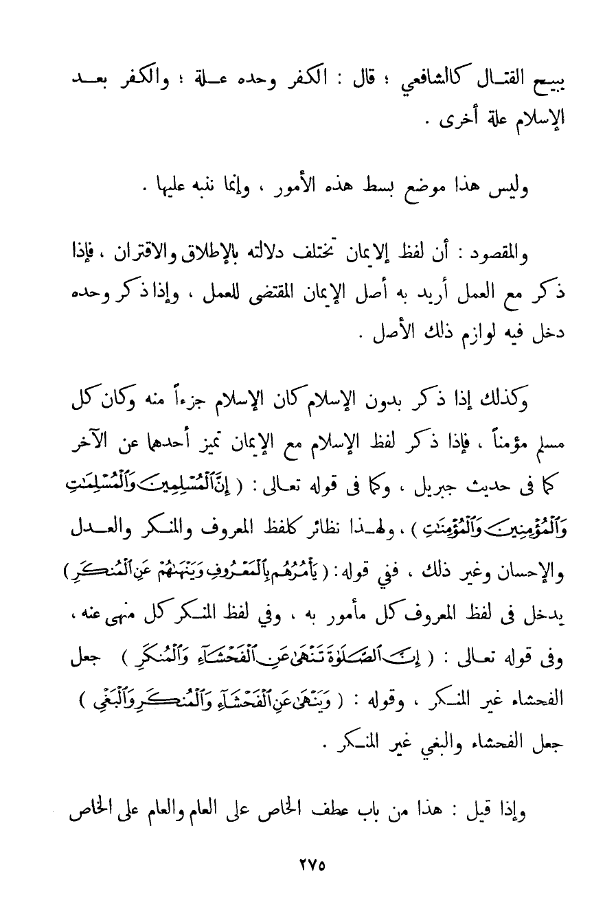 يُبِيحُ الْقِتَالَ كَالشَّافِعِيِّ؛ قَالَ: الْكُفْرُ وَحْدَهُ عِلَّةٌ؛ وَالْكُفْرُ بَعْدَ الْإِسْلَامِ عِلَّةٌ أُخْرَى. وَلَيْسَ هَذَا مَوْضِعَ بَسْطِ هَذِهِ الْأُمُورِ وَإِنَّمَا نُنَبِّهُ عَلَيْهَا. وَالْمَقْصُودُ: أَنَّ لَفْظَ الْإِيمَانِ تَخْتَلِفُ دَلَالَتُهُ بِالْإِطْلَاقِ وَالِاقْتِرَانِ فَإِذَا ذُكِرَ مَعَ الْعَمَلِ أُرِيدَ بِهِ أَصْلُ الْإِيمَانِ الْمُقْتَضِي لِلْعَمَلِ وَإِذَا ذُكِرَ وَحْدَهُ دَخَلَ فِيهِ لَوَازِمُ ذَلِكَ الْأَصْلِ. وَكَذَلِكَ إذَا ذُكِرَ بِدُونِ الْإِسْلَامِ كَانَ الْإِسْلَامُ جُزْءًا مِنْهُ وَكَانَ كُلُّ مُسْلِمٍ مُؤْمِنًا فَإِذَا ذَكَرَ لَفْظَ الْإِسْلَامِ مَعَ الْإِيمَانِ تَمَيَّزَ أَحَدُهُمَا عَنْ الْآخَرِ كَمَا فِي حَدِيثِ جِبْرِيلَ وَكَمَا فِي قَوْله تَعَالَى {إنَّ الْمُسْلِمِينَ وَالْمُسْلِمَاتِ وَالْمُؤْمِنِينَ وَالْمُؤْمِنَاتِ} وَلِهَذَا نَظَائِرُ كَلَفْظِ الْمَعْرُوفِ وَالْمُنْكَرِ وَالْعَدْلِ وَالْإِحْسَانِ وَغَيْرِ ذَلِكَ فَفِي قَوْلِهِ: {يَأْمُرُهُمْ بِالْمَعْرُوفِ وَيَنْهَاهُمْ عَنِ الْمُنْكَرِ} يَدْخُلُ فِي لَفْظِ الْمَعْرُوفِ كُلُّ مَأْمُورٍ بِهِ وَفِي لَفْظِ الْمُنْكَرِ كُلُّ مَنْهِيٍّ عَنْهُ وَفِي قَوْله تَعَالَى {إنَّ الصَّلَاةَ تَنْهَى عَنِ الْفَحْشَاءِ وَالْمُنْكَرِ} جَعَلَ الْفَحْشَاءَ غَيْرَ الْمُنْكَرِ وَقَوْلِهِ: {وَيَنْهَى عَنِ الْفَحْشَاءِ وَالْمُنْكَرِ وَالْبَغْيِ} جَعَلَ الْفَحْشَاءَ وَالْبَغْيَ غَيْرَ الْمُنْكَرِ. وَإِذَا قِيلَ: هَذَا مِنْ بَابِ عَطْفِ الْخَاصِّ عَلَى الْعَامِّ وَالْعَامِّ عَلَى الْخَاصِّ