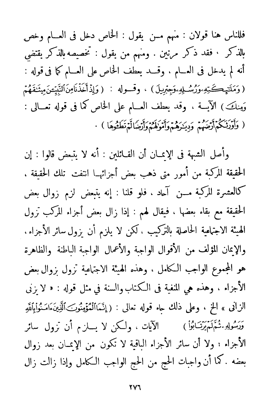 فَلِلنَّاسِ هُنَا قَوْلَانِ: مِنْهُمْ مَنْ يَقُولُ: الْخَاصُّ دَخَلَ فِي الْعَامِّ وَخُصَّ بِالذِّكْرِ فَقَدْ ذُكِرَ مَرَّتَيْنِ. وَمِنْهُمْ مَنْ يَقُولُ: تَخْصِيصُهُ بِالذِّكْرِ يَقْتَضِي أَنَّهُ لَمْ يَدْخُلْ فِي الْعَامِّ وَقَدْ يَعْطِفُ الْخَاصَّ عَلَى الْعَامِّ كَمَا فِي قَوْلِهِ: {وَمَلَائِكَتِهِ وَرُسُلِهِ وَجِبْرِيلَ} وَقَوْلِهِ: {وَإِذْ أَخَذْنَا مِنَ النَّبِيِّينَ مِيثَاقَهُمْ وَمِنْكَ} الْآيَةَ وَقَدْ يَعْطِفُ الْعَامَّ عَلَى الْخَاصِّ كَمَا فِي قَوْله تَعَالَى {وَأَوْرَثَكُمْ أَرْضَهُمْ وَدِيَارَهُمْ وَأَمْوَالَهُمْ وَأَرْضًا لَمْ تَطَئُووهَا} . وَأَصْلُ الشُّبْهَةِ فِي الْإِيمَانِ أَنَّ الْقَائِلِينَ: أَنَّهُ لَا يَتَبَعَّضُ قَالُوا: إنَّ الْحَقِيقَةَ الْمُرَكَّبَةَ مِنْ أُمُورٍ مَتَى ذَهَبَ بَعْضُ أَجْزَائِهَا انْتَفَتْ تِلْكَ الْحَقِيقَةُ كَالْعَشَرَةِ الْمُرَكَّبَةِ مِنْ آحَادٍ فَلَوْ قُلْنَا: إنَّهُ يَتَبَعَّضُ لَزِمَ زَوَالُ بَعْضِ الْحَقِيقَةِ مَعَ بَقَاءِ بَعْضِهَا فَيُقَالُ لَهُمْ.: إذَا زَالَ بَعْضُ أَجْزَاءِ الْمُرَكَّبِ تَزُولُ الْهَيْئَةُ الِاجْتِمَاعِيَّةُ الْحَاصِلَةُ بِالتَّرْكِيبِ لَكِنْ لَا يَلْزَمُ أَنْ يَزُولَ سَائِرُ الْأَجْزَاءِ وَالْإِيمَانُ الْمُؤَلَّفُ مِنْ الْأَقْوَالِ الْوَاجِبَةِ وَالْأَعْمَالِ الْوَاجِبَةِ الْبَاطِنَةِ وَالظَّاهِرَةِ هُوَ الْمَجْمُوعُ الْوَاجِبُ الْكَامِلُ وَهَذِهِ الْهَيْئَةُ الِاجْتِمَاعِيَّةُ تَزُولُ بِزَوَالِ بَعْضِ الْأَجْزَاءِ وَهَذِهِ هِيَ الْمَنْفِيَّةُ فِي الْكِتَابِ وَالسُّنَّةِ فِي مِثْلِ قَوْلِهِ: {لَا يَزْنِي الزَّانِي} إلَخْ وَعَلَى ذَلِكَ جَاءَ قَوْله تَعَالَى {إنَّمَا الْمُؤْمِنُونَ الَّذِينَ آمَنُوا بِاللَّهِ وَرَسُولِهِ ثُمَّ لَمْ يَرْتَابُوا} الْآيَاتِ وَلَكِنْ لَا يَلْزَمُ أَنْ تَزُولَ سَائِرُ الْأَجْزَاءِ؛ وَلَا أَنَّ سَائِرَ الْأَجْزَاءِ الْبَاقِيَةِ لَا تَكُونُ مِنْ الْإِيمَانِ بَعْدَ زَوَالِ بَعْضِهِ. كَمَا أَنَّ وَاجِبَاتِ الْحَجِّ مِنْ الْحَجِّ الْوَاجِبِ الْكَامِلِ وَإِذَا زَالَتْ زَالَ