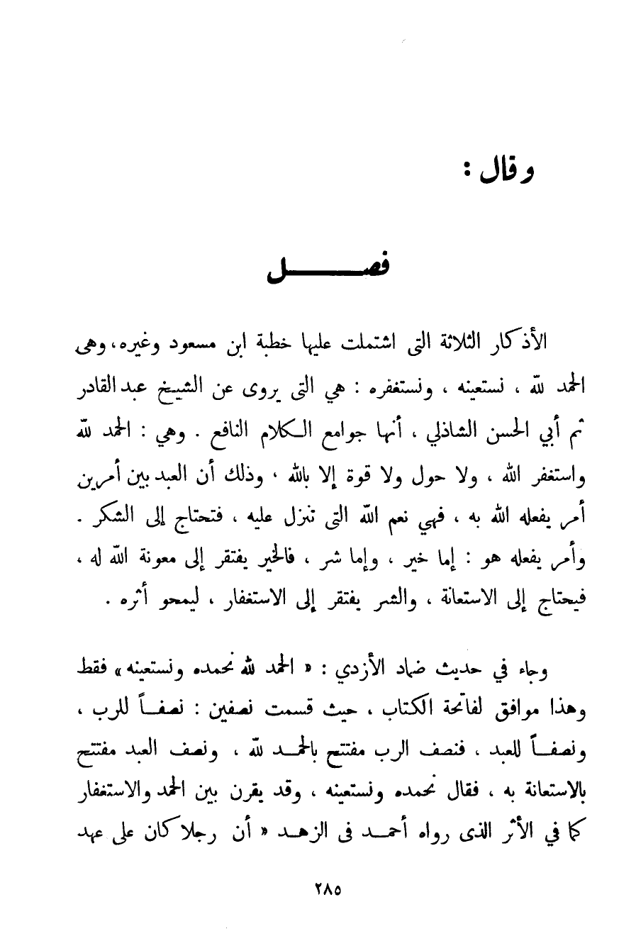 الْأَذْكَارُ الثَّلَاثَةُ الَّتِي اشْتَمَلَتْ عَلَيْهَا خُطْبَةُ ابْنِ مَسْعُودٍ وَغَيْرِهِ وَهِيَ الْحَمْدُ لِلَّهِ نَسْتَعِينُهُ وَنَسْتَغْفِرُهُ: هِيَ الَّتِي يُرْوَى عَنْ الشَّيْخِ عَبْدِ الْقَادِرِ ثُمَّ أَبِي الْحَسَنِ الشاذلي أَنَّهَا جَوَامِعُ الْكَلَامِ النَّافِعِ. وَهِيَ: الْحَمْدُ لِلَّهِ وَأَسْتَغْفِرُ اللَّهَ وَلَا حَوْلَ وَلَا قُوَّةَ إلَّا بِاَللَّهِ وَذَلِكَ أَنَّ الْعَبْدَ بَيْن أَمْرَيْنِ أَمْرٍ يَفْعَلُهُ اللَّهُ بِهِ فَهِيَ نِعَمُ اللَّهِ الَّتِي تَنْزِلُ عَلَيْهِ فَتَحْتَاجُ إلَى الشُّكْرِ. وَأَمْرٍ يَفْعَلُهُ هُوَ: إمَّا خَيْرٌ وَإِمَّا شَرٌّ فَالْخَيْرُ يَفْتَقِرُ إلَى مَعُونَةِ اللَّهِ لَهُ فَيَحْتَاجُ إلَى الِاسْتِعَانَةِ وَالشَّرُّ يَفْتَقِرُ إلَى الِاسْتِغْفَارِ لِيَمْحُوَ أَثَرَهُ. وَجَاءَ فِي حَدِيثِ ضِمَادٍ الأزدي: {الْحَمْدُ لِلَّهِ نَحْمَدُهُ وَنَسْتَعِينُهُ} فَقَطْ وَهَذَا مُوَافِقٌ لِفَاتِحَةِ الْكِتَابِ حَيْثُ قُسِّمَتْ نِصْفَيْنِ: نِصْفًا لِلرَّبِّ وَنِصْفًا لِلْعَبْدِ فَنِصْفُ الرَّبِّ مُفْتَتَحٌ بِالْحَمْدِ لِلَّهِ وَنِصْفُ الْعَبْدِ مُفْتَتَحٌ بِالِاسْتِعَانَةِ بِهِ فَقَالَ نَحْمَدُهُ وَنَسْتَعِينُهُ وَقَدْ يُقْرَنُ بَيْنَ الْحَمْدِ وَالِاسْتِغْفَارِ كَمَا فِي الْأَثَرِ الَّذِي رَوَاهُ أَحْمَد فِي الزُّهْدِ " أَنَّ رَجُلًا كَانَ عَلَى عَهْدِ