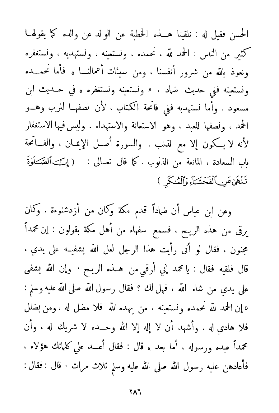 الْحَسَنِ فَقِيلَ لَهُ: تَلَقَّيْنَا هَذِهِ الْخُطْبَةَ عَنْ الْوَالِدِ عَنْ وَالِدِهِ كَمَا يَقُولُهَا كَثِيرٌ مَنْ النَّاسِ: الْحَمْدُ لِلَّهِ نَحْمَدُهُ وَنَسْتَعِينُهُ وَنَسْتَهْدِيهِ وَنَسْتَغْفِرُهُ وَنَعُوذُ بِاَللَّهِ مِنْ شُرُورِ أَنْفُسِنَا وَمِنْ سَيِّئَاتِ أَعْمَالِنَا " فَأَمَّا نَحْمَدُهُ وَنَسْتَعِينُهُ فَفِي حَدِيثِ ضِمَادٍ {وَنَسْتَعِينُهُ وَنَسْتَغْفِرُهُ} فِي حَدِيثِ ابْنِ مَسْعُودٍ. وَأَمَّا نَسْتَهْدِيهِ فَفِي فَاتِحَةِ الْكِتَابِ لِأَنَّ نِصْفَهَا لِلرَّبِّ وَهُوَ الْحَمْدُ وَنِصْفَهَا لِلْعَبْدِ وَهُوَ الِاسْتِعَانَةُ وَالِاسْتِهْدَاءُ وَلَيْسَ فِيهَا الِاسْتِغْفَارُ لِأَنَّهُ لَا يَكُونُ إلَّا مَعَ الذَّنْبِ وَالسُّورَةُ أَصْلُ الْإِيمَانِ وَالْفَاتِحَةُ بَابُ السَّعَادَةِ الْمَانِعَةُ مِنْ الذُّنُوبِ. كَمَا قَالَ تَعَالَى: {إنَّ الصَّلَاةَ تَنْهَى عَنِ الْفَحْشَاءِ وَالْمُنْكَرِ} {وَعَنْ ابْنِ عَبَّاسٍ أَنَّ ضِمَادًا قَدِمَ مَكَّةَ وَكَانَ مِنْ أزدشنوءة. وَكَانَ يَرْقِي مِنْ هَذِهِ الرِّيحِ فَسَمِعَ سُفَهَاءَ مِنْ أَهْلِ مَكَّةَ يَقُولُونَ: إنَّ مُحَمَّدًا مَجْنُونٌ فَقَالَ لَوْ أَنِّي رَأَيْت هَذَا الرَّجُلَ لَعَلَّ اللَّهَ يَشْفِيهِ عَلَى يَدَيَّ قَالَ فَلَقِيَهُ فَقَالَ: يَا مُحَمَّدُ إنِّي أَرْقِي مِنْ هَذِهِ الرِّيحِ وَإِنَّ اللَّهَ يَشْفِي عَلَى يَدَيَّ مَنْ شَاءَ اللَّهُ فَهَلْ لَك؟ فَقَالَ رَسُولُ اللَّهِ صَلَّى اللَّهُ عَلَيْهِ وَسَلَّمَ إنَّ الْحَمْدَ لِلَّهِ نَحْمَدُهُ وَنَسْتَعِينُهُ مَنْ يَهْدِهِ اللَّهُ فَلَا مُضِلَّ لَهُ وَمَنْ يُضْلِلْ فَلَا هَادِيَ لَهُ وَأَشْهَدُ أَنْ لَا إلَهَ إلَّا اللَّهُ وَحْدَهُ لَا شَرِيكَ لَهُ وَأَنَّ مُحَمَّدًا عَبْدُهُ وَرَسُولُهُ أَمَّا بَعْدُ قَالَ: فَقَالَ أَعِدْ عَلَيَّ كَلِمَاتِك هَؤُلَاءِ فَأَعَادَهُنَّ عَلَيْهِ رَسُولُ اللَّهِ صَلَّى اللَّهُ عَلَيْهِ وَسَلَّمَ ثَلَاثَ مَرَّاتٍ قَالَ: فَقَالَ: