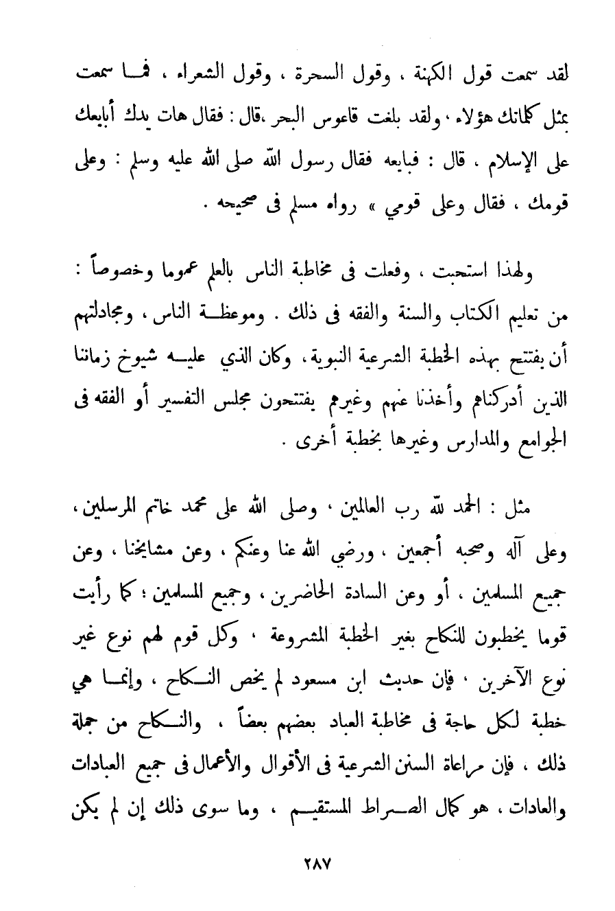 لَقَدْ سَمِعْت قَوْلَ الْكَهَنَةِ وَقَوْلَ السَّحَرَةِ وَقَوْلَ الشُّعَرَاءِ فَمَا سَمِعْت بِمِثْلِ كَلِمَاتِك هَؤُلَاءِ وَلَقَدْ بَلَغْت ناعوس الْبَحْرِ قَالَ: فَقَالَ هَاتِ يَدَك أُبَايِعْك عَلَى الْإِسْلَامِ قَالَ: فَبَايَعَهُ فَقَالَ رَسُولُ اللَّهِ صَلَّى اللَّهُ عَلَيْهِ وَسَلَّمَ وَعَلَى قَوْمِك فَقَالَ وَعَلَى قَوْمِي} رَوَاهُ مُسْلِمٌ فِي صَحِيحِهِ. وَلِهَذَا اُسْتُحِبَّتْ وَفُعِلَتْ فِي مُخَاطَبَةِ النَّاسِ بِالْعِلْمِ عُمُومًا وَخُصُوصًا: مِنْ تَعْلِيمِ الْكِتَابِ وَالسُّنَّةِ وَالْفِقْهِ فِي ذَلِكَ. وَمَوْعِظَةِ النَّاسِ وَمُجَادَلَتِهِمْ أَنْ يَفْتَتِحَ بِهَذِهِ الْخُطْبَةِ الشَّرْعِيَّةِ النَّبَوِيَّةِ وَكَانَ الَّذِي عَلَيْهِ شُيُوخُ زَمَانِنَا الَّذِينَ أَدْرَكْنَاهُمْ وَأَخَذْنَا عَنْهُمْ وَغَيْرِهِمْ يَفْتَتِحُونَ مَجْلِسَ التَّفْسِيرِ أَوْ الْفِقْهِ فِي الْجَوَامِعِ وَالْمَدَارِسِ وَغَيْرِهَا بِخُطْبَةِ أُخْرَى. مِثْلَ: الْحَمْدُ لِلَّهِ رَبِّ الْعَالَمِينَ وَصَلَّى اللَّهُ عَلَى مُحَمَّدٍ خَاتَمِ الْمُرْسَلِينَ وَعَلَى آلِهِ وَصَحْبِهِ أَجْمَعِينَ وَرَضِيَ اللَّهُ عَنَّا وَعَنْكُمْ وَعَنْ مَشَايِخِنَا وَعَنْ جَمِيعِ الْمُسْلِمِينَ أَوْ وَعَنْ السَّادَةِ الْحَاضِرِينَ وَجَمِيعِ الْمُسْلِمِينَ؛ كَمَا رَأَيْت قَوْمًا يَخْطُبُونَ لِلنِّكَاحِ بِغَيْرِ الْخُطْبَةِ الْمَشْرُوعَةِ وَكُلُّ قَوْمٍ لَهُمْ نَوْعٌ غَيْرَ نَوْعِ الْآخَرِينَ فَإِنَّ حَدِيثَ ابْنِ مَسْعُودٍ لَمْ يَخُصَّ النِّكَاحَ وَإِنَّمَا هِيَ خُطْبَةٌ لِكُلِّ حَاجَةٍ فِي مُخَاطَبَةِ الْعِبَادِ بَعْضِهِمْ بَعْضًا وَالنِّكَاحُ مِنْ جُمْلَةِ ذَلِكَ فَإِنَّ مُرَاعَاةَ السُّنَنِ الشَّرْعِيَّةِ فِي الْأَقْوَالِ وَالْأَعْمَالِ فِي جَمِيعِ الْعِبَادَاتِ وَالْعَادَاتِ هُوَ كَمَالُ الصِّرَاطِ الْمُسْتَقِيمِ وَمَا سِوَى ذَلِكَ إنْ لَمْ يَكُنْ