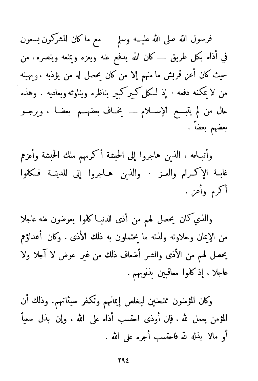 فَرَسُولُ اللَّهِ صَلَّى اللَّهُ عَلَيْهِ وَسَلَّمَ - مَعَ مَا كَانَ الْمُشْرِكُونَ يَسْعَوْنَ فِي أَذَاهُ بِكُلِّ طَرِيقٍ - كَانَ اللَّهُ يَدْفَعُ عَنْهُ وَيُعِزُّهُ وَيَمْنَعُهُ وَيَنْصُرُهُ مِنْ حَيْثُ كَانَ أَعَزَّ قُرَيْشٍ مَا مِنْهُمْ إلَّا مَنْ كَانَ يَحْصُلُ لَهُ مَنْ يُؤْذِيه وَيُهِينُهُ مَنْ لَا يُمْكِنُهُ دَفْعُهُ إذْ لِكُلِّ كَبِيرٍ كَبِيرٌ يُنَاظِرُهُ ويناويه وَيُعَادِيهِ. وَهَذِهِ حَالُ مَنْ لَمْ يَتَّبِعْ الْإِسْلَامَ - يَخَافُ بَعْضُهُمْ بَعْضًا وَيَرْجُو بَعْضُهُمْ بَعْضًا. وَأَتْبَاعُهُ الَّذِينَ هَاجَرُوا إلَى الْحَبَشَةِ أَكْرَمَهُمْ مَلِكُ الْحَبَشَةِ وَأَعَزَّهُمْ غَايَةَ الْإِكْرَامِ وَالْعِزِّ وَاَلَّذِينَ هَاجَرُوا إلَى الْمَدِينَةِ فَكَانُوا أَكْرَمَ وَأَعَزَّ. وَاَلَّذِي كَانَ يَحْصُلُ لَهُمْ مِنْ أَذَى الدُّنْيَا كَانُوا يُعَوَّضُونَ عَنْهُ عَاجِلًا مِنْ الْإِيمَانِ وَحَلَاوَتِهِ وَلَذَّتِهِ مَا يَحْتَمِلُونَ بِهِ ذَلِكَ الْأَذَى. وَكَانَ أَعْدَاؤُهُمْ يَحْصُلُ لَهُمْ مِنْ الْأَذَى وَالشَّرِّ أَضْعَافُ ذَلِكَ مِنْ غَيْرِ عِوَضٍ لَا آجِلًا وَلَا عَاجِلًا إذْ كَانُوا مُعَاقِبِينَ بِذُنُوبِهِمْ. وَكَانَ الْمُؤْمِنُونَ مُمْتَحِنِينَ لِيَخْلُصَ إيمَانُهُمْ وَتُكَفَّرَ سَيِّئَاتُهُمْ. وَذَلِكَ أَنَّ الْمُؤْمِنَ يَعْمَلُ لِلَّهِ فَإِنْ أُوذِيَ احْتَسَبَ أَذَاهُ عَلَى اللَّهِ وَإِنْ بَذَلَ سَعْيًا أَوْ مَالًا بَذَلَهُ لِلَّهِ فَاحْتَسَبَ أَجْرَهُ عَلَى اللَّهِ.