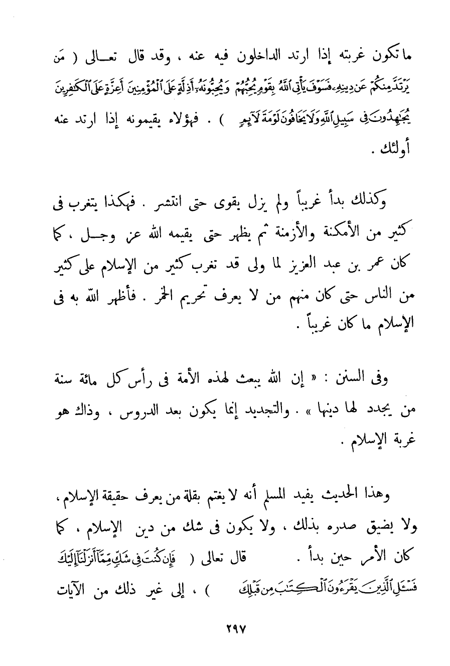 مَا تَكُونُ غُرْبَتُهُ إذَا ارْتَدَّ الدَّاخِلُونَ فِيهِ عَنْهُ وَقَدْ قَالَ تَعَالَى {مَنْ يَرْتَدَّ مِنْكُمْ عَنْ دِينِهِ فَسَوْفَ يَأْتِي اللَّهُ بِقَوْمٍ يُحِبُّهُمْ وَيُحِبُّونَهُ أَذِلَّةً عَلَى الْمُؤْمِنِينَ أَعِزَّةً عَلَى الْكَافِرِينَ يُجَاهِدُونَ فِي سَبِيلِ اللَّهِ وَلَا يَخَافُونَ لَوْمَةَ لَائِمٍ} . فَهَؤُلَاءِ يُقِيمُونَهُ إذَا ارْتَدَّ عَنْهُ أُولَئِكَ. وَكَذَلِكَ بَدَأَ غَرِيبًا وَلَمْ يَزَلْ يَقْوَى حَتَّى انْتَشَرَ. فَهَكَذَا يَتَغَرَّبُ فِي كَثِيرٍ مِنْ الْأَمْكِنَةِ وَالْأَزْمِنَةِ ثُمَّ يَظْهَرُ حَتَّى يُقِيمَهُ اللَّهُ عَزَّ وَجَلَّ كَمَا كَانَ عُمَرُ بْنُ عَبْدِ الْعَزِيزِ لَمَّا وُلِّيَ قَدْ تَغَرَّبَ كَثِيرٌ مِنْ الْإِسْلَامِ عَلَى كَثِيرٍ مِنْ النَّاسِ حَتَّى كَانَ مِنْهُمْ مَنْ لَا يَعْرِفُ تَحْرِيمَ الْخَمْرِ. فَأَظْهَرَ اللَّهُ بِهِ فِي الْإِسْلَامِ مَا كَانَ غَرِيبًا. وَفِي السُّنَنِ: {إنَّ اللَّهَ يَبْعَثُ لِهَذِهِ الْأُمَّةِ فِي رَأْسِ كُلِّ مِائَةِ سَنَةٍ مَنْ يُجَدِّدُ لَهَا دِينَهَا} . وَالتَّجْدِيدُ إنَّمَا يَكُونُ بَعْدَ الدُّرُوسِ وَذَاكَ هُوَ غُرْبَةُ الْإِسْلَامِ. وَهَذَا الْحَدِيثُ يُفِيدُ الْمُسْلِمَ أَنَّهُ لَا يَغْتَمُّ بِقِلَّةِ مَنْ يَعْرِفُ حَقِيقَةَ الْإِسْلَامِ وَلَا يَضِيقُ صَدْرُهُ بِذَلِكَ وَلَا يَكُونُ فِي شَكٍّ مِنْ دِينِ الْإِسْلَامِ كَمَا كَانَ الْأَمْرُ حِينَ بَدَأَ. قَالَ تَعَالَى {فَإِنْ كُنْتَ فِي شَكٍّ مِمَّا أَنْزَلْنَا إلَيْكَ فَاسْأَلِ الَّذِينَ يَقْرَءُونَ الْكِتَابَ مِنْ قَبْلِكَ} إلَى غَيْرِ ذَلِكَ مِنْ الْآيَاتِ