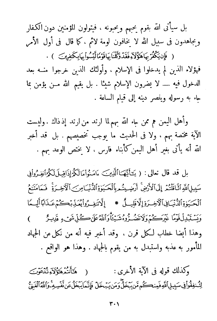 بَلْ سَيَأْتِي اللَّهُ بِقَوْمٍ يُحِبُّهُمْ وَيُحِبُّونَهُ فَيَتَوَلَّوْنَ الْمُؤْمِنِينَ دُونَ الْكُفَّارِ وَيُجَاهِدُونَ فِي سَبِيلِ اللَّهِ لَا يَخَافُونَ لَوْمَةَ لَائِمٍ كَمَا قَالَ فِي أَوَّلِ الْأَمْرِ {فَإِنْ يَكْفُرْ بِهَا هَؤُلَاءِ فَقَدْ وَكَّلْنَا بِهَا قَوْمًا لَيْسُوا بِهَا بِكَافِرِينَ} . فَهَؤُلَاءِ الَّذِينَ لَمْ يَدْخُلُوا فِي الْإِسْلَامِ وَأُولَئِكَ الَّذِينَ خَرَجُوا مِنْهُ بَعْدَ الدُّخُولِ فِيهِ - لَا يَضُرُّونَ الْإِسْلَامَ شَيْئًا. بَلْ يُقِيمُ اللَّهُ مَنْ يُؤْمِنُ بِمَا جَاءَ بِهِ رَسُولُهُ وَيَنْصُرُ دِينَهُ إلَى قِيَامِ السَّاعَةِ. وَأَهْلُ الْيَمَنِ هُمْ مِمَّنْ جَاءَ اللَّهُ بِهِمْ لَمَّا ارْتَدَّ مَنْ ارْتَدَّ إذْ ذَاكَ. وَلَيْسَتْ الْآيَةُ مُخْتَصَّةً بِهِمْ وَلَا فِي الْحَدِيثِ مَا يُوجِبُ تَخْصِيصَهُمْ. بَلْ قَدْ أَخْبَرَ اللَّهُ أَنَّهُ يَأْتِي بِغَيْرِ أَهْلِ الْيَمَنِ كَأَبْنَاءِ فَارِسَ لَا يَخْتَصُّ الْوَعْدُ بِهِمْ. بَلْ قَدْ قَالَ تَعَالَى: {يَا أَيُّهَا الَّذِينَ آمَنُوا مَا لَكُمْ إذَا قِيلَ لَكُمُ انْفِرُوا فِي سَبِيلِ اللَّهِ اثَّاقَلْتُمْ إلَى الْأَرْضِ أَرَضِيتُمْ بِالْحَيَاةِ الدُّنْيَا مِنَ الْآخِرَةِ فَمَا مَتَاعُ الْحَيَاةِ الدُّنْيَا فِي الْآخِرَةِ إلَّا قَلِيلٌ} {إلَّا تَنْفِرُوا يُعَذِّبْكُمْ عَذَابًا أَلِيمًا وَيَسْتَبْدِلْ قَوْمًا غَيْرَكُمْ وَلَا تَضُرُّوهُ شَيْئًا وَاللَّهُ عَلَى كُلِّ شَيْءٍ قَدِيرٌ} وَهَذَا أَيْضًا خِطَابٌ لِكُلِّ قَرْنٍ وَقَدْ أَخْبَرَ فِيهِ أَنَّهُ مَنْ نَكَلَ عَنْ الْجِهَادِ الْمَأْمُورِ بِهِ عَذَّبَهُ وَاسْتَبْدَلَ بِهِ مَنْ يَقُومُ بِالْجِهَادِ. وَهَذَا هُوَ الْوَاقِعُ. وَكَذَلِكَ قَوْلُهُ فِي الْآيَةِ الْأُخْرَى: {هَاأَنْتُمْ هَؤُلَاءِ تُدْعَوْنَ لِتُنْفِقُوا فِي سَبِيلِ اللَّهِ فَمِنْكُمْ مَنْ يَبْخَلُ وَمَنْ يَبْخَلْ فَإِنَّمَا يَبْخَلُ عَنْ نَفْسِهِ وَاللَّهُ