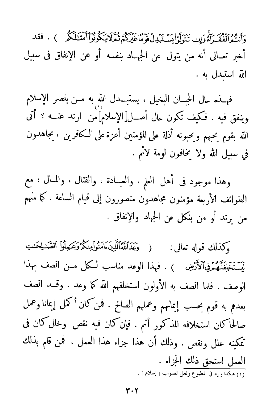 الْغَنِيُّ وَأَنْتُمُ الْفُقَرَاءُ وَإِنْ تَتَوَلَّوْا يَسْتَبْدِلْ قَوْمًا غَيْرَكُمْ ثُمَّ لَا يَكُونُوا أَمْثَالَكُمْ} . فَقَدْ أَخْبَرَ تَعَالَى أَنَّهُ مَنْ يَتَوَلَّ عَنْ الْجِهَادِ بِنَفْسِهِ أَوْ عَنْ الْإِنْفَاقِ فِي سَبِيلِ اللَّهِ اُسْتُبْدِلَ بِهِ. فَهَذِهِ حَالُ الْجَبَانِ الْبَخِيلِ يَسْتَبْدِلُ اللَّهُ بِهِ مَنْ يَنْصُرُ الْإِسْلَامَ وَيُنْفِقُ فِيهِ. فَكَيْفَ تَكُونُ حَالُ أَصْلِ الْإِسْلَامِ مَنْ ارْتَدَّ عَنْهُ؟ أَتَى اللَّهُ بِقَوْمٍ يُحِبُّهُمْ وَيُحِبُّونَهُ أَذِلَّةٍ عَلَى الْمُؤْمِنِينَ أَعِزَّةٍ عَلَى الْكَافِرِينَ يُجَاهِدُونَ فِي سَبِيلِ اللَّه وَلَا يَخَافُونَ لَوْمَةَ لَائِمٍ. وَهَذَا مَوْجُودٌ فِي أَهْلِ الْعِلْمِ وَالْعِبَادَةِ وَالْقِتَالِ وَالْمَالِ؛ مَعَ الطَّوَائِفِ الْأَرْبَعَةِ مُؤْمِنُونَ مُجَاهِدُونَ مَنْصُورُونَ إلَى قِيَامِ السَّاعَةِ كَمَا مِنْهُمْ مَنْ يَرْتَدُّ أَوْ مَنْ يَنْكُلُ عَنْ الْجِهَادِ وَالْإِنْفَاقِ. وَكَذَلِكَ قَوْله تَعَالَى {وَعَدَ اللَّهُ الَّذِينَ آمَنُوا مِنْكُمْ وَعَمِلُوا الصَّالِحَاتِ لَيَسْتَخْلِفَنَّهُمْ فِي الْأَرْضِ} . فَهَذَا الْوَعْدُ مُنَاسِبٌ لِكُلِّ مَنْ اتَّصَفَ بِهَذَا الْوَصْفِ. فَلَمَّا اتَّصَفَ بِهِ الْأَوَّلُونَ اسْتَخْلَفَهُمْ اللَّهُ كَمَا وَعَدَ. وَقَدْ اتَّصَفَ بَعْدَهُمْ بِهِ قَوْمٌ بِحَسَبِ إيمَانِهِمْ وَعَمَلِهِمْ الصَّالِحِ. فَمَنْ كَانَ أَكْمَلَ إيمَانًا وَعَمِلَ صَالِحًا كَانَ اسْتِخْلَافُهُ الْمَذْكُورُ أَتَمَّ. فَإِنْ كَانَ فِيهِ نَقْصٌ وَخَلَلٌ كَانَ فِي تَمْكِينِهِ خَلَلٌ وَنَقْصٌ. وَذَلِكَ أَنَّ هَذَا جَزَاءُ هَذَا الْعَمَلِ فَمَنْ قَامَ بِذَلِكَ الْعَمَلِ اسْتَحَقَّ ذَلِكَ الْجَزَاءَ.