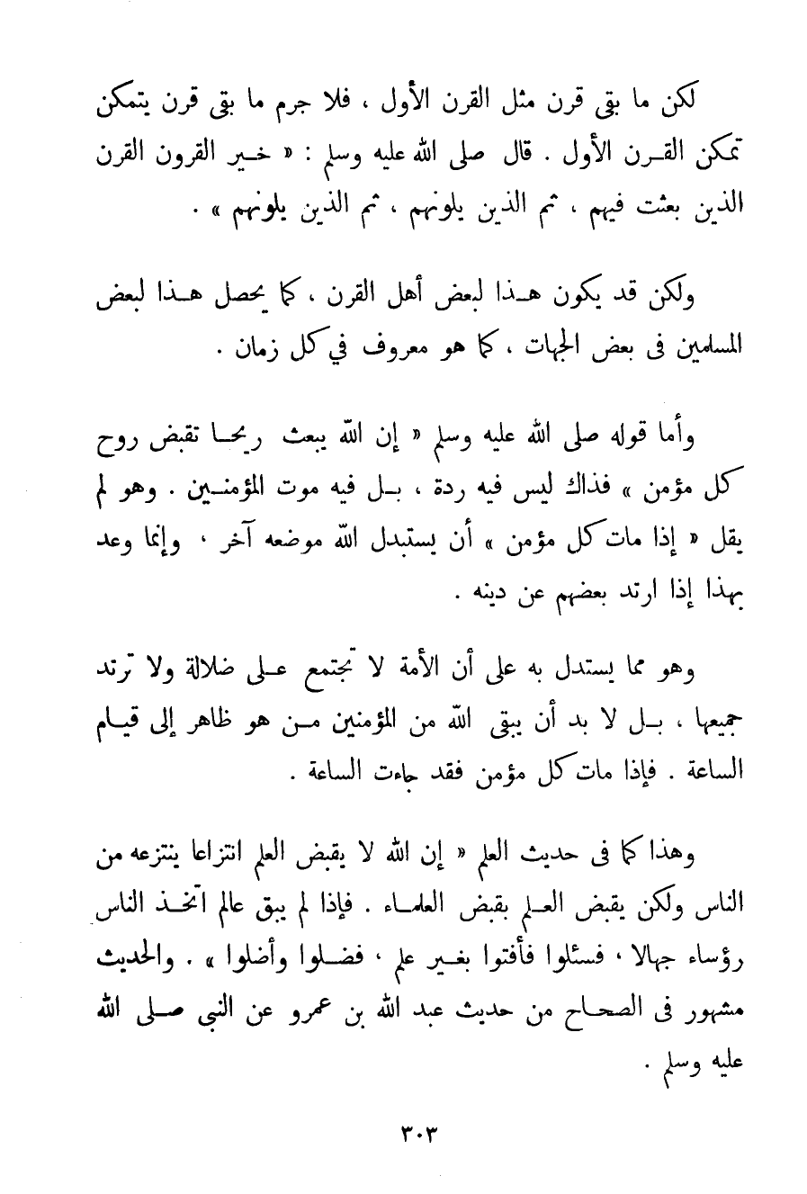 لَكِنْ مَا بَقِيَ قَرْنٌ مِثْلَ الْقَرْنِ الْأَوَّلِ فَلَا جَرَمَ مَا بَقِيَ قَرْنٌ يَتَمَكَّنُ تَمَكُّنَ الْقَرْنِ الْأَوَّلِ. قَالَ صَلَّى اللَّهُ عَلَيْهِ وَسَلَّمَ {خَيْرُ الْقُرُونِ الْقَرْنُ الَّذِينَ بُعِثْت فِيهِمْ ثُمَّ الَّذِينَ يَلُونَهُمْ ثُمَّ الَّذِينَ يَلُونَهُمْ} . وَلَكِنْ قَدْ يَكُونُ هَذَا لِبَعْضِ أَهْلِ الْقَرْنِ كَمَا يَحْصُلُ هَذَا لِبَعْضِ الْمُسْلِمِينَ فِي بَعْضِ الْجِهَاتِ كَمَا هُوَ مَعْرُوفٌ فِي كُلِّ زَمَانٍ. وَأَمَّا قَوْلُهُ صَلَّى اللَّهُ عَلَيْهِ وَسَلَّمَ {إنَّ اللَّهَ يَبْعَثُ رِيحًا تَقْبِضُ رُوحَ كُلِّ مُؤْمِنٍ} فَذَاكَ لَيْسَ فِيهِ رِدَّةٌ بَلْ فِيهِ مَوْتُ الْمُؤْمِنِينَ. وَهُوَ لَمْ يَقُلْ " إذَا مَاتَ كُلُّ مُؤْمِنٍ أَنْ يَسْتَبْدِلَ اللَّهُ مَوْضِعَهُ آخَرَ وَإِنَّمَا وَعَدَ بِهَذَا إذَا ارْتَدَّ بَعْضُهُمْ عَنْ دِينِهِ. وَهُوَ مِمَّا يُسْتَدَلُّ بِهِ عَلَى أَنَّ الْأُمَّةَ لَا تَجْتَمِعُ عَلَى ضَلَالَةٍ وَلَا تَرْتَدُّ جَمِيعُهَا بَلْ لَا بُدَّ أَنْ يُبْقِيَ اللَّهُ مِنْ الْمُؤْمِنِينَ مَنْ هُوَ ظَاهِرٌ إلَى قِيَامِ السَّاعَةِ. فَإِذَا مَاتَ كُلُّ مُؤْمِنٍ فَقَدْ جَاءَتْ السَّاعَةُ. وَهَذَا كَمَا فِي حَدِيثِ الْعِلْمِ {إنَّ اللَّهَ لَا يَقْبِضُ الْعِلْمَ انْتِزَاعًا يَنْتَزِعُهُ مِنْ النَّاسِ وَلَكِنْ يَقْبِضُ الْعِلْمَ بِقَبْضِ الْعُلَمَاءِ. فَإِذَا لَمْ يَبْقَ عَالِمٌ اتَّخَذَ النَّاسُ رُؤَسَاءَ جُهَّالًا فَسُئِلُوا فَأَفْتَوْا بِغَيْرِ عِلْمٍ فَضَّلُوا وَأَضَلُّوا} . وَالْحَدِيثُ مَشْهُورٌ فِي الصِّحَاحِ مِنْ حَدِيثِ عَبْدِ اللَّهِ بْنِ عَمْرٍو عَنْ النَّبِيِّ صَلَّى اللَّهُ عَلَيْهِ وَسَلَّمَ
