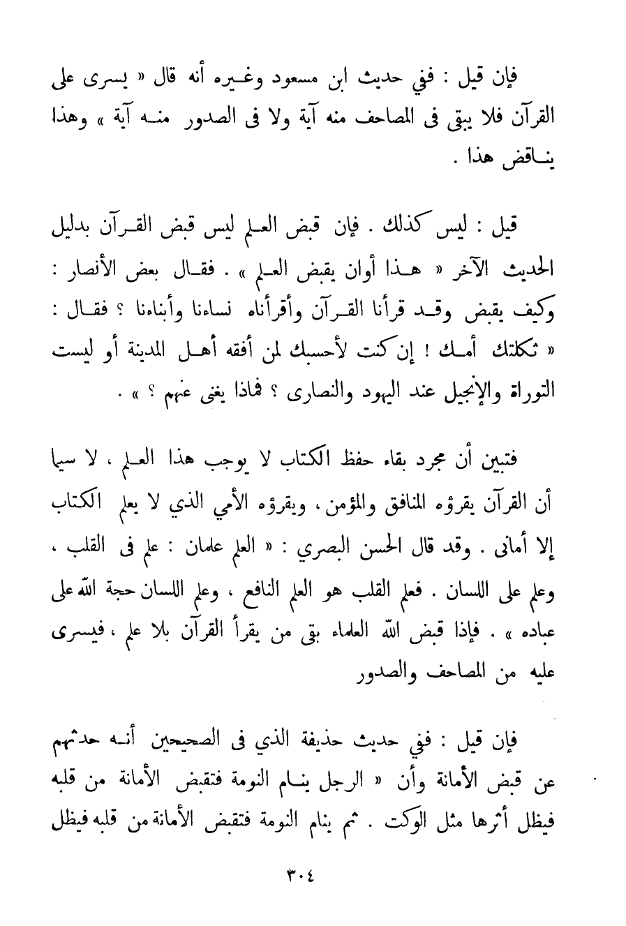 فَإِنْ قِيلَ: فَفِي حَدِيثِ ابْنِ مَسْعُودٍ وَغَيْرِهِ أَنَّهُ قَالَ {يَسْرِي عَلَى الْقُرْآنِ فَلَا يَبْقَى فِي الْمَصَاحِفِ مِنْهُ آيَةٌ وَلَا فِي الصُّدُورِ مِنْهُ آيَةٌ} وَهَذَا يُنَاقِضُ هَذَا. قِيلَ: لَيْسَ كَذَلِكَ. فَإِنَّ قَبْضَ الْعِلْمِ لَيْسَ قَبْضَ الْقُرْآنِ بِدَلِيلِ الْحَدِيثِ الْآخَرِ {هَذَا أَوَانٌ يُقْبَضُ الْعِلْمُ. فَقَالَ بَعْضُ الْأَنْصَارِ: وَكَيْفَ يُقْبَضُ وَقَدْ قَرَأْنَا الْقُرْآنَ وَأَقْرَأْنَاهُ نِسَاءَنَا وَأَبْنَاءَنَا؟ فَقَالَ: ثَكِلَتْك أُمُّك إنْ كُنْت لَأَحْسِبُك لَمِنْ أَفْقَهِ أَهْلِ الْمَدِينَةِ أَوْ لَيْسَتْ التَّوْرَاةُ وَالْإِنْجِيلُ عِنْدَ الْيَهُودِ وَالنَّصَارَى؟ فَمَاذَا يُغْنِي عَنْهُمْ؟} . فَتَبَيَّنَ أَنَّ مُجَرَّدَ بَقَاءِ حِفْظِ الْكِتَابِ لَا يُوجِبُ هَذَا الْعِلْمَ لَا سِيَّمَا أَنَّ الْقُرْآنَ يَقْرَؤُهُ الْمُنَافِقُ وَالْمُؤْمِنُ وَيَقْرَؤُهُ الْأُمِّيُّ الَّذِي لَا يَعْلَمُ الْكِتَابَ إلَّا أَمَانِيَّ. وَقَدْ قَالَ الْحَسَنُ الْبَصْرِيُّ: " الْعِلْمُ عِلْمَانِ: عِلْمٌ فِي الْقَلْبِ وَعِلْمٌ عَلَى اللِّسَانِ. فَعِلْمُ الْقَلْبِ هُوَ الْعِلْمُ النَّافِعُ وَعِلْمُ اللِّسَانِ حُجَّةُ اللَّهِ عَلَى عِبَادِهِ ". فَإِذَا قَبَضَ اللَّهُ الْعُلَمَاءَ بَقِيَ مَنْ يَقْرَأُ الْقُرْآنَ بِلَا عِلْمٍ فَيَسْرِي عَلَيْهِ مِنْ الْمَصَاحِفِ وَالصُّدُورِ. فَإِنْ قِيلَ: فَفِي حَدِيثِ حُذَيْفَةَ الَّذِي فِي الصَّحِيحَيْنِ أَنَّهُ حَدَّثَهُمْ عَنْ قَبْضِ الْأَمَانَةِ وَأَنَّ {الرَّجُلَ يَنَامُ النَّوْمَةَ فَتُقْبَضُ الْأَمَانَةُ مِنْ قَلْبِهِ فَيَظَلُّ أَثَرُهَا مِثْلَ الْوَكْتِ. ثُمَّ يَنَامُ النَّوْمَةَ فَتُقْبَضُ الْأَمَانَةُ مِنْ قَلْبِهِ فَيَظَلُّ