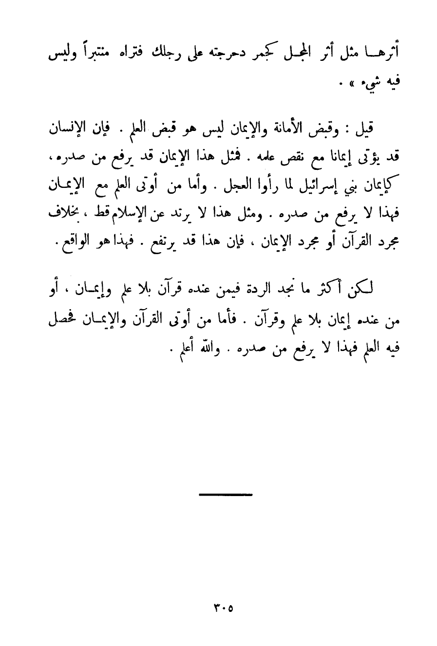 أَثَرُهَا مِثْلَ أَثَرِ الْمَجْلِ كَجَمْرِ دَحْرَجْته عَلَى رِجْلِك فَتَرَاهُ مُنْتَبِرًا وَلَيْسَ فِيهِ شَيْءٌ} . قِيلَ: وَقَبْضُ الْأَمَانَةِ وَالْإِيمَانِ لَيْسَ هُوَ قَبْضِ الْعِلْمِ. فَإِنَّ الْإِنْسَانَ قَدْ يُؤْتَى إيمَانًا مَعَ نَقْصِ عِلْمِهِ. فَمِثْلُ هَذَا الْإِيمَانِ قَدْ يُرْفَعُ مِنْ صَدْرِهِ كَإِيمَانِ بَنِي إسْرَائِيلَ لَمَّا رَأَوْا الْعِجْلَ. وَأَمَّا مَنْ أُوتِيَ الْعِلْمَ مَعَ الْإِيمَانِ فَهَذَا لَا يُرْفَعُ مِنْ صَدْرِهِ. وَمِثْلُ هَذَا لَا يَرْتَدُّ عَنْ الْإِسْلَامِ قَطُّ بِخِلَافِ مُجَرَّدِ الْقُرْآنِ أَوْ مُجَرَّدِ الْإِيمَانِ فَإِنَّ هَذَا قَدْ يَرْتَفِعُ. فَهَذَا هُوَ الْوَاقِعُ. لَكِنْ أَكْثَرُ مَا نَجِدُ الرِّدَّةَ فِيمَنْ عِنْدَهُ قُرْآنٌ بِلَا عِلْمٍ وَإِيمَانٍ أَوْ مَنْ عِنْدَهُ إيمَانٌ بِلَا عِلْمٍ وَقُرْآنٍ. فَأَمَّا مَنْ أُوتِيَ الْقُرْآنَ وَالْإِيمَانَ فَحَصَلَ فِيهِ الْعِلْمُ فَهَذَا لَا يُرْفَعُ مِنْ صَدْرِهِ. وَاَللَّهُ أَعْلَمُ.