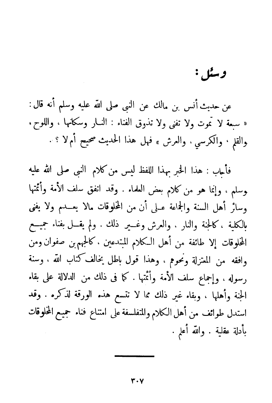 فَأَجَابَ: هَذَا الْخَبَرُ بِهَذَا اللَّفْظِ لَيْسَ مِنْ كَلَامِ النَّبِيِّ صَلَّى اللَّهُ عَلَيْهِ وَسَلَّمَ وَإِنَّمَا هُوَ مِنْ كَلَامِ بَعْضِ الْعُلَمَاءِ. وَقَدْ اتَّفَقَ سَلَفُ الْأُمَّةِ وَأَئِمَّتُهَا وَسَائِرُ أَهْلِ السُّنَّةِ وَالْجَمَاعَةِ عَلَى أَنَّ مِنْ الْمَخْلُوقَاتِ مَا لَا يَعْدَمُ وَلَا يَفْنَى بِالْكُلِّيَّةِ كَالْجَنَّةِ وَالنَّارِ وَالْعَرْشِ وَغَيْرِ ذَلِكَ. وَلَمْ يَقُلْ بِفَنَاءِ جَمِيعِ الْمَخْلُوقَاتِ إلَّا طَائِفَةٌ مِنْ أَهْلِ الْكَلَامِ الْمُبْتَدِعِينَ كَالْجَهْمِ بْنِ صَفْوَانَ وَمَنْ وَافَقَهُ مِنْ الْمُعْتَزِلَةِ وَنَحْوِهِمْ وَهَذَا قَوْلٌ بَاطِلٌ يُخَالِفُ كِتَابَ اللَّهِ وَسُنَّةَ رَسُولِهِ وَإِجْمَاعَ سَلَفِ الْأُمَّةِ وَأَئِمَّتِهَا. كَمَا فِي ذَلِكَ مِنْ الدَّلَالَةِ عَلَى بَقَاءِ الْجَنَّةِ وَأَهْلِهَا وَبَقَاءِ غَيْرِ ذَلِكَ مِمَّا لَا تَتَّسِعُ هَذِهِ الْوَرَقَةُ لِذِكْرِهِ. وَقَدْ اسْتَدَلَّ طَوَائِفُ مِنْ أَهْلِ الْكَلَامِ والمتفلسفة عَلَى امْتِنَاعِ فَنَاءِ جَمِيعِ الْمَخْلُوقَاتِ بِأَدِلَّةِ عَقْلِيَّةٍ. وَاَللَّهُ أَعْلَمُ.