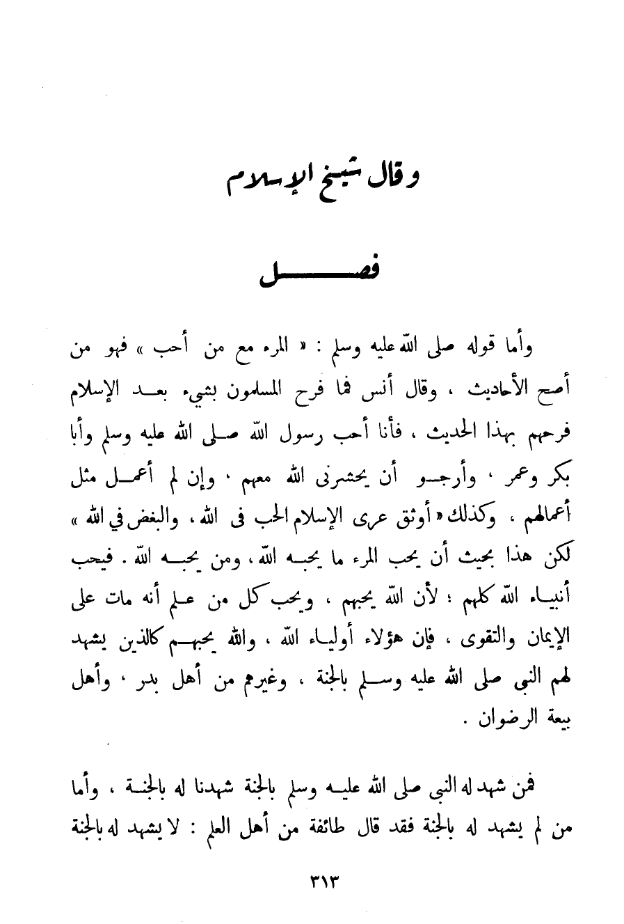 وَأَمَّا قَوْلُهُ صَلَّى اللَّهُ عَلَيْهِ وَسَلَّمَ {الْمَرْءُ مَعَ مَنْ أَحَبَّ} فَهُوَ مِنْ أَصَحِّ الْأَحَادِيثِ وَقَالَ أَنَسٌ فَمَا فَرِحَ الْمُسْلِمُونَ بِشَيْءِ بَعْدَ الْإِسْلَامِ فَرَحَهُمْ بِهَذَا الْحَدِيثِ فَأَنَا أُحِبُّ رَسُولَ اللَّهِ صَلَّى اللَّهُ عَلَيْهِ وَسَلَّمَ وَأَبَا بَكْرٍ وَعُمَرَ وَأَرْجُو أَنْ يَحْشُرَنِي اللَّهُ مَعَهُمْ وَإِنْ لَمْ أَعْمَلْ مِثْلَ أَعْمَالِهِمْ وَكَذَلِكَ (*) {أَوْثَقُ عُرَى الْإِسْلَامِ الْحُبُّ فِي اللَّهِ وَالْبُغْضُ فِي اللَّهِ} لَكِنْ هَذَا بِحَيْثُ أَنْ يُحِبَّ الْمَرْءَ مَا يُحِبُّهُ اللَّهُ وَمَنْ يُحِبُّهُ اللَّهُ فَيُحِبُّ أَنْبِيَاءَ اللَّهِ كُلَّهُمْ؛ لِأَنَّ اللَّهَ يُحِبُّهُمْ وَيُحِبُّ كُلَّ مَنْ عَلِمَ أَنَّهُ مَاتَ عَلَى الْإِيمَانِ وَالتَّقْوَى فَإِنَّ هَؤُلَاءِ أَوْلِيَاءُ اللَّهِ وَاَللَّهُ يُحِبُّهُمْ كَاَلَّذِينَ يَشْهَدُ لَهُمْ النَّبِيُّ صَلَّى اللَّهُ عَلَيْهِ وَسَلَّمَ بِالْجَنَّةِ وَغَيْرِهِمْ مِنْ أَهْلِ بَدْرٍ وَأَهْلِ بَيْعَةِ الرِّضْوَانِ. فَمَنْ شَهِدَ لَهُ النَّبِيُّ صَلَّى اللَّهُ عَلَيْهِ وَسَلَّمَ بِالْجَنَّةِ شَهِدْنَا لَهُ بِالْجَنَّةِ وَأَمَّا مَنْ لَمْ يَشْهَدْ لَهُ بِالْجَنَّةِ فَقَدْ قَالَ طَائِفَةٌ مِنْ أَهْلِ الْعِلْمِ: لَا نَشْهَدُ لَهُ بِالْجَنَّةِ