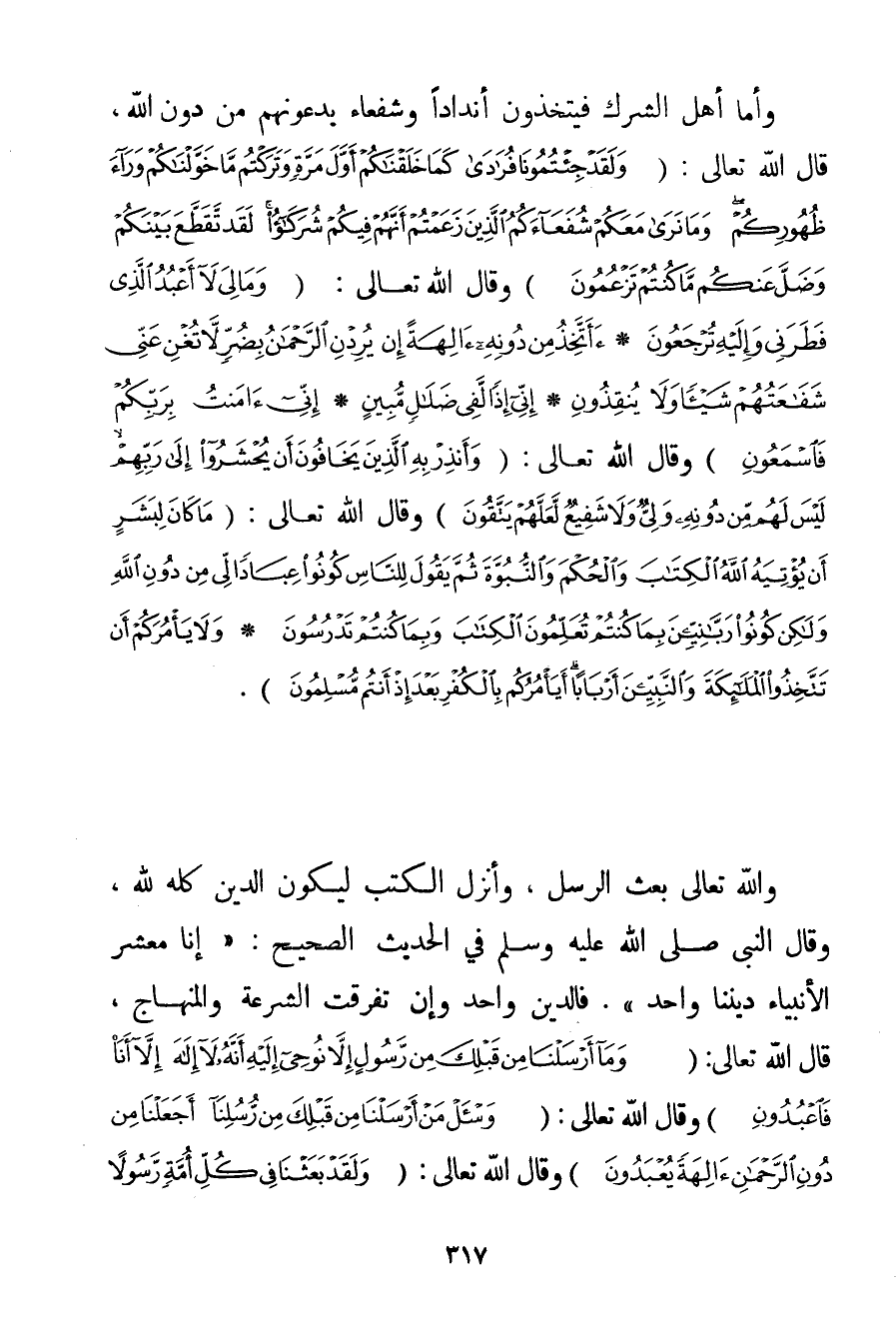 وَأَمَّا أَهْلُ الشِّرْكِ فَيَتَّخِذُونَ أَنْدَادًا وَشُفَعَاءَ يَدْعُونَهُمْ مِنْ دُونِ اللَّهِ قَالَ اللَّهُ تَعَالَى: {وَلَقَدْ جِئْتُمُونَا فُرَادَى كَمَا خَلَقْنَاكُمْ أَوَّلَ مَرَّةٍ وَتَرَكْتُمْ مَا خَوَّلْنَاكُمْ وَرَاءَ ظُهُورِكُمْ وَمَا نَرَى مَعَكُمْ شُفَعَاءَكُمُ الَّذِينَ زَعَمْتُمْ أَنَّهُمْ فِيكُمْ شُرَكَاءُ لَقَدْ تَقَطَّعَ بَيْنَكُمْ وَضَلَّ عَنْكُمْ مَا كُنْتُمْ تَزْعُمُونَ} وَقَالَ اللَّهُ تَعَالَى: {وَمَا لِيَ لَا أَعْبُدُ الَّذِي فَطَرَنِي وَإِلَيْهِ تُرْجَعُونَ} {أَأَتَّخِذُ مِنْ دُونِهِ آلِهَةً إنْ يُرِدْنِ الرَّحْمَنُ بِضُرٍّ لَا تُغْنِ عَنِّي شَفَاعَتُهُمْ شَيْئًا وَلَا يُنْقِذُونِ} {إنِّي إذًا لَفِي ضَلَالٍ مُبِينٍ} {إنِّي آمَنْتُ بِرَبِّكُمْ فَاسْمَعُونِ} وَقَالَ اللَّهُ تَعَالَى: {وَأَنْذِرْ بِهِ الَّذِينَ يَخَافُونَ أَنْ يُحْشَرُوا إلَى رَبِّهِمْ لَيْسَ لَهُمْ مِنْ دُونِهِ وَلِيٌّ وَلَا شَفِيعٌ لَعَلَّهُمْ يَتَّقُونَ} وَقَالَ اللَّهُ تَعَالَى: {مَا كَانَ لِبَشَرٍ أَنْ يُؤْتِيَهُ اللَّهُ الْكِتَابَ وَالْحُكْمَ وَالنُّبُوَّةَ ثُمَّ يَقُولَ لِلنَّاسِ كُونُوا عِبَادًا لِي مِنْ دُونِ اللَّهِ وَلَكِنْ كُونُوا رَبَّانِيِّينَ بِمَا كُنْتُمْ تُعَلِّمُونَ الْكِتَابَ وَبِمَا كُنْتُمْ تَدْرُسُونَ} {وَلَا يَأْمُرَكُمْ أَنْ تَتَّخِذُوا الْمَلَائِكَةَ وَالنَّبِيِّينَ أَرْبَابًا أَيَأْمُرُكُمْ بِالْكُفْرِ بَعْدَ إذْ أَنْتُمْ مُسْلِمُونَ} . وَاَللَّهُ تَعَالَى بَعَثَ الرُّسُلَ وَأَنْزَلَ الْكُتُبَ لِيَكُونَ الدِّينُ كُلُّهُ لِلَّهِ وَقَالَ النَّبِيُّ صَلَّى اللَّهُ عَلَيْهِ وَسَلَّمَ فِي الْحَدِيثِ الصَّحِيحِ: {إنَّا مَعْشَرَ الْأَنْبِيَاءِ دِينُنَا وَاحِدٌ} . فَالدِّينُ وَاحِدٌ وَإِنْ تَفَرَّقَتْ الشِّرْعَةُ وَالْمِنْهَاجُ قَالَ اللَّهُ تَعَالَى: {وَمَا أَرْسَلْنَا مِنْ قَبْلِكَ مِنْ رَسُولٍ إلَّا نُوحِي إلَيْهِ أَنَّهُ لَا إلَهَ إلَّا أَنَا فَاعْبُدُونِ} وَقَالَ اللَّهُ تَعَالَى: {وَاسْأَلْ مَنْ أَرْسَلْنَا مِنْ قَبْلِكَ مِنْ رُسُلِنَا أَجَعَلْنَا مِنْ دُونِ الرَّحْمَنِ آلِهَةً يُعْبَدُونَ} وَقَالَ اللَّهُ تَعَالَى: {وَلَقَدْ بَعَثْنَا فِي كُلِّ أُمَّةٍ رَسُولًا