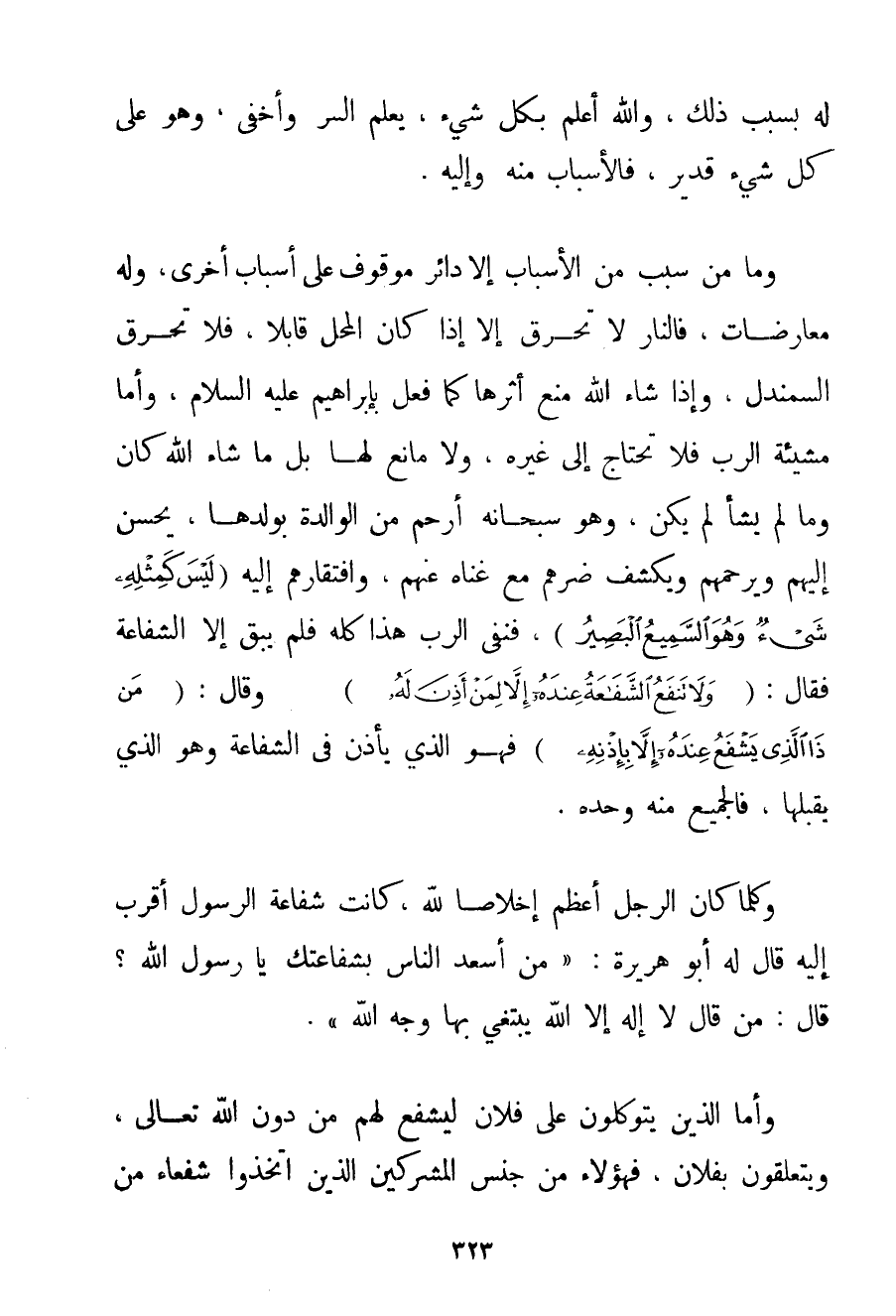 لَهُ بِسَبَبِ ذَلِكَ وَاَللَّهُ أَعْلَمُ بِكُلِّ شَيْءٍ يَعْلَمُ السِّرَّ وَأَخْفَى وَهُوَ عَلَى كُلِّ شَيْءٍ قَدِيرٌ فَالْأَسْبَابُ مِنْهُ وَإِلَيْهِ. وَمَا مِنْ سَبَبٍ مِنْ الْأَسْبَابِ إلَّا دَائِرٌ مَوْقُوفٌ عَلَى أَسْبَابٍ أُخْرَى وَلَهُ مُعَارَضَاتٌ فَالنَّارُ لَا تُحْرِقُ إلَّا إذَا كَانَ الْمَحَلُّ قَابِلًا فَلَا تُحْرِقُ السمندل وَإِذَا شَاءَ اللَّهُ مَنَعَ أَثَرَهَا كَمَا فَعَلَ بِإِبْرَاهِيمَ عَلَيْهِ السَّلَامُ وَأَمَّا مَشِيئَةُ الرَّبِّ فَلَا تَحْتَاجُ إلَى غَيْرِهِ وَلَا مَانِعَ لَهَا بَلْ مَا شَاءَ اللَّهُ كَانَ وَمَا لَمْ يَشَأْ لَمْ يَكُنْ وَهُوَ سُبْحَانَهُ أَرْحَمُ مِنْ الْوَالِدَةِ بِوَلَدِهَا يُحْسِنُ إلَيْهِمْ وَيَرْحَمُهُمْ وَيَكْشِفُ ضُرَّهُمْ مَعَ غِنَاهُ عَنْهُمْ وَافْتِقَارِهِمْ إلَيْهِ {لَيْسَ كَمِثْلِهِ شَيْءٌ وَهُوَ السَّمِيعُ الْبَصِيرُ} فَنَفَى الرَّبَّ هَذَا كُلَّهُ فَلَمْ يُبْقِ إلَّا الشَّفَاعَةَ فَقَالَ. {وَلَا تَنْفَعُ الشَّفَاعَةُ عِنْدَهُ إلَّا لِمَنْ أَذِنَ لَهُ} وَقَالَ: {مَنْ ذَا الَّذِي يَشْفَعُ عِنْدَهُ إلَّا بِإِذْنِهِ} فَهُوَ الَّذِي يَأْذَنُ فِي الشَّفَاعَةِ وَهُوَ الَّذِي يَقْبَلُهَا فَالْجَمِيعُ مِنْهُ وَحْدَهُ. وَكُلَّمَا كَانَ الرَّجُلُ أَعْظَمَ إخْلَاصًا لِلَّهِ كَانَتْ شَفَاعَةُ الرَّسُولِ أَقْرَبَ إلَيْهِ {قَالَ لَهُ أَبُو هُرَيْرَةَ: مَنْ أَسْعَدُ النَّاسِ بِشَفَاعَتِك يَا رَسُولَ اللَّهِ؟ قَالَ: مَنْ قَالَ لَا إلَهَ إلَّا اللَّهُ يَبْتَغِي بِهَا وَجْهَ اللَّهِ} . وَأَمَّا الَّذِينَ يَتَوَكَّلُونَ عَلَى فُلَانٍ لِيَشْفَعَ لَهُمْ مِنْ دُونِ اللَّهِ تَعَالَى وَيَتَعَلَّقُونَ بِفُلَانِ فَهَؤُلَاءِ مِنْ جَنْسِ الْمُشْرِكِينَ الَّذِينَ اتَّخَذُوا شُفَعَاءَ مِنْ
