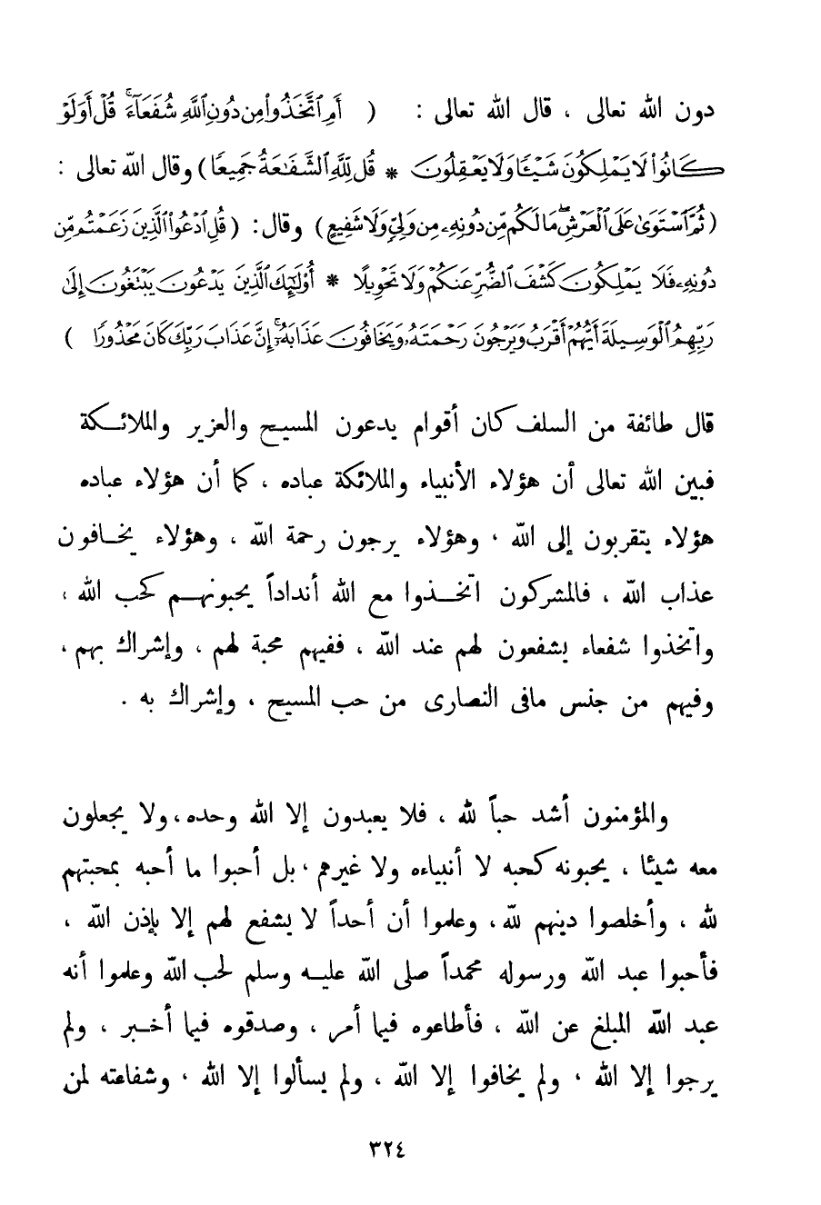 دُونِ اللَّهِ تَعَالَى قَالَ اللَّهُ تَعَالَى: {أَمِ اتَّخَذُوا مِنْ دُونِ اللَّهِ شُفَعَاءَ قُلْ أَوَلَوْ كَانُوا لَا يَمْلِكُونَ شَيْئًا وَلَا يَعْقِلُونَ} {قُلْ لِلَّهِ الشَّفَاعَةُ جَمِيعًا} وَقَالَ اللَّهُ تَعَالَى: {ثُمَّ اسْتَوَى عَلَى الْعَرْشِ مَا لَكُمْ مِنْ دُونِهِ مِنْ وَلِيٍّ وَلَا شَفِيعٍ} وَقَالَ: {قُلِ ادْعُوا الَّذِينَ زَعَمْتُمْ مِنْ دُونِهِ فَلَا يَمْلِكُونَ كَشْفَ الضُّرِّ عَنْكُمْ وَلَا تَحْوِيلًا} {أُولَئِكَ الَّذِينَ يَدْعُونَ يَبْتَغُونَ إلَى رَبِّهِمُ الْوَسِيلَةَ أَيُّهُمْ أَقْرَبُ وَيَرْجُونَ رَحْمَتَهُ وَيَخَافُونَ عَذَابَهُ إنَّ عَذَابَ رَبِّكَ كَانَ مَحْذُورًا} قَالَ طَائِفَةٌ مِنْ السَّلَفِ كَانَ أَقْوَامٌ يَدْعُونَ الْمَسِيحَ وَالْعُزَيْرَ وَالْمَلَائِكَةَ فَبَيَّنَ اللَّهُ تَعَالَى أَنَّ هَؤُلَاءِ الْأَنْبِيَاءَ وَالْمَلَائِكَةَ عِبَادُهُ كَمَا أَنَّ هَؤُلَاءِ عِبَادُهُ هَؤُلَاءِ يَتَقَرَّبُونَ إلَى اللَّهِ وَهَؤُلَاءِ يَرْجُونَ رَحْمَةَ اللَّهِ وَهَؤُلَاءِ يَخَافُونَ عَذَابَ اللَّهِ فَالْمُشْرِكُونَ اتَّخَذُوا مَعَ اللَّهِ أَنْدَادًا يُحِبُّونَهُمْ كَحُبِّ اللَّهِ؛ وَاِتَّخَذُوا شُفَعَاءَ يَشْفَعُونَ لَهُمْ عِنْدَ اللَّهِ فَفِيهِمْ مَحَبَّةٌ لَهُمْ وَإِشْرَاكٌ بِهِمْ وَفِيهِمْ مِنْ جِنْسِ مَا فِي النَّصَارَى مِنْ حُبِّ الْمَسِيحِ وَإِشْرَاكٍ بِهِ. وَالْمُؤْمِنُونَ أَشَدُّ حُبًّا لِلَّهِ فَلَا يَعْبُدُونَ إلَّا اللَّهَ وَحْدَهُ وَلَا يَجْعَلُونَ مَعَهُ شَيْئًا يُحِبُّونَهُ كَحُبِّهِ لَا أَنْبِيَاءَهُ وَلَا غَيْرَهُمْ بَلْ أَحَبُّوا مَا أَحَبَّهُ بِمَحَبَّتِهِمْ لِلَّهِ وَأَخْلَصُوا دِينَهُمْ لِلَّهِ وَعَلِمُوا أَنَّ أَحَدًا لَا يَشْفَعُ لَهُمْ إلَّا بِإِذْنِ اللَّهِ فَأَحَبُّوا عَبْدَ اللَّهِ وَرَسُولَهُ مُحَمَّدًا صَلَّى اللَّهُ عَلَيْهِ وَسَلَّمَ لَحُبِّ اللَّهِ وَعَلِمُوا أَنَّهُ عَبْدُ اللَّهِ الْمُبَلِّغُ عَنْ اللَّهِ فَأَطَاعُوهُ فِيمَا أَمَرَ وَصَدَّقُوهُ فِيمَا أَخْبَرَ وَلَمْ يَرْجُوَا إلَّا اللَّهَ وَلَمْ يَخَافُوا إلَّا اللَّهَ وَلَمْ يَسْأَلُوا إلَّا اللَّهَ وَشَفَاعَتُهُ لِمَنْ