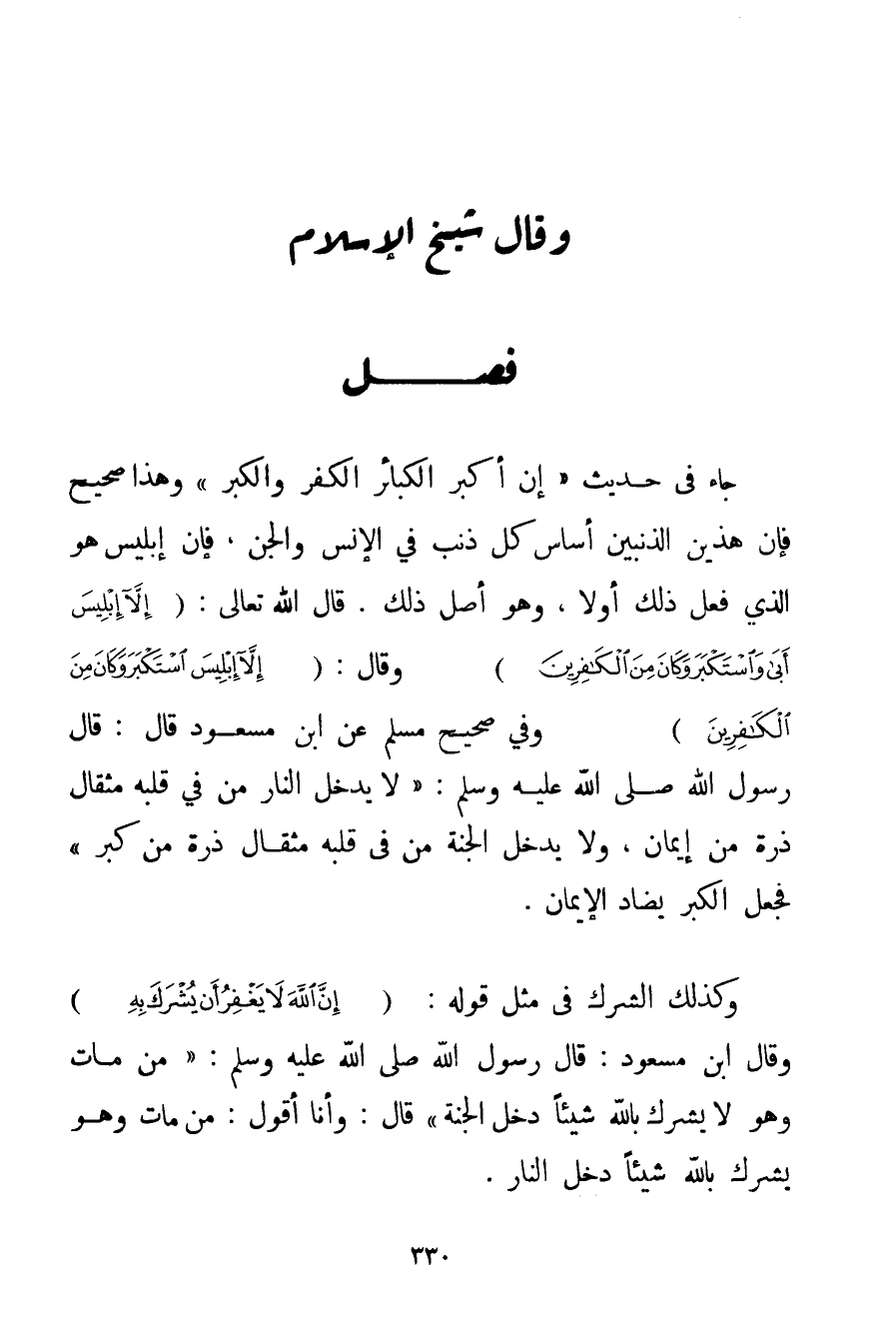 جَاءَ فِي حَدِيثٍ {إنَّ أَكْبَرَ الْكَبَائِرِ الْكُفْرُ وَالْكِبْرُ} وَهَذَا صَحِيحٌ فَإِنَّ هَذَيْنِ الذَّنَبَيْنِ أَسَاسُ كُلِّ ذَنْبٍ فِي الْإِنْسِ وَالْجِنِّ فَإِنَّ إبْلِيسَ هُوَ الَّذِي فَعَلَ ذَلِكَ أَوَّلًا وَهُوَ أَصْلُ ذَلِكَ. قَالَ اللَّهُ تَعَالَى: {إلَّا إبْلِيسَ أَبَى وَاسْتَكْبَرَ وَكَانَ مِنَ الْكَافِرِينَ} وَقَالَ: {إلَّا إبْلِيسَ اسْتَكْبَرَ وَكَانَ مِنَ الْكَافِرِينَ} وَفِي صَحِيحِ مُسْلِمٍ عَنْ ابْنِ مَسْعُودٍ قَالَ: قَالَ رَسُولُ اللَّهِ صَلَّى اللَّهُ عَلَيْهِ وَسَلَّمَ {لَا يَدْخُلُ النَّارَ مَنْ فِي قَلْبِهِ مِثْقَالُ ذَرَّةٍ مِنْ إيمَانٍ وَلَا يَدْخُلُ الْجَنَّةَ مَنْ فِي قَلْبِهِ مِثْقَالُ ذَرَّةٍ مِنْ كِبْرٍ} فَجَعَلَ الْكِبْرَ يُضَادُّ الْإِيمَانَ. وَكَذَلِكَ الشِّرْكُ فِي مِثْلِ قَوْلِهِ: {إنَّ اللَّهَ لَا يَغْفِرُ أَنْ يُشْرَكَ بِهِ} وَقَالَ ابْنُ مَسْعُودٍ: قَالَ رَسُولُ اللَّهِ صَلَّى اللَّهُ عَلَيْهِ وَسَلَّمَ {مَنْ مَاتَ وَهُوَ لَا يُشْرِكُ بِاَللَّهِ شَيْئًا دَخَلَ الْجَنَّةَ} قَالَ: وَأَنَا أَقُولُ: مَنْ مَاتَ وَهُوَ يُشْرِكُ بِاَللَّهِ شَيْئًا دَخَلَ النَّارَ.