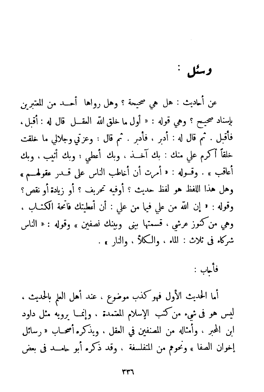 عَنْ أَحَادِيثَ: هَلْ هِيَ صَحِيحَةٌ؟ وَهَلْ رَوَاهَا أَحَدٌ مِنْ الْمُعْتَبَرِينَ بِإِسْنَادِ صَحِيحٍ؟ وَهِيَ قَوْلُهُ: {أَوَّلُ مَا خَلَقَ اللَّهُ الْعَقْلَ قَالَ لَهُ: أَقْبِلْ فَأَقْبَلَ. ثُمَّ قَالَ لَهُ: أَدْبِرْ فَأَدْبَرَ. ثُمَّ قَالَ: وَعِزَّتِي وَجَلَالِي مَا خَلَقْت خَلْقًا أَكْرَمَ عَلَيَّ مِنْك: بِك آخُذُ وَبِك أُعْطِي؛ وَبِك أُثِيبُ وَبِك أُعَاقِبُ} . وَقَوْلُهُ: {أُمِرْت أَنْ أُخَاطِبَ النَّاسَ عَلَى قَدْرِ عُقُولِهِمْ} وَهَلْ هَذَا اللَّفْظُ هُوَ لَفْظٌ حَدِيثٌ؟ أَوْ فِيهِ تَحْرِيفٌ؟ أَوْ زِيَادَةٌ أَوْ نَقْصٌ؟ وَقَوْلُهُ: {إنَّ اللَّهَ مَنَّ عَلَيَّ فِيمَا مَنْ عَلَيَّ: أَنْ أَعْطَيْتُك فَاتِحَةَ الْكِتَابِ وَهِيَ مِنْ كُنُوزِ عَرْشِي قَسَمْتهَا بَيْنِي وَبَيْنَك نِصْفَيْنِ} وَقَوْلُهُ: {النَّاسُ شُرَكَاءُ فِي ثَلَاثٍ: الْمَاءِ وَالْكَلَأِ وَالنَّارِ} .