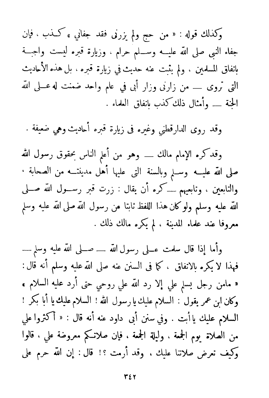 وَكَذَلِكَ قَوْلُهُ: {مَنْ حَجَّ وَلَمْ يَزُرْنِي فَقَدْ جَفَانِي} كَذِبٌ فَإِنَّ جَفَاءَ النَّبِيِّ صَلَّى اللَّهُ عَلَيْهِ وَسَلَّمَ حَرَامٌ وَزِيَارَةُ قَبْرِهِ لَيْسَتْ وَاجِبَةً بِاتِّفَاقِ الْمُسْلِمِينَ وَلَمْ يَثْبُتْ عَنْهُ حَدِيثٌ فِي زِيَارَةِ قَبْرِهِ بَلْ هَذِهِ الْأَحَادِيثُ الَّتِي تُرْوَى - مَنْ زَارَنِي وَزَارَ أَبِي فِي عَامٍ وَاحِدٍ ضَمِنْت لَهُ عَلَى اللَّهِ الْجَنَّةَ - وَأَمْثَالُ ذَلِكَ كَذِبٌ بِاتِّفَاقِ الْعُلَمَاءِ. وَقَدْ رَوَى الدارقطني وَغَيْرُهُ فِي زِيَارَةِ قَبْرِهِ أَحَادِيثَ وَهِيَ ضَعِيفَةٌ. وَقَدْ كَرِهَ الْإِمَامُ مَالِكٌ - وَهُوَ مِنْ أَعْلَمِ النَّاسِ بِحُقُوقِ رَسُولِ اللَّهِ صَلَّى اللَّهُ عَلَيْهِ وَسَلَّمَ وَبِالسُّنَّةِ الَّتِي عَلَيْهَا أَهْلُ مَدِينَتِهِ مِنْ الصَّحَابَةِ وَالتَّابِعِينَ وَتَابِعِيهِمْ - كَرِهَ أَنْ يُقَالَ: زُرْت قَبْرَ رَسُولِ اللَّهِ صَلَّى اللَّهُ عَلَيْهِ وَسَلَّمَ وَلَوْ كَانَ هَذَا اللَّفْظُ ثَابِتًا عَنْ رَسُولِ اللَّهِ صَلَّى اللَّهُ عَلَيْهِ وَسَلَّمَ مَعْرُوفًا عِنْدَ عُلَمَاءِ الْمَدِينَةِ لَمْ يَكْرَهْ مَالِكٌ ذَلِكَ. وَأَمَّا إذَا قَالَ سَلَّمْت عَلَى رَسُولِ اللَّهِ - صَلَّى اللَّهُ عَلَيْهِ وَسَلَّمَ - فَهَذَا لَا يُكْرَهُ بِالِاتِّفَاقِ كَمَا فِي السُّنَنِ عَنْهُ صَلَّى اللَّهُ عَلَيْهِ وَسَلَّمَ أَنَّهُ قَالَ: {مَا مِنْ رَجُلٍ يُسَلِّمُ عَلَيَّ إلَّا رَدَّ اللَّهُ عَلَيَّ رُوحِي حَتَّى أَرُدَّ عَلَيْهِ السَّلَامُ} وَكَانَ ابْنُ عُمَرَ يَقُولُ: السَّلَامُ عَلَيْك يَا رَسُولَ اللَّهِ؛ السَّلَامُ عَلَيْك يَا أَبَا بَكْرٍ السَّلَامُ عَلَيْك يَا أَبَتِ. وَفِي سُنَنِ أَبِي دَاوُد عَنْهُ أَنَّهُ قَالَ: {أَكْثِرُوا عَلَيَّ مِنْ الصَّلَاةِ يَوْمَ الْجُمُعَةِ وَلَيْلَةَ الْجُمُعَةِ فَإِنَّ صَلَاتَكُمْ مَعْرُوضَةٌ عَلَيَّ قَالُوا وَكَيْفَ تُعْرَضُ صَلَاتُنَا عَلَيْك وَقَدْ أَرَمْت قَالَ: إنَّ اللَّهَ حَرَّمَ عَلَى