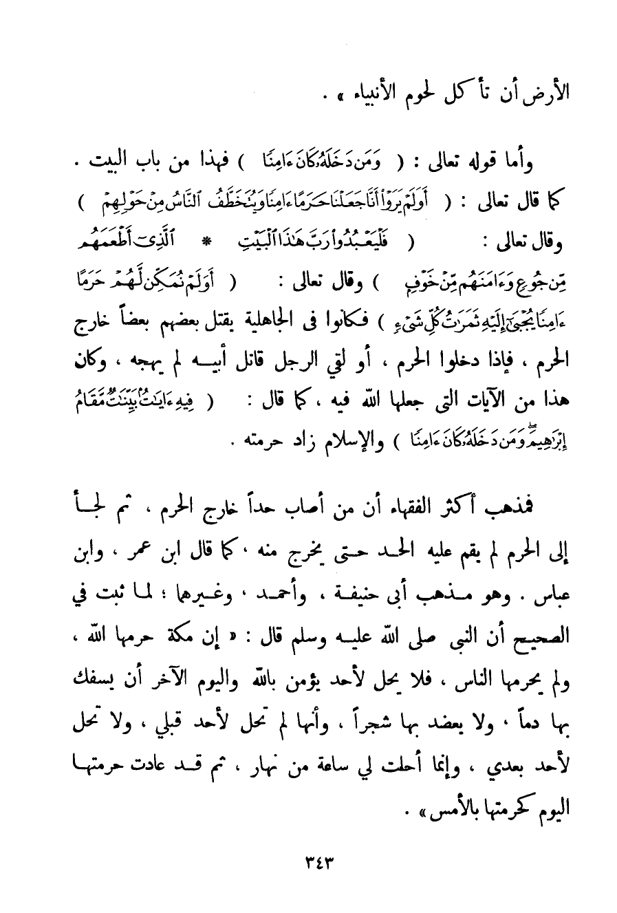 وَأَمَّا قَوْله تَعَالَى {وَمَنْ دَخَلَهُ كَانَ آمِنًا} فَهَذَا مِنْ بَابِ الْبَيْتِ. كَمَا قَالَ تَعَالَى: {أَوَلَمْ يَرَوْا أَنَّا جَعَلْنَا حَرَمًا آمِنًا وَيُتَخَطَّفُ النَّاسُ مِنْ حَوْلِهِمْ} وَقَالَ تَعَالَى: {فَلْيَعْبُدُوا رَبَّ هَذَا الْبَيْتِ} {الَّذِي أَطْعَمَهُمْ مِنْ جُوعٍ وَآمَنَهُمْ مِنْ خَوْفٍ} وَقَالَ تَعَالَى: {أَوَلَمْ نُمَكِّنْ لَهُمْ حَرَمًا آمِنًا يُجْبَى إلَيْهِ ثَمَرَاتُ كُلِّ شَيْءٍ} فَكَانُوا فِي الْجَاهِلِيَّةِ يَقْتُلُ بَعْضُهُمْ بَعْضًا خَارِجَ الْحَرَمِ فَإِذَا دَخَلُوا الْحَرَمَ أَوْ لَقِيَ الرَّجُلُ قَاتِلَ أَبِيهِ لَمْ يَهْجُهُ وَكَانَ هَذَا مِنْ الْآيَاتِ الَّتِي جَعَلَهَا اللَّهُ فِيهِ كَمَا قَالَ: {فِيهِ آيَاتٌ بَيِّنَاتٌ مَقَامُ إبْرَاهِيمَ وَمَنْ دَخَلَهُ كَانَ آمِنًا} وَالْإِسْلَامُ زَادَ حُرْمَتَهُ. فَمَذْهَبُ أَكْثَرِ الْفُقَهَاءِ أَنَّ مَنْ أَصَابَ حَدًّا خَارِجَ الْحَرَمِ ثُمَّ لَجَأَ إلَى الْحَرَمِ لَمْ يَقُمْ عَلَيْهِ الْحَدُّ حَتَّى يَخْرُجَ مِنْهُ كَمَا قَالَ ابْنُ عُمَرَ وَابْنُ عَبَّاسٍ. وَهُوَ مَذْهَبُ أَبِي حَنِيفَةَ وَأَحْمَد وَغَيْرِهِمَا؛ لِمَا ثَبَتَ فِي الصَّحِيحِ أَنَّ النَّبِيَّ صَلَّى اللَّهُ عَلَيْهِ وَسَلَّمَ قَالَ: {إنَّ مَكَّةَ حَرَّمَهَا اللَّهُ وَلَمْ يُحَرِّمْهَا النَّاسُ فَلَا يَحِلُّ لِأَحَدِ يُؤْمِنُ بِاَللَّهِ وَالْيَوْمِ الْآخِرِ أَنْ يَسْفِكَ بِهَا دَمًا وَلَا يَعْضِدَ بِهَا شَجَرًا وَأَنَّهَا لَمْ تَحِلَّ لِأَحَدِ قَبْلِي وَلَا تَحِلُّ لِأَحَدِ بَعْدِي وَإِنَّمَا أُحِلَّتْ لِي سَاعَةً مِنْ نَهَارٍ ثُمَّ قَدْ عَادَتْ حُرْمَتُهَا الْيَوْمَ كَحُرْمَتِهَا بِالْأَمْسِ} .