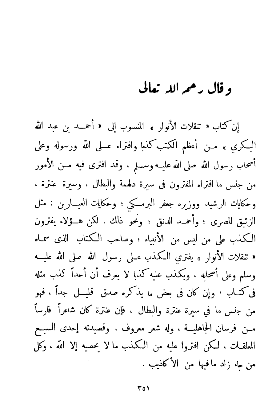 إنَّ كِتَابَ " تَنَقُّلَاتِ الْأَنْوَارِ " الْمَنْسُوبُ إلَى " أَحْمَد بْنِ عَبْدِ اللَّهِ الْبَكْرِيِّ " مِنْ أَعْظَمِ الْكُتُبِ كَذِبًا وَافْتِرَاءً عَلَى اللَّهِ وَرَسُولِهِ وَعَلَى أَصْحَابِ رَسُولِ اللَّه صَلَّى اللَّهُ عَلَيْهِ وَسَلَّمَ وَقَدْ افْتَرَى فِيهِ مِنْ الْأُمُورِ مِنْ جِنْسِ مَا افْتَرَاهُ الْمُفْتَرُونَ فِي سِيرَةِ دلهمة وَالْبَطَّالِ وَسِيرَةِ عَنْتَرَةَ وَحِكَايَاتِ الرَّشِيدِ وَوَزِيرِهِ جَعْفَرٍ الْبَرْمَكِيِّ؛ وَحِكَايَاتِ الْعَيَّارِينَ: مِثْلَ الزِّئْبَقِ الْمِصْرِيِّ. وَأَحْمَد الدنق؛ وَنَحْوَ ذَلِكَ. لَكِنْ هَؤُلَاءِ يَفْتَرُونَ الْكَذِبَ عَلَى مَنْ لَيْسَ مِنْ الْأَنْبِيَاءِ؛ وَصَاحِبُ الْكِتَابِ الَّذِي سَمَّاهُ " تَنَقُّلَاتِ الْأَنْوَارِ " يَفْتَرِي الْكَذِبَ عَلَى رَسُولِ اللَّهِ صَلَّى اللَّهُ عَلَيْهِ وَسَلَّمَ وَعَلَى أَصْحَابِهِ وَيَكْذِبُ عَلَيْهِ كَذِبًا لَا يُعْرَفُ أَنَّ أَحَدًا كَذَبَ مِثْلَهُ فِي كِتَابٍ وَإِنْ كَانَ فِي بَعْضِ مَا يَذْكُرُهُ صِدْقٌ قَلِيلٌ جِدًّا فَهُوَ مِنْ جِنْسِ مَا فِي سِيرَةِ عَنْتَرَةَ وَالْبَطَّالِ فَإِنَّ عَنْتَرَةَ كَانَ شَاعِرًا فَارِسًا مِنْ فُرْسَانِ الْجَاهِلِيَّةِ وَلَهُ شِعْرٌ مَعْرُوفٌ وَقَصِيدَتُهُ إحْدَى السَّبْعِ الْمُعَلَّقَاتِ لَكِنْ افْتَرَوْا عَلَيْهِ مِنْ الْكَذِبِ مَا لَا يُحْصِيه إلَّا اللَّهُ وَكُلُّ مَنْ جَاءَ زَادَ مَا فِيهَا مِنْ الْأَكَاذِيبِ.