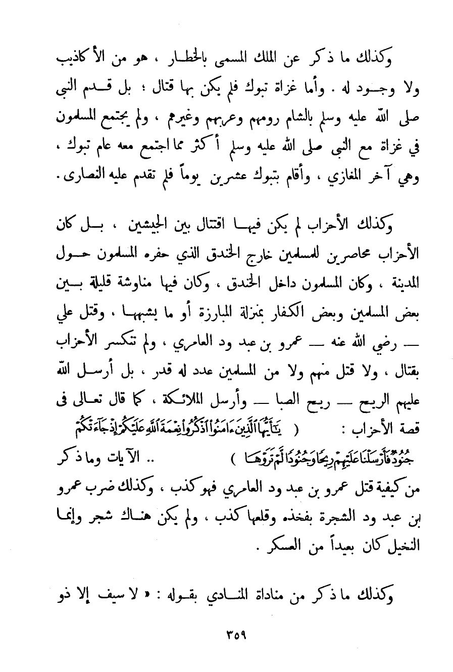 وَكَذَلِكَ مَا ذُكِرَ عَنْ الْمَلِكِ الْمُسَمَّى بِالْخِطَارِ هُوَ مِنْ الْأَكَاذِيبِ وَلَا وُجُودَ لَهُ. وَأَمَّا غُزَاةُ تَبُوكَ فَلَمْ يَكُنْ بِهَا قِتَالٌ؛ بَلْ قَدِمَ النَّبِيُّ صَلَّى اللَّهُ عَلَيْهِ وَسَلَّمَ بِالشَّامِ رُومِهِمْ وَعَرَبِهِمْ وَغَيْرِهِمْ وَلَمْ يَجْتَمِعْ الْمُسْلِمُونَ فِي غُزَاةٍ مَعَ النَّبِيِّ صَلَّى اللَّهُ عَلَيْهِ وَسَلَّمَ أَكْثَرَ مِمَّا اجْتَمَعَ مَعَهُ عَامَ تَبُوكَ وَهِيَ آخِرُ الْمُغَازِي وَأَقَامَ بِتَبُوكَ عِشْرِينَ يَوْمًا فَلَمْ تَقْدَمْ عَلَيْهِ النَّصَارَى. وَكَذَلِكَ الْأَحْزَابُ لَمْ يَكُنْ فِيهَا اقْتِتَالٌ بَيْنَ الْجَيْشَيْنِ بَلْ كَانَ الْأَحْزَابُ مُحَاصِرِينَ لِلْمُسْلِمِينَ خَارِجَ الْخَنْدَقِ الَّذِي حَفَرَهُ الْمُسْلِمُونَ حَوْلَ الْمَدِينَةِ وَكَانَ الْمُسْلِمُونَ دَاخِلَ الْخَنْدَقِ وَكَانَ فِيهَا مُنَاوَشَةٌ قَلِيلَةٌ بَيْنَ بَعْضِ الْمُسْلِمِينَ وَبَعْضِ الْكُفَّارِ بِمَنْزِلَةِ الْمُبَارَزَةِ أَوْ مَا يُشْبِهُهَا وَقَتَلَ عَلِيٌّ - رَضِيَ اللَّهُ عَنْهُ - عَمْرَو بْنَ عَبْدِ وُدٍّ الْعَامِرِيَّ وَلَمْ تَنْكَسِرْ الْأَحْزَابُ بِقِتَالِ وَلَا قُتِلَ مِنْهُمْ وَلَا مِنْ الْمُسْلِمِينَ عَدَدٌ لَهُ قَدْرٌ بَلْ أَرْسَلَ اللَّهُ عَلَيْهِمْ الرِّيحَ - رِيحَ الصِّبَا - وَأَرْسَلَ الْمَلَائِكَةَ كَمَا قَالَ تَعَالَى فِي قِصَّةِ الْأَحْزَابِ: {يَا أَيُّهَا الَّذِينَ آمَنُوا اذْكُرُوا نِعْمَةَ اللَّهِ عَلَيْكُمْ إذْ جَاءَتْكُمْ جُنُودٌ فَأَرْسَلْنَا عَلَيْهِمْ رِيحًا وَجُنُودًا لَمْ تَرَوْهَا} الْآيَاتِ وَمَا ذُكِرَ مِنْ كَيْفِيَّةِ قَتْلِ عَمْرٍو فِي عَبْدِ وُدٍّ الْعَامِرِيِّ فَهُوَ كَذِبٌ وَكَذَلِكَ ضَرْبُ عَمْرِو بْنِ عَبْدِ وُدٍّ الشَّجَرَةَ بِفَخْذِهِ وَقَلْعِهَا كَذِبٌ وَلَمْ يَكُنْ هُنَاكَ شَجَرٌ وَإِنَّمَا النَّخِيلُ كَانَ بَعِيدًا مِنْ الْعَسْكَرِ. وَكَذَلِكَ مَا ذُكِرَ مِنْ مُنَادَاةِ الْمُنَادِي بِقَوْلِهِ: " لَا سَيْفَ إلَّا ذُو