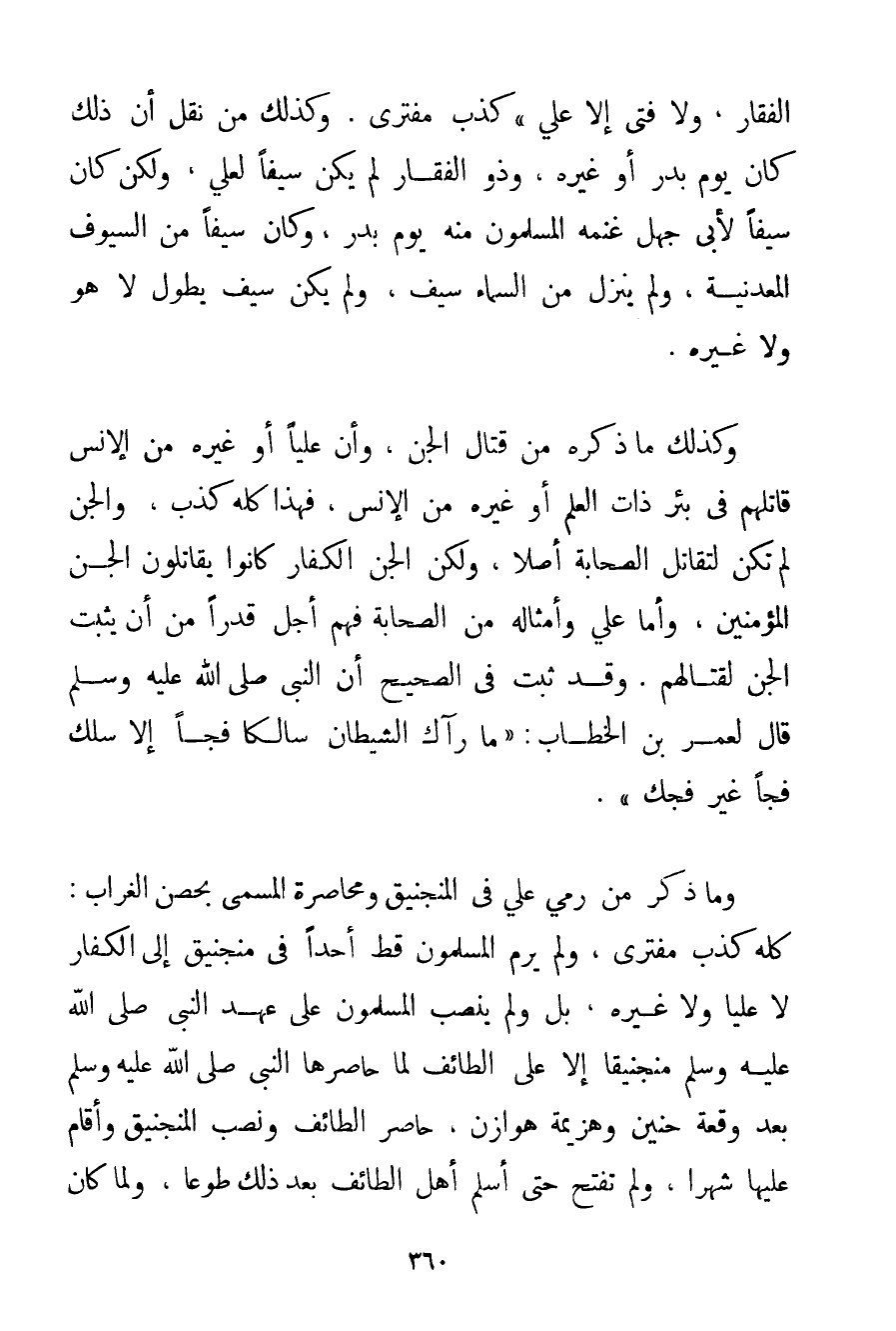 الْفَقَارِ وَلَا فَتَى إلَّا عَلِيٌّ " كَذِبٌ مُفْتَرًى. وَكَذَلِكَ مَنْ نَقَلَ أَنَّ ذَلِكَ كَانَ يَوْمَ بَدْرٍ أَوْ غَيْرَهُ وَذُو الْفَقَارِ لَمْ يَكُنْ سَيْفًا لِعَلِيِّ وَلَكِنْ كَانَ سَيْفًا لِأَبِي جَهْلٍ غَنِمَهُ الْمُسْلِمُونَ مِنْهُ يَوْمَ بَدْرٍ وَكَانَ سَيْفًا مِنْ السُّيُوفِ الْمَعْدِنِيَّةِ وَلَمْ يَنْزِلْ مِنْ السَّمَاءِ سَيْفٌ وَلَمْ يَكُنْ سَيْفٌ يَطُولُ لَا هُوَ وَلَا غَيْرُهُ. وَكَذَلِكَ مَا ذَكَرَهُ مِنْ قِتَالِ الْجِنِّ وَأَنَّ عَلِيًّا أَوْ غَيْرَهُ مِنْ الْإِنْسِ قَاتَلَهُمْ فِي بِئْرِ ذَاتِ العلم أَوْ غَيْرِهِ مِنْ الْإِنْسِ فَهَذَا كُلُّهُ كَذِبٌ وَالْجِنُّ لَمْ تَكُنْ لِتُقَاتِلَ الصَّحَابَةَ أَصْلًا وَلَكِنَّ الْجِنَّ الْكُفَّارَ كَانُوا يُقَاتِلُونَ الْجِنَّ الْمُؤْمِنِينَ وَأَمَّا عَلِيٌّ وَأَمْثَالُهُ مِنْ الصَّحَابَةِ فَهُمْ أَجَلُّ قَدْرًا مِنْ أَنْ يَثْبُتَ الْجِنُّ لِقِتَالِهِمْ. وَقَدْ ثَبَتَ فِي الصَّحِيحِ {أَنَّ النَّبِيَّ صَلَّى اللَّهُ عَلَيْهِ وَسَلَّمَ قَالَ لِعُمَرِ بْنِ الْخَطَّابِ: مَا رَآك الشَّيْطَانُ سَالِكًا فَجًّا إلَّا سَلَكَ فَجًّا غَيْرَ فَجِّك} . وَمَا ذُكِرَ مِنْ رَمْيِ عَلِيٍّ فِي الْمَنْجَنِيقِ وَمُحَاصَرَةِ الْمُسَمَّى بِحِصْنِ الْغُرَابِ: كُلُّهُ كَذِبٌ مُفْتَرًى وَلَمْ يَرْمِ الْمُسْلِمُونَ قَطُّ أَحَدًا فِي مَنْجَنِيقٍ إلَى الْكُفَّارِ لَا عَلِيًّا وَلَا غَيْرَهُ بَلْ وَلَمْ يَنْصِبْ الْمُسْلِمُونَ عَلَى عَهْدِ النَّبِيِّ صَلَّى اللَّهُ عَلَيْهِ وَسَلَّمَ مَنْجَنِيقًا إلَّا عَلَى الطَّائِفِ لَمَّا حَاصَرَهَا النَّبِيُّ صَلَّى اللَّهُ عَلَيْهِ وَسَلَّمَ بَعْدَ وَقْعَةِ حنين وَهَزِيمَةِ هَوَازِنَ حَاصَرَ الطَّائِفَ وَنَصَبَ الْمَنْجَنِيقَ وَأَقَامَ عَلَيْهَا شَهْرًا وَلَمْ تُفْتَحْ حَتَّى أَسْلَمَ أَهْلُ الطَّائِفِ بَعْدَ ذَلِكَ طَوْعًا وَلَمَّا كَانَ