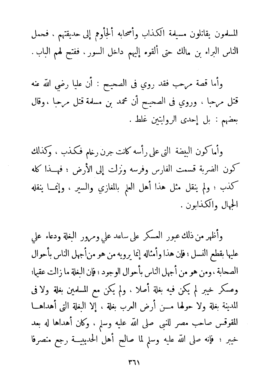 الْمُسْلِمُونَ يُقَاتِلُونَ مُسَيْلِمَةَ الْكَذَّابَ وَأَصْحَابَهُ أَلْجَئُوهُمْ إلَى حَدِيقَتِهِمْ فَحَمَلَ النَّاسُ الْبَرَاءَ بْنَ مَالِكٍ حَتَّى أَلْقَوْهُ إلَيْهِمْ دَاخِلَ السُّورِ فَفَتَحَ لَهُمْ الْبَابَ. وَأَمَّا قِصَّةُ مَرْحَبٍ فَقَدْ رُوِيَ فِي الصَّحِيحِ: أَنَّ عَلِيًّا رَضِيَ اللَّهُ عَنْهُ قَتَلَ مَرْحَبًا وَرُوِيَ فِي الصَّحِيحِ أَنَّ مُحَمَّدَ بْنَ مسلمة قَتَلَ مَرْحَبًا وَقَالَ بَعْضُهُمْ: بَلْ إحْدَى الرِّوَايَتَيْنِ غَلَطٌ. وَأَمَّا كَوْنُ الْبَيْضَةِ الَّتِي عَلَى رَأْسِهِ كَانَتْ جُرْنَ رُخَامٍ فَكَذِبٌ وَكَذَلِكَ كَوْنُ الضَّرْبَةِ قَسَمَتْ الْفَارِسَ وَفَرَسَهُ وَنَزَلَتْ إلَى الْأَرْضِ؛ فَهَذَا كُلُّهُ كَذِبٌ؛ وَلَمْ يَنْقُلْ مِثْلَ هَذَا أَهْلُ الْعِلْمِ بِالْمَغَازِي وَالسِّيَرِ وَإِنَّمَا يَنْقُلُهُ الْجُهَّالُ وَالْكَذَّابُونَ. وَأَظْهَرُ مِنْ ذَلِكَ عُبُورُ الْعَسْكَرِ عَلَى سَاعِدِ عَلِيٍّ وَمُرُورُ الْبَغْلَةِ وَدُعَاءُ عَلِيٍّ عَلَيْهَا بِقَطْعِ النَّسْلِ؛ فَإِنَّ هَذَا وَأَمْثَالَهُ إنَّمَا يَرْوِيه مَنْ هُوَ مِنْ أَجْهَلِ النَّاسِ بِأَحْوَالِ الصَّحَابَةِ وَمَنْ هُوَ مِنْ أَجْهَلِ النَّاسِ بِأَحْوَالِ الْوُجُودِ؛ فَإِنَّ الْبَغْلَةَ مَا زَالَتْ عَقِيمًا؛ وَعَسْكَرُ خَيْبَرَ لَمْ يَكُنْ فِيهِ بَغْلَةٌ أَصْلًا وَلَمْ يَكُنْ مَعَ الْمُسْلِمِينَ بَغْلَةٌ وَلَا فِي الْمَدِينَةِ بَغْلَةٌ وَلَا حَوْلَهَا مِنْ أَرْضِ الْعَرَبِ بَغْلَةٌ إلَّا الْبَغْلَةَ الَّتِي أَهْدَاهَا الْمُقَوْقِسُ صَاحِبُ مِصْرَ لِلنَّبِيِّ صَلَّى اللَّهُ عَلَيْهِ وَسَلَّمَ وَكَانَ أَهْدَاهَا لَهُ بَعْدَ خَيْبَرَ؛ فَإِنَّهُ صَلَّى اللَّهُ عَلَيْهِ وَسَلَّمَ لَمَّا صَالَحَ أَهْلَ الْحُدَيْبِيَةِ رَجَعَ مُنْصَرِفًا