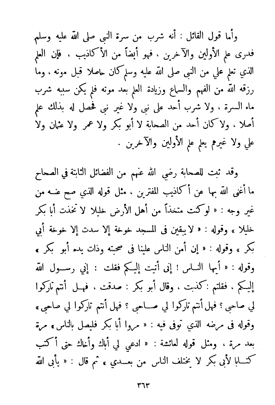 وَأَمَّا قَوْلُ الْقَائِلِ: أَنَّهُ شَرِبَ مِنْ سُرَّةِ النَّبِيِّ صَلَّى اللَّهُ عَلَيْهِ وَسَلَّمَ فَدَرَى عِلْمَ الْأَوَّلِينَ والآخرين فَهُوَ أَيْضًا مِنْ الْأَكَاذِيبِ فَإِنَّ الْعِلْمَ الَّذِي تَعَلَّمَ عَلِيٌّ مِنْ النَّبِيِّ صَلَّى اللَّهُ عَلَيْهِ وَسَلَّمَ كَانَ حَاصِلًا قَبْلَ مَوْتِهِ وَمَا رَزَقَهُ اللَّهُ مِنْ الْفَهْمِ وَالسَّمَاعِ وَزِيَادَةِ الْعِلْمِ بَعْدَ مَوْتِهِ فَلَمْ يَكُنْ سَبَبُهُ شُرْبَ مَاءِ السُّرَّةِ وَلَا شُرْبَ أَحَدٍ عَلَى نَبِيٍّ وَلَا غَيْرِ نَبِيٍّ فَحَصَلَ لَهُ بِذَلِكَ عِلْمٌ أَصْلًا وَلَا كَانَ أَحَدٌ مِنْ الصَّحَابَةِ لَا أَبُو بَكْرٍ وَلَا عُمَرُ وَلَا عُثْمَانُ وَلَا عَلِيٌّ وَلَا غَيْرُهُمْ يَعْلَمُ عِلْمَ الْأَوَّلِينَ والآخرين. وَقَدْ ثَبَتَ لِلصَّحَابَةِ رَضِيَ اللَّهُ عَنْهُمْ مِنْ الْفَضَائِلِ الثَّابِتَةِ فِي الصِّحَاحِ مَا أَغْنَى اللَّهُ بِهَا عَنْ أَكَاذِيبِ الْمُفْتَرِينَ مِثْلَ قَوْلِهِ الَّذِي صَحَّ عَنْهُ مِنْ غَيْرِ وَجْهٍ: {لَوْ كُنْت مُتَّخِذًا مِنْ أَهْلِ الْأَرْضِ خَلِيلًا لَاِتَّخَذْت أَبَا بَكْرٍ خَلِيلًا} وَقَوْلِهِ: {لَا يَبْقَيْنَ فِي الْمَسْجِدِ خَوْخَةٌ إلَّا سُدَّتْ إلَّا خَوْخَةُ أَبِي بَكْرٍ} وَقَوْلِهِ: {إنَّ آمَنَ النَّاسِ عَلَيْنَا فِي صُحْبَتِهِ وَذَاتِ يَدِهِ أَبُو بَكْرٍ} وَقَوْلِهِ: {أَيُّهَا النَّاسُ إنِّي أَتَيْت إلَيْكُمْ فَقُلْت: إنِّي رَسُولُ اللَّهِ إلَيْكُمْ فَقُلْتُمْ: كَذَبْت وَقَالَ أَبُو بَكْرٍ: صَدَقْت فَهَلْ أَنْتُمْ تَارِكُوا لِي صَاحِبِي؟ فَهَلْ أَنْتُمْ تَارِكُوا لِي صَاحِبِي؟ فَهَلْ أَنْتُمْ تَارِكُوا لِي صَاحِبِي} وَقَوْلِهِ فِي مَرَضِهِ الَّذِي تُوُفِّيَ فِيهِ: {مُرُوا أَبَا بَكْرٍ فَلْيُصَلِّ بِالنَّاسِ} مَرَّةً بَعْدَ مَرَّةٍ وَمِثْلَ {قَوْلِهِ لِعَائِشَةَ: اُدْعِي لِي أَبَاك وَأَخَاك حَتَّى أَكْتُبَ كِتَابًا لِأَبِي بَكْرٍ لَا يَخْتَلِفُ النَّاسُ مِنْ بَعْدِي ثُمَّ قَالَ: يَأْبَى اللَّهُ